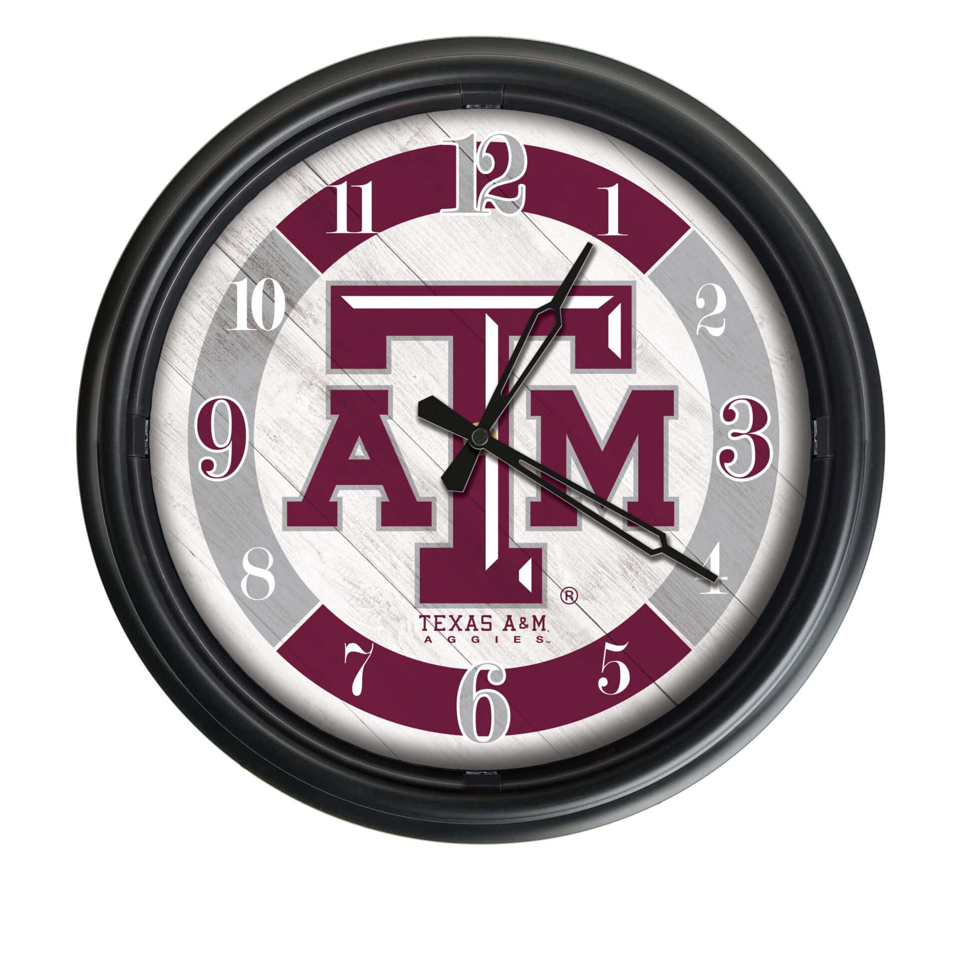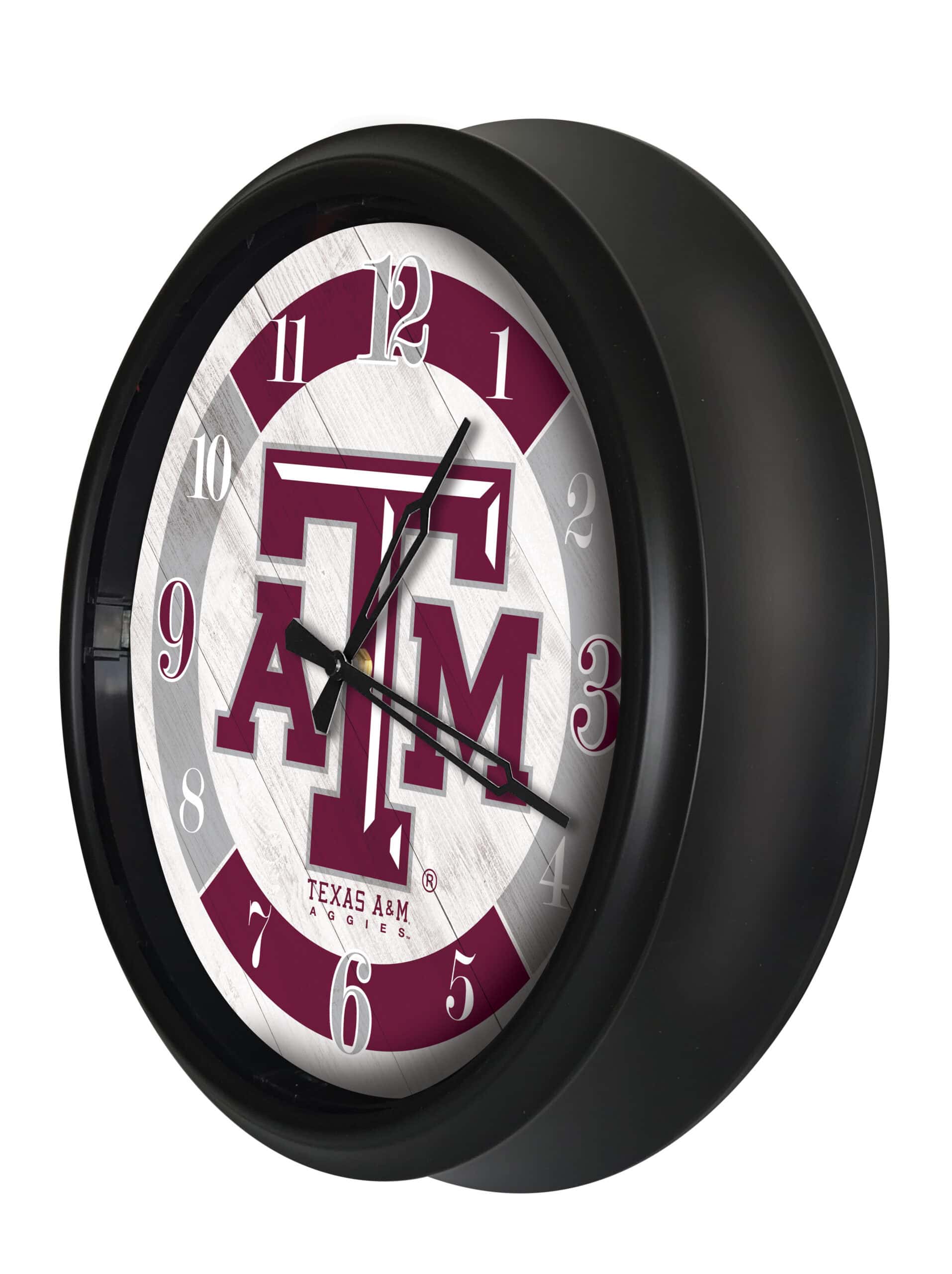 The Texas A&M 14-Inch Indoor/Outdoor LED Wall Clock in Black is the perfect accessory for showcasing your school pride. Designed for both indoor and outdoor use, this clock features a robust UV resistant casing and a weatherproof glass face lens, ensuring durability in various environments. The clock is enhanced with vibrant artwork that is digitally printed with UV inks for long-lasting color. With its automatic LED illumination, the clock face lights up in low light conditions, providing clear visibility at any time of day. Enjoy precise timekeeping powered by an accurate quartz movement, making this clock a stylish and functional addition to any space.