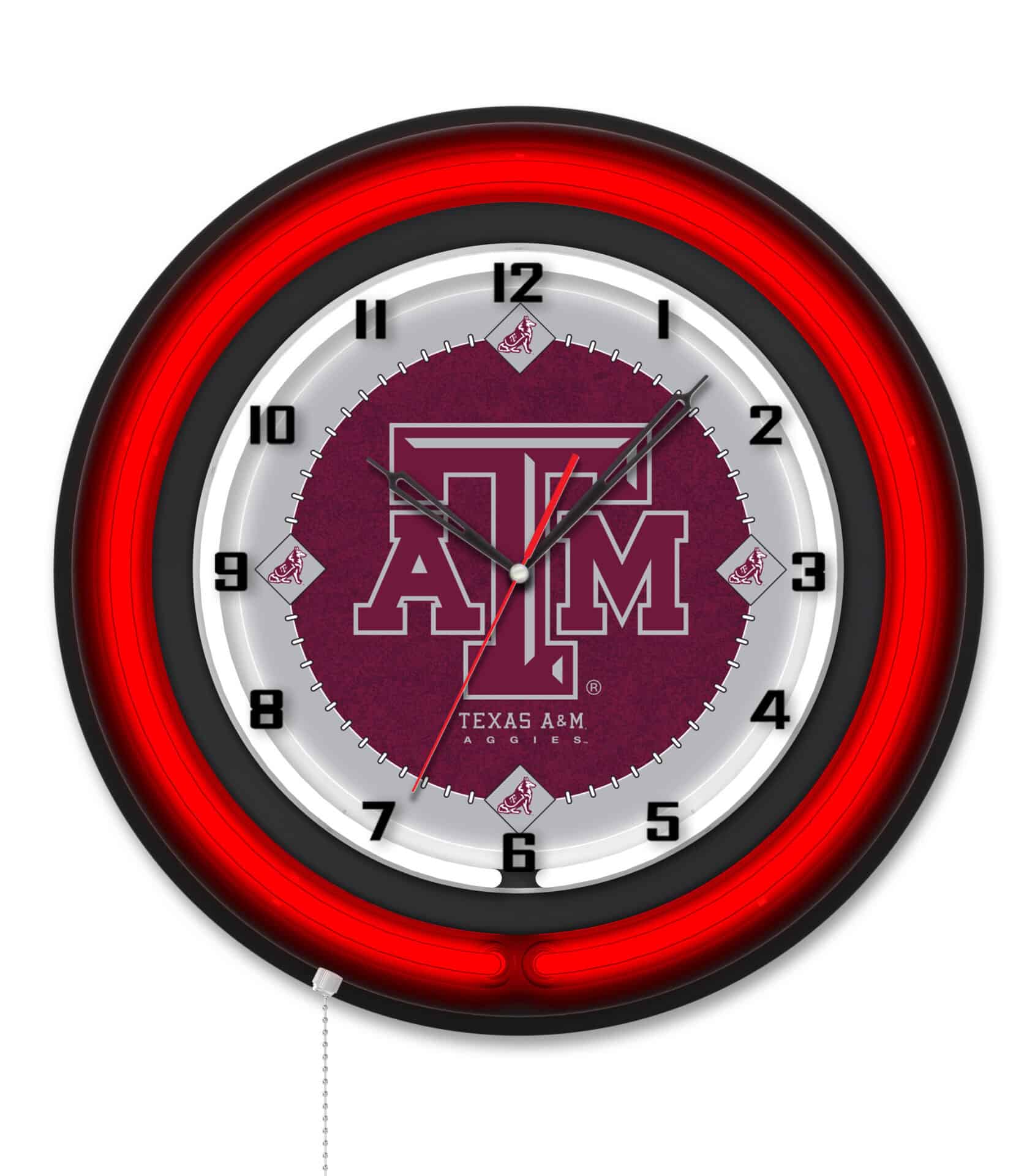 The “Texas A&M 19-Inch Neon Logo Clock in Black is an impressive addition to any man cave, showcasing your school pride with its vibrant design and functional features. Featuring a sturdy black casing and a neon outer ring in team colors, this clock is designed to stand out. The brilliant white inner neon ring illuminates the custom printed clock face, making it a striking centerpiece. The neon lights can be easily turned on and off with a pull chain, while the clock itself operates on a single AA battery for accurate timekeeping. This clock is perfect for gifts or personal use, ensuring that your space reflects your passion for your favorite team.