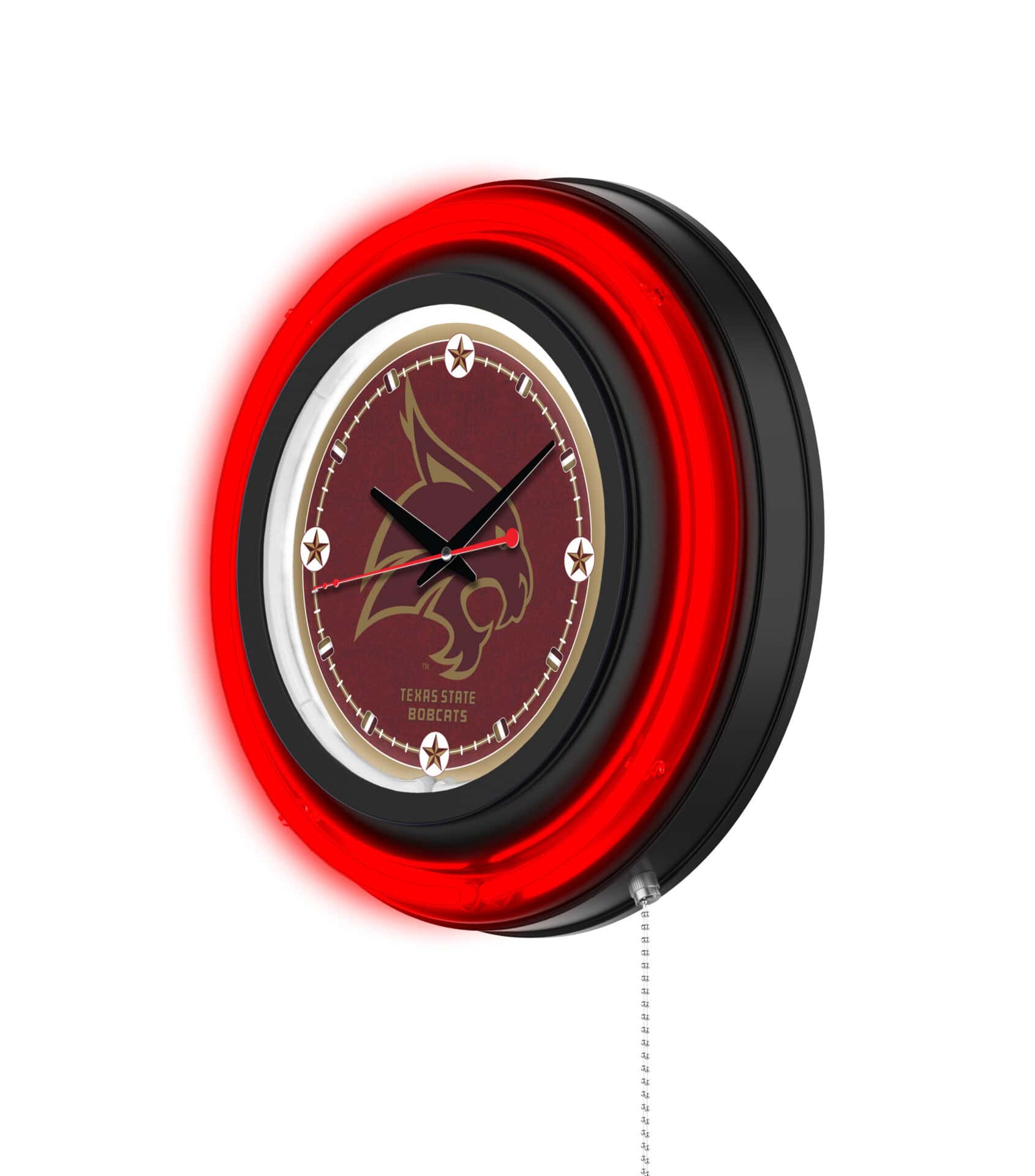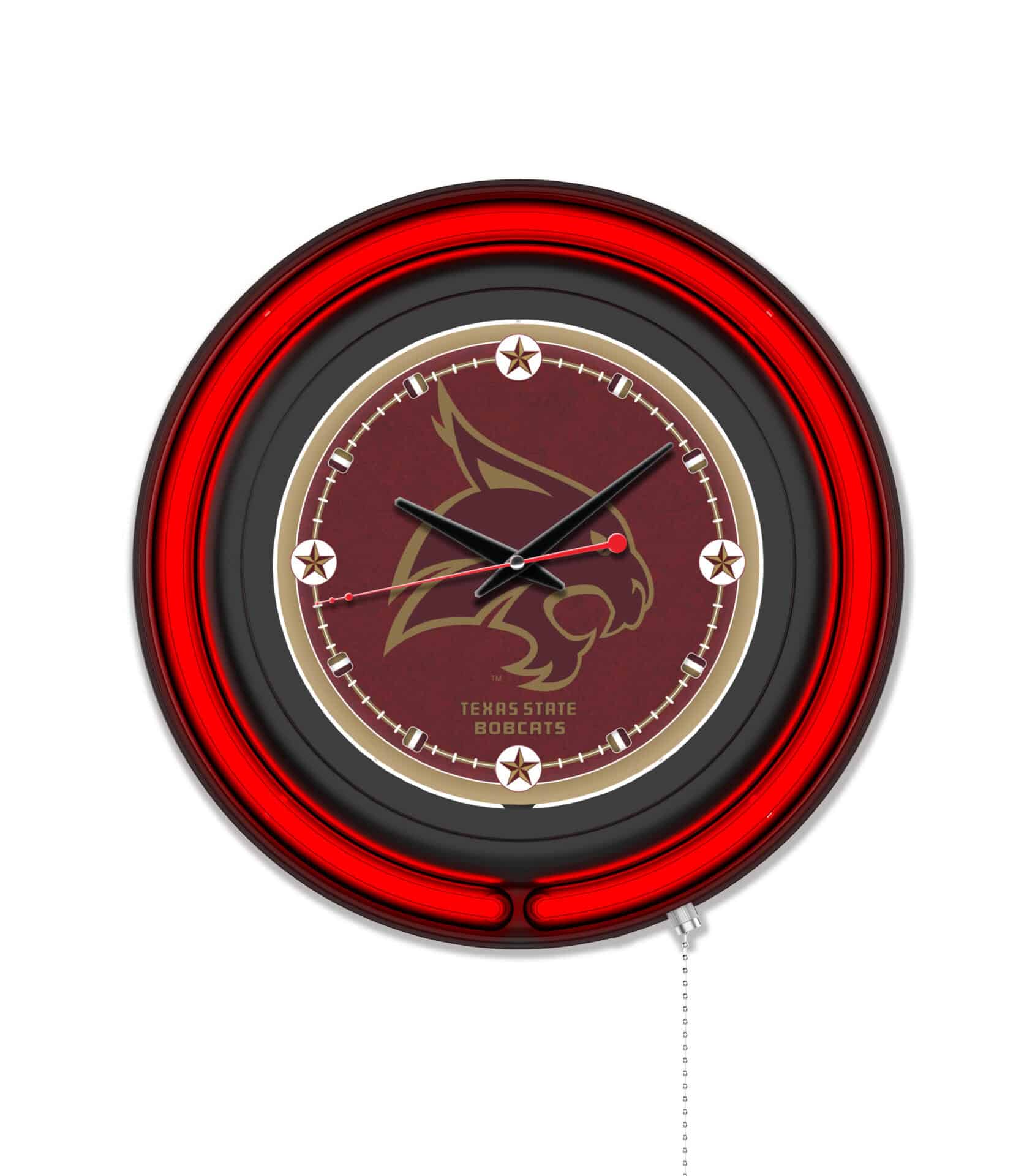 The Texas State University 15-Inch Neon Logo Clock in Black is the perfect addition to any fan’s collection. Show off your school pride with this stunning clock that features a sleek black casing and vibrant team colors. The brilliant white neon inner ring beautifully illuminates the custom printed clock face, making it an eye-catching piece for any man cave or game room. The neon rings are easily operated with a convenient pull chain, allowing you to turn them on and off effortlessly. Designed for both style and accuracy, this clock utilizes precise quartz movement and is powered by a single AA battery (not included), ensuring you always have the right time. Whether you’re gifting it to a recent graduate or treating yourself, this clock is a great way to celebrate your alma mater.