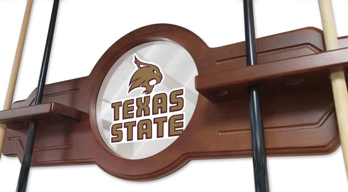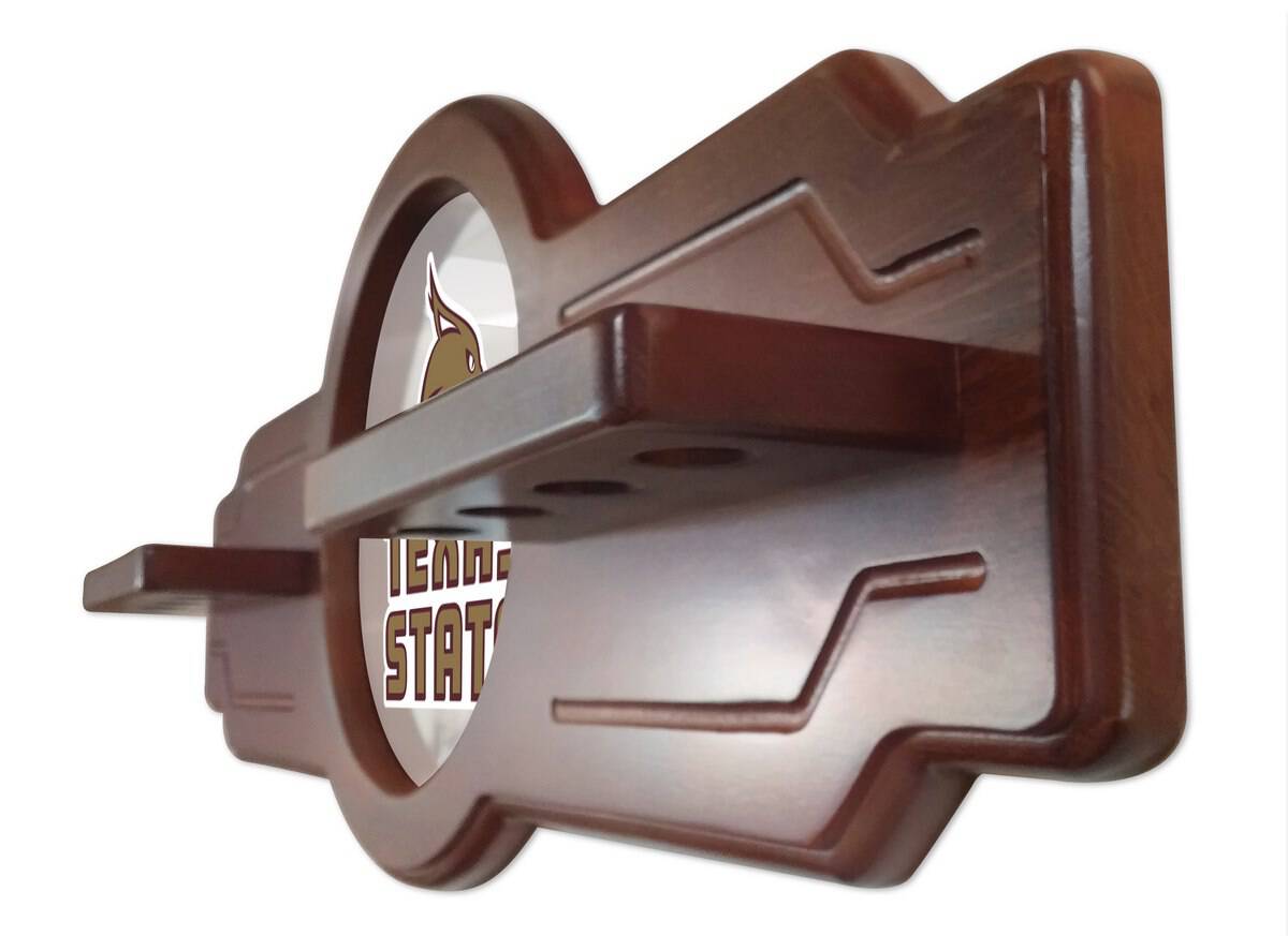 Elevate your game room with this premium Texas State University Navajo Logo Cue Rack. Designed for serious pool enthusiasts, this exceptional cue rack combines functionality and style, providing a secure and elegant solution for storing and displaying your pool cues. Crafted with meticulous attention to detail, this rack offers superior quality and protection for your valuable pool equipment.
