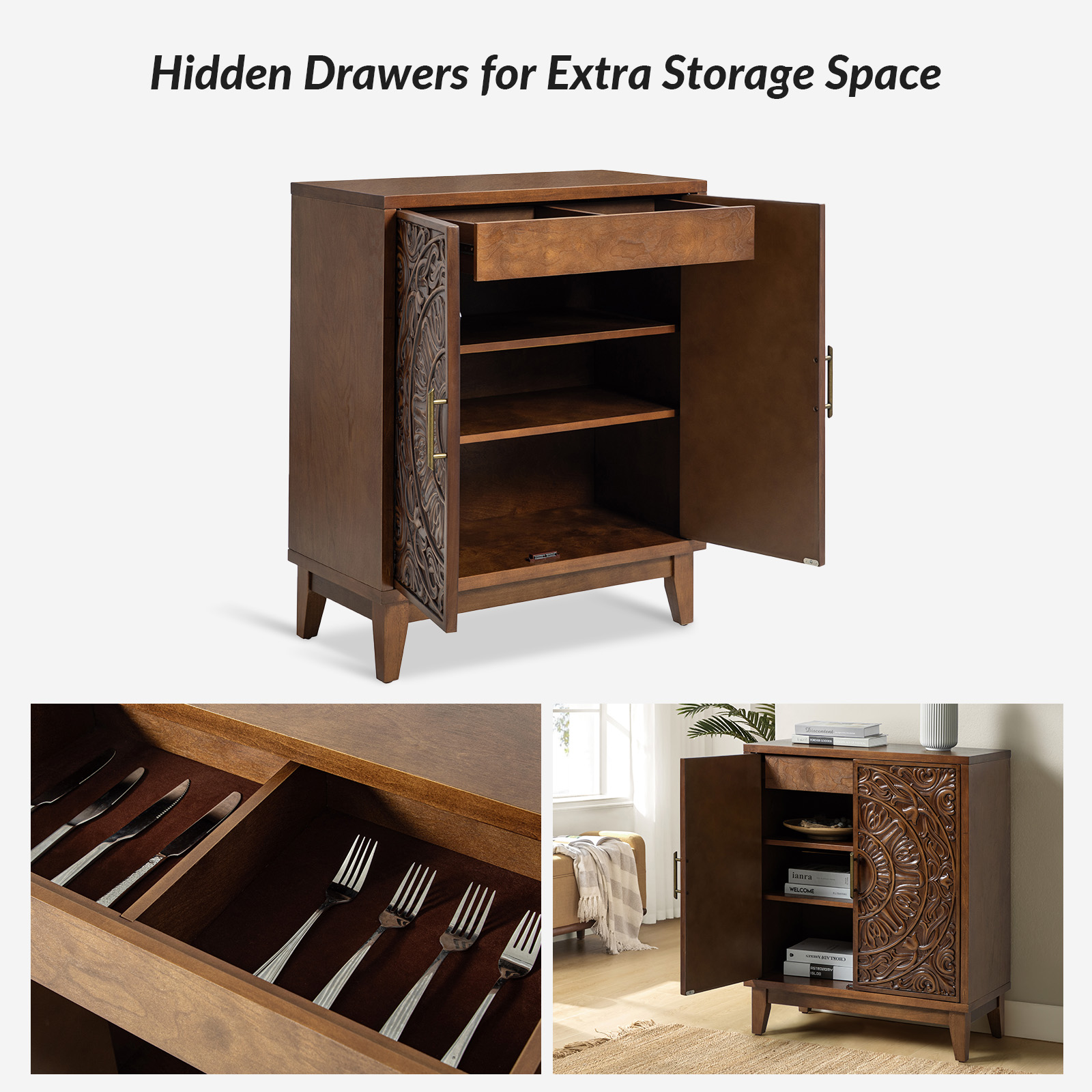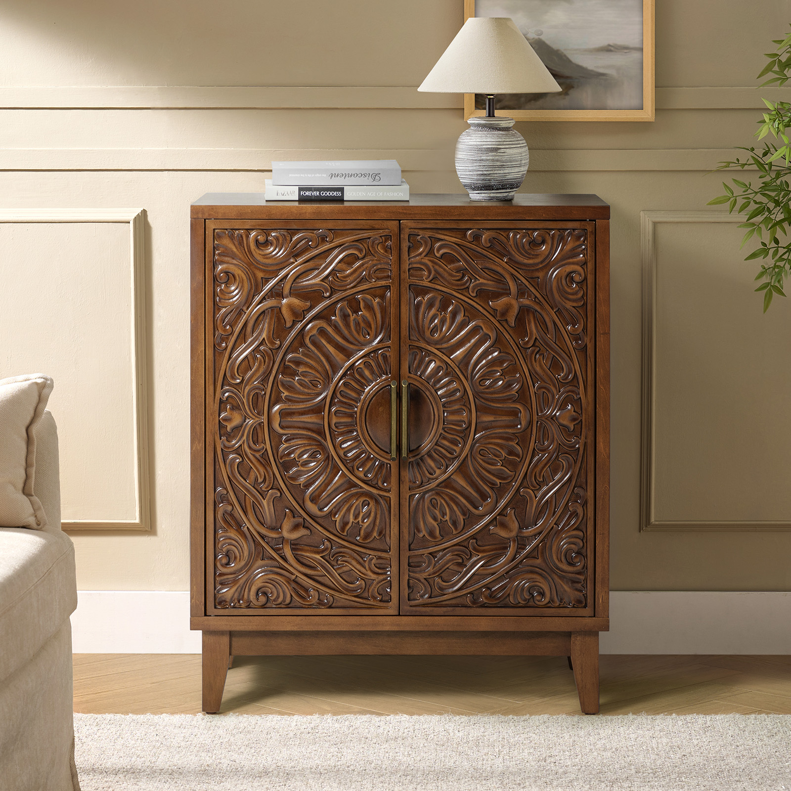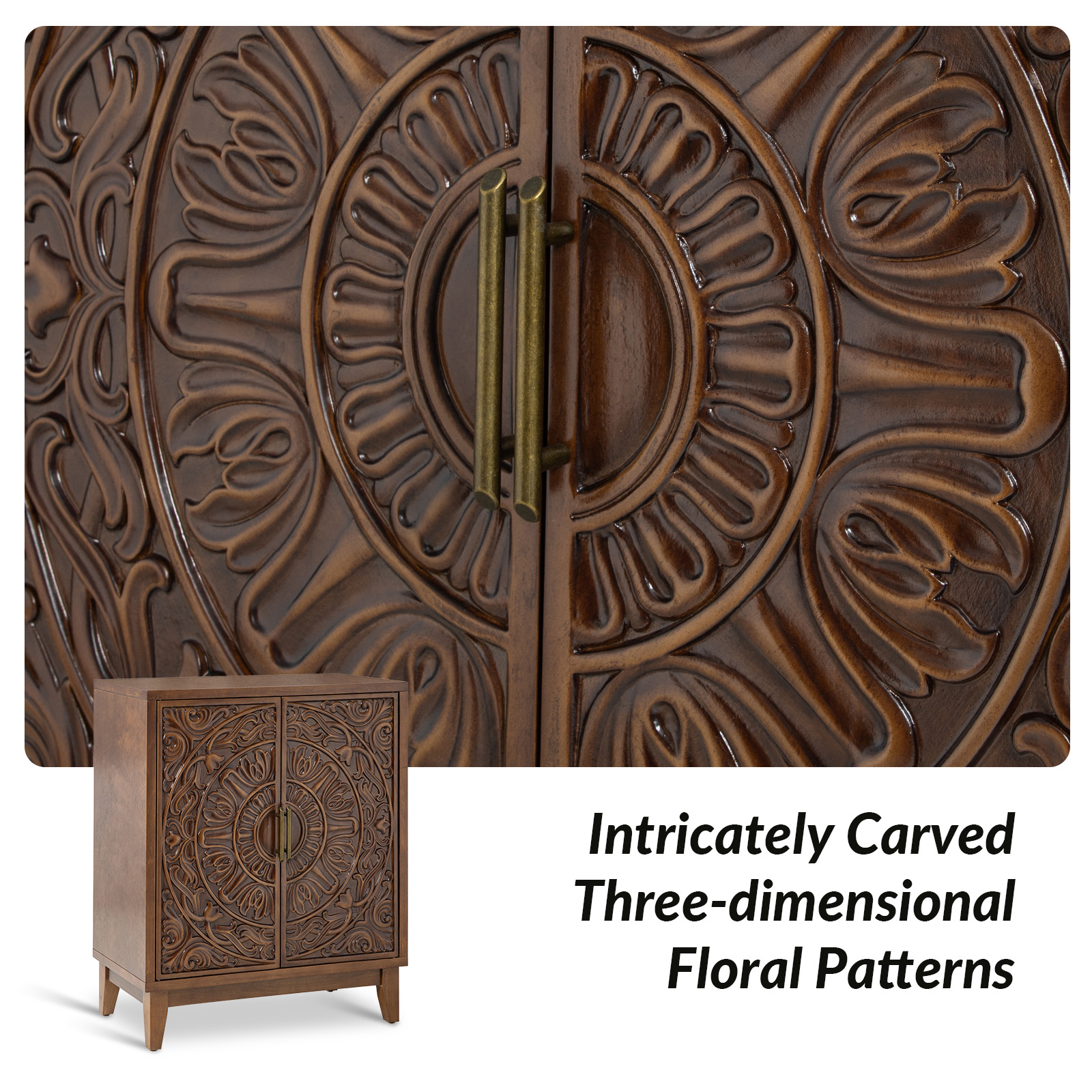The Thea Walnut Carved Floral Solid Wood Accent Cabinet brings vintage charm to any room. This classic cabinet features intricate, three-dimensional floral carvings and a distressed finish, creating an antique-inspired aesthetic. Beyond its beautiful exterior, it offers ample storage space for discreet organization. Use it as a TV stand or sideboard, taking advantage of the pre-drilled wire management hole.