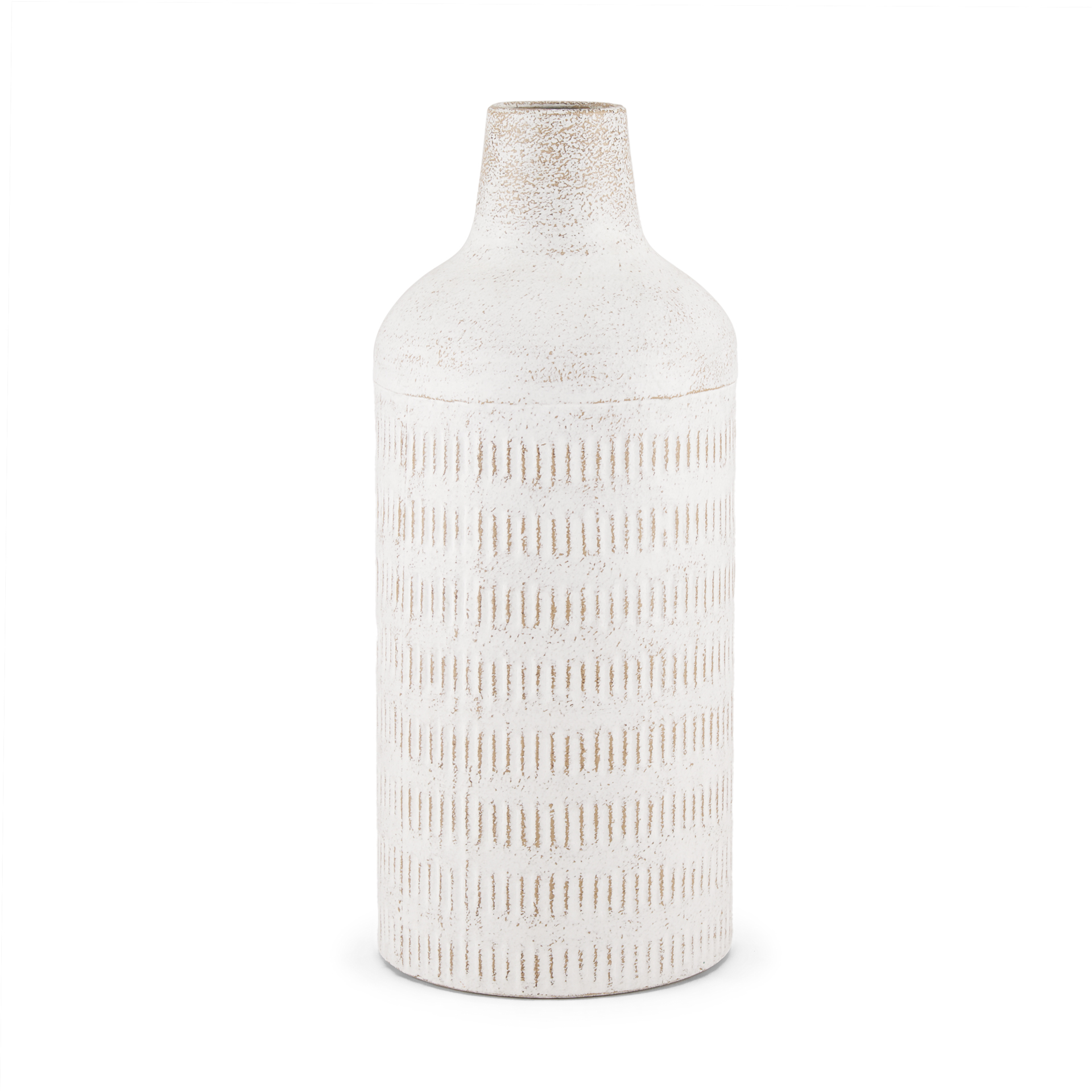 Enhance your man cave with the Tisha Large White Vase. Crafted from lightweight metal, this vase features a white finish with terracotta distressing, giving it a timeless, aged look. The engraved pattern adds texture and visual interest. This vase is perfect as a standalone decor piece or to display dried or artificial botanical arrangements. Please note, this vase is not watertight. Dimensions: 5.9″L x 5.9″W x 14.2″H. Weight: 2.2 lbs. Add a touch of understated elegance to your space today!