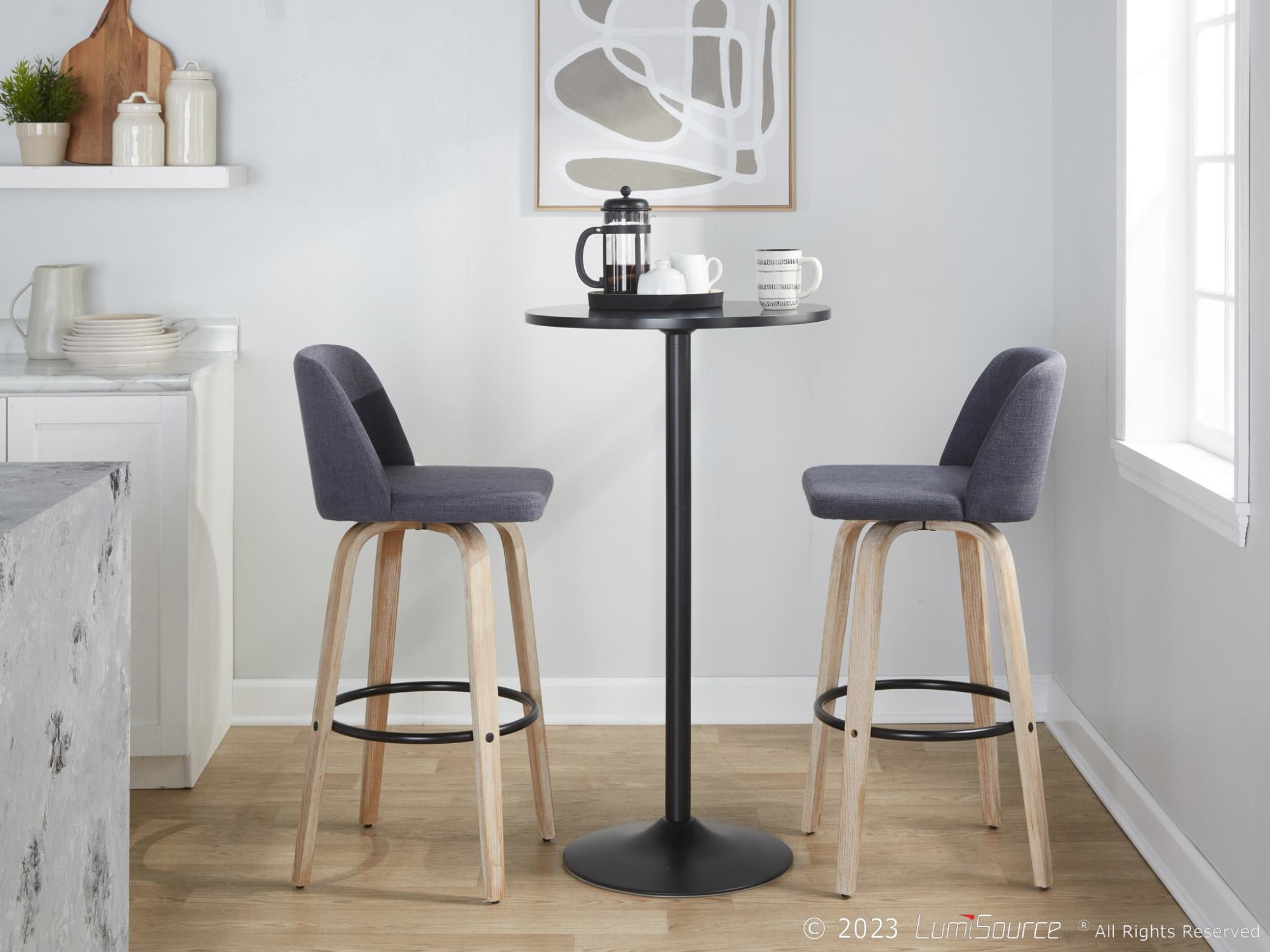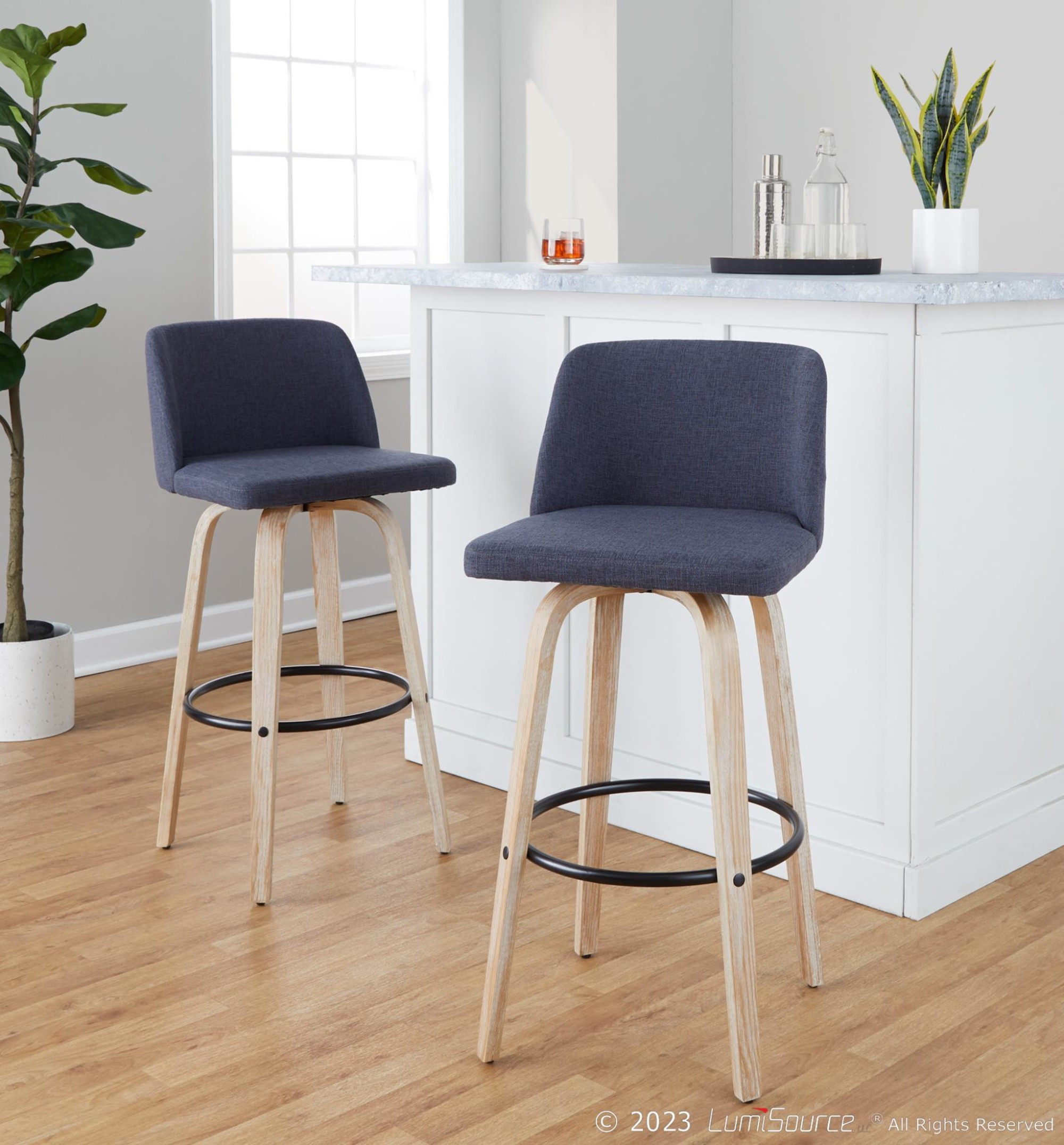 Upgrade your man cave with the Toriano 24-Inch Blue Contemporary Swivel Barstools. These barstools offer modern style and are sold in pairs. Each stool features a fixed bar height with a 360-degree swivel, perfect for keeping an eye on the game or chatting with buddies. Enjoy the cushioned backrest and seat upholstered in blue fabric, providing comfort and support. The bent wood legs offer a sturdy base, with a round black metal footrest for added relaxation. Bring a touch of contemporary design to your bar area, game room, or home office with these stylish and functional barstools. Assembly Required. Material: Polyester Fabric, Foam, Steel, Bent Wood. Dimensions: 22″L × 22″W × 39″H. Weight limit: 250 lbs. (each).