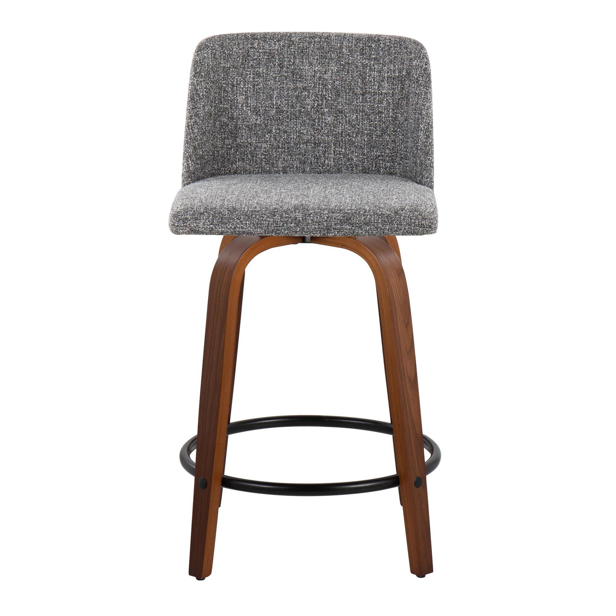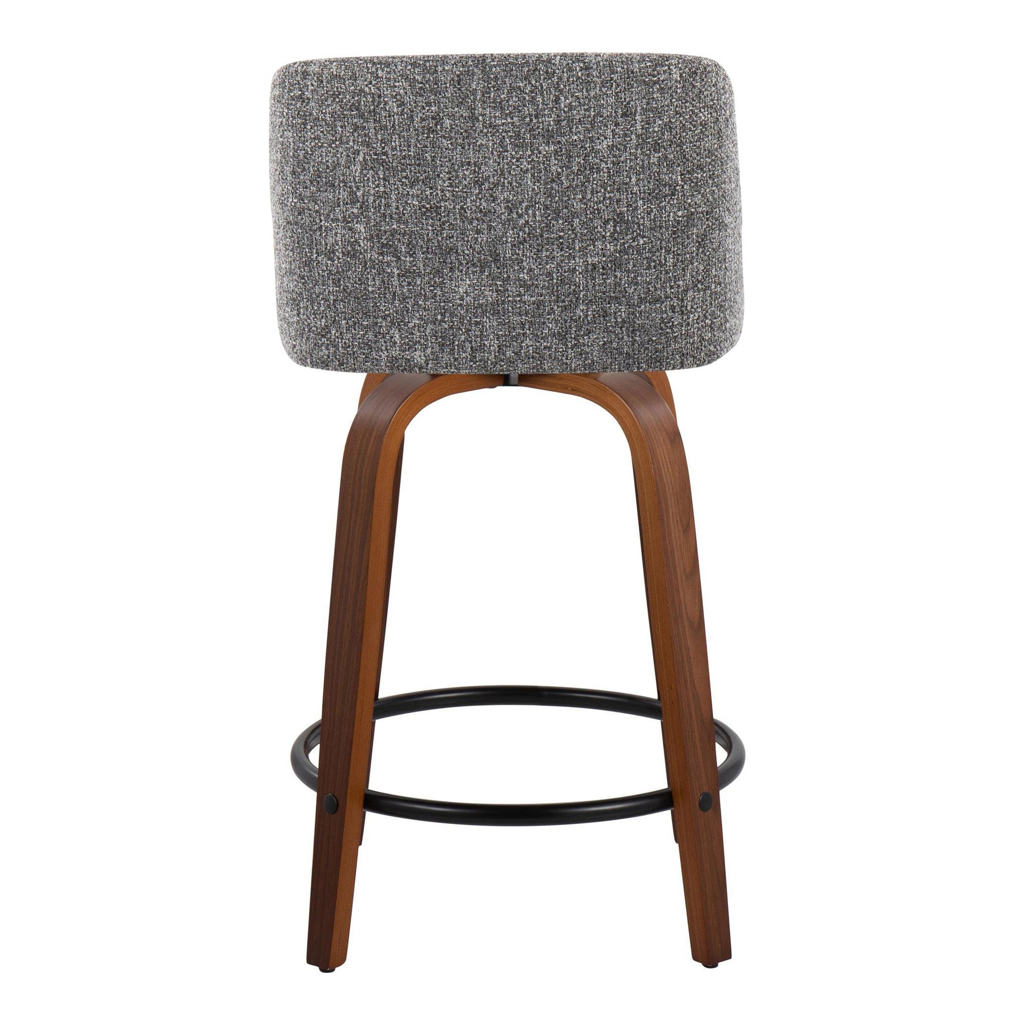 The Toriano 24-Inch Grey Mid-Century Modern Counter Stools offer a blend of comfort and style. These stools feature a padded, upholstered swivel seat and fixed-height bent wood legs, complemented by a built-in footrest. The combination of materials and design creates an appealing look suitable for various spaces.