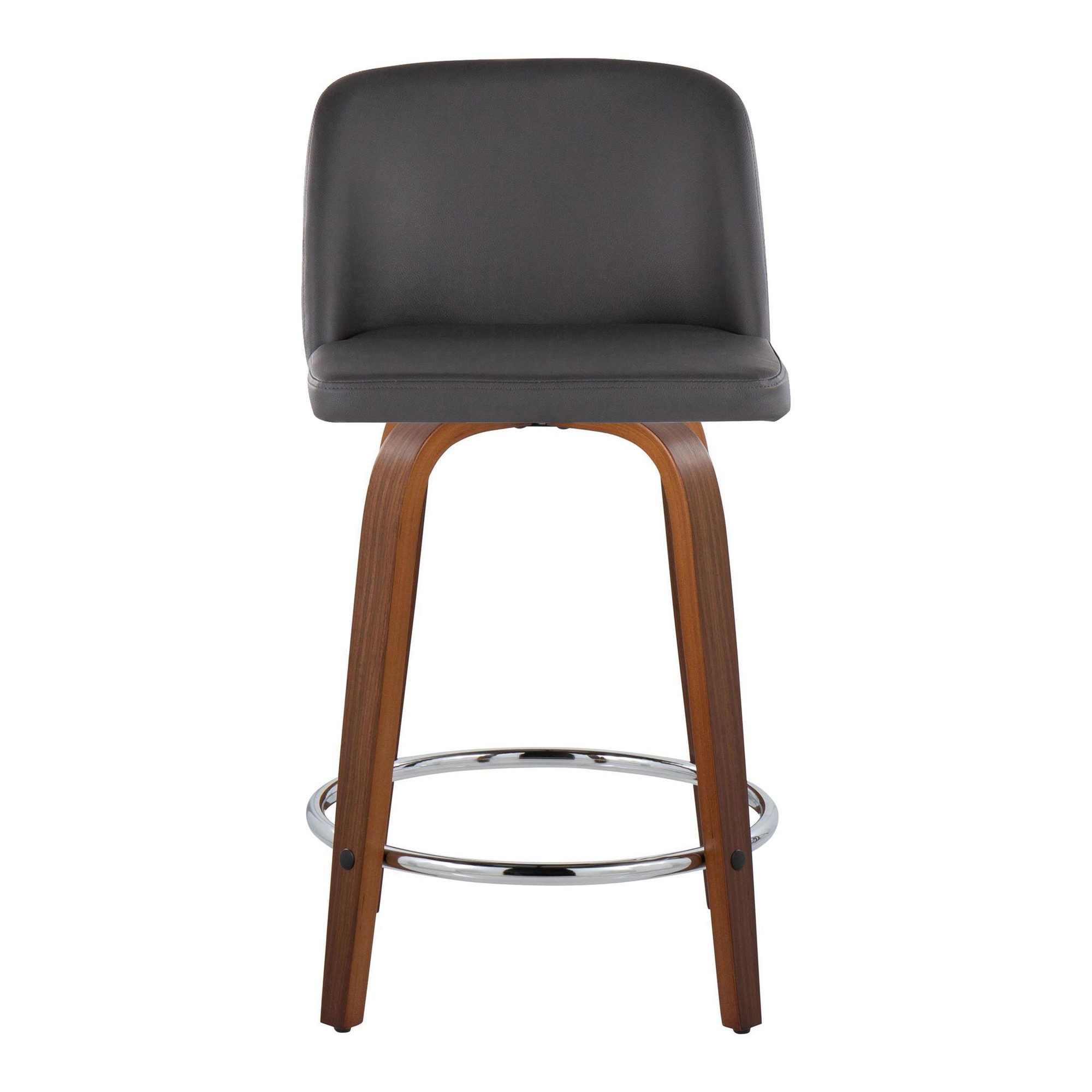 Add comfort and style to your man cave with the Toriano 24-Inch Mid-Century Modern Grey Swivel Counter Stools. These stools bring modern design and classic comfort to your bar or game room. The padded faux leather swivel seat offers a comfortable place to sit, while the built-in metal footrest adds extra support. The bent wood legs give these fixed counter height stools a touch of mid-century flair. They swivel 360 degrees for easy conversation and come in a set of two, perfect for sharing a drink and relaxing. Assembly is required. Weight limit: 250 lbs (each). Color: Walnut Wood, Grey PU, Chrome Metal. Material: PU Leather, Foam, Steel, Bent Wood.