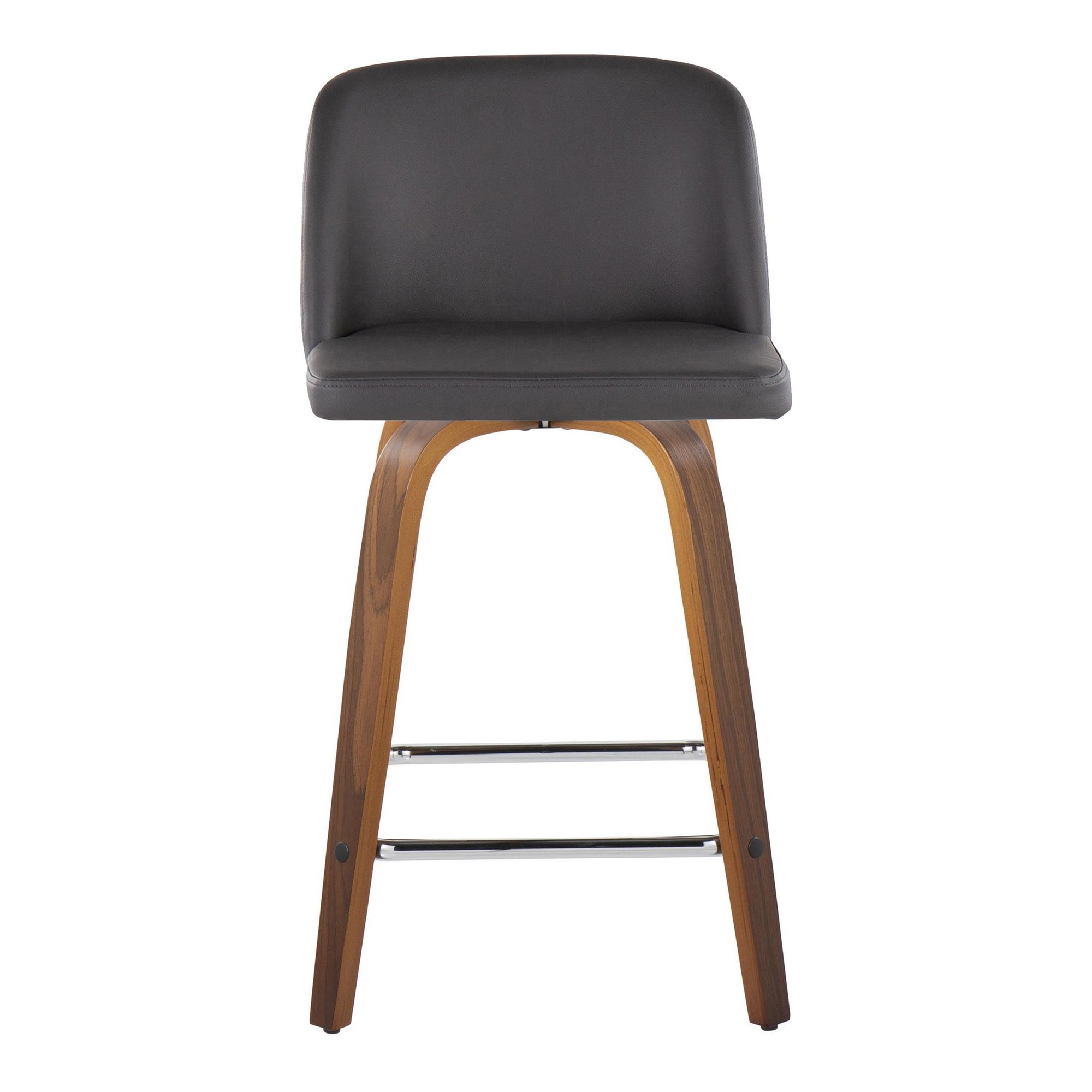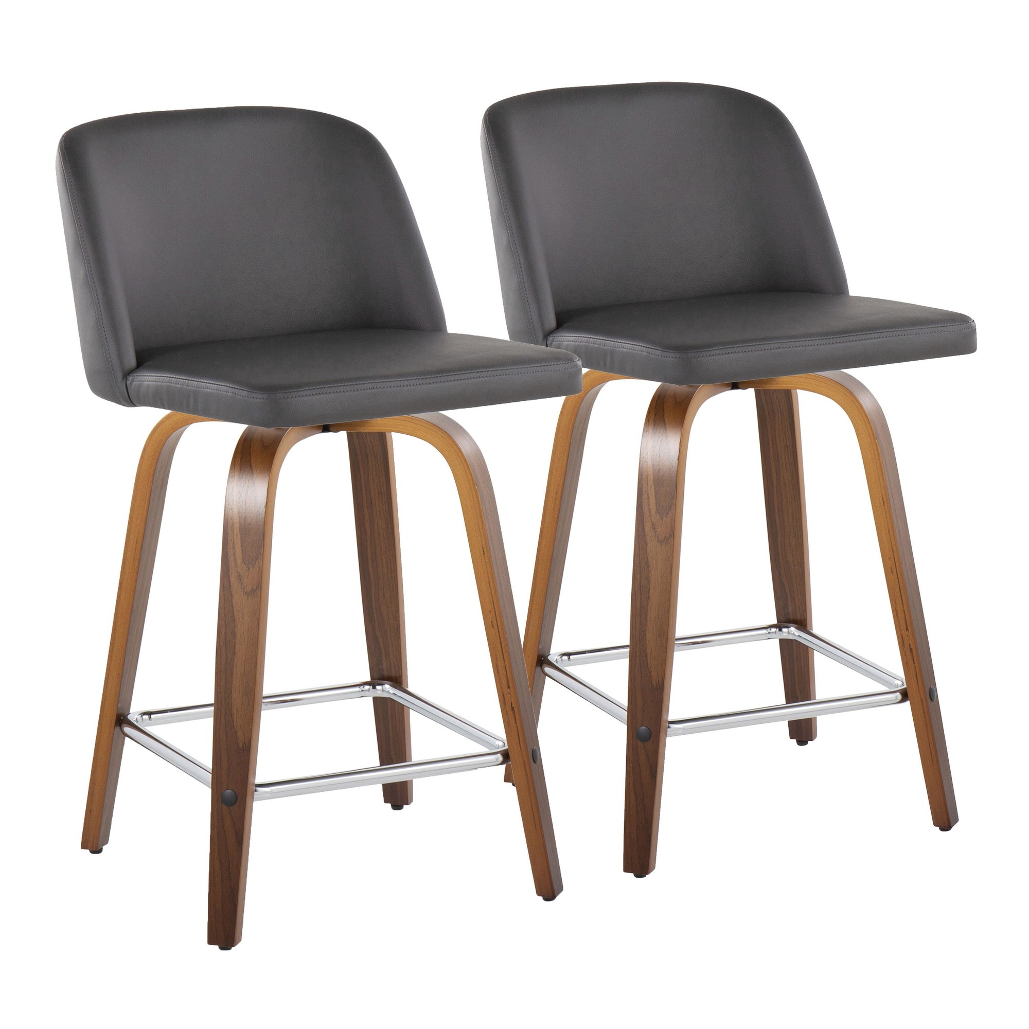 Add a touch of modern simplicity to your man cave with the Toriano 24 Mid-Century Modern Walnut Grey Swivel Stools. These fixed-height counter stools feature a padded and upholstered swivel seat for maximum comfort. The bent wood legs offer a classic look, while the built-in metal footrest provides added support. The seat-to-floor height is 24.25″, perfect for a counter-height setup. The mid-century modern styling, combined with the walnut wood, grey faux leather, and chrome metal, will upgrade your space. Each stool has a 250 lbs. weight limit and some assembly is required. They’re priced and sold in pairs, so you’ll have a matching set right out of the box!