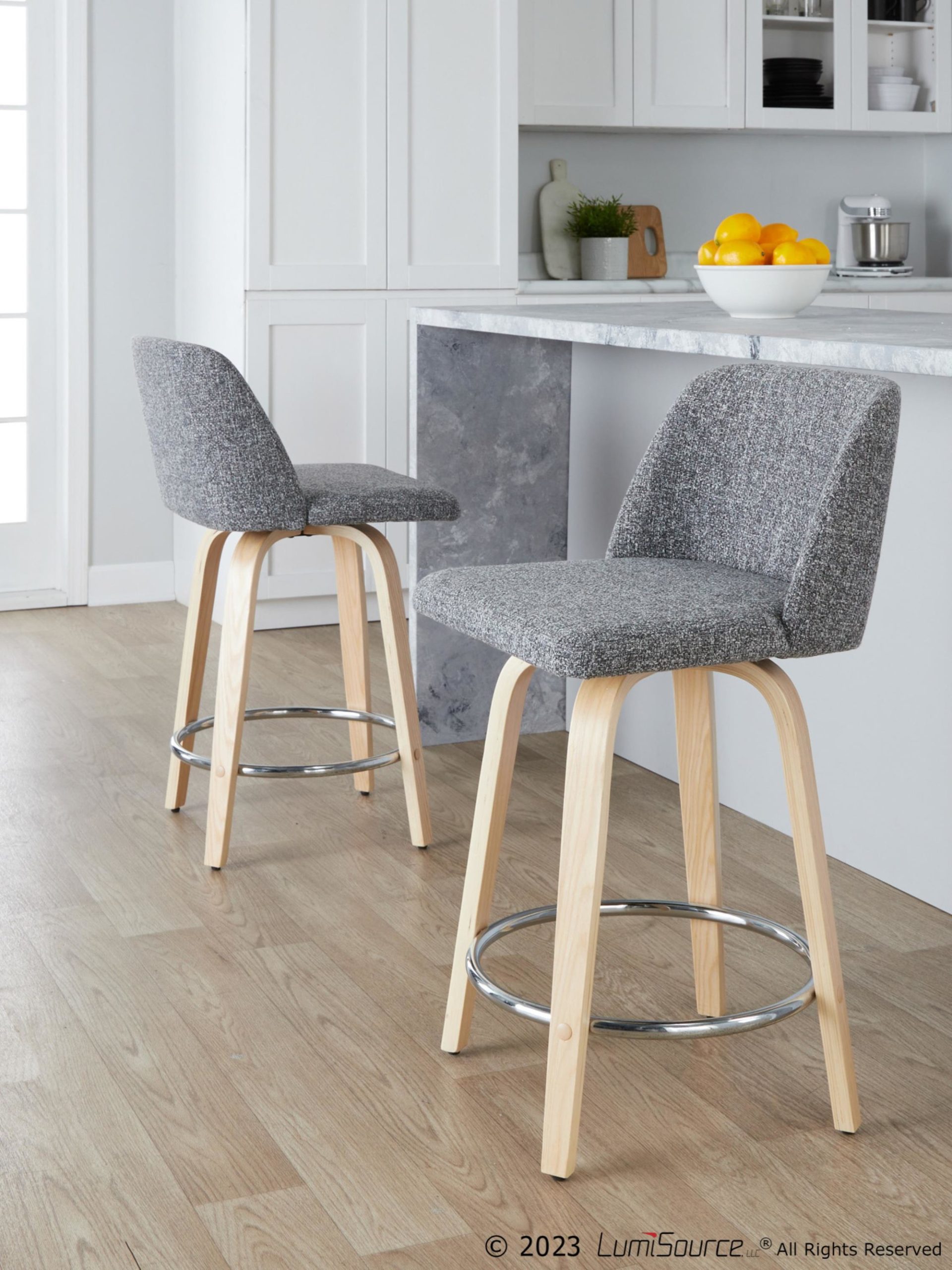 Add a touch of simple, modern style to your space with the Toriano 24″ Counter Stools. Their appealing design features a padded upholstered swivel seat for ultimate comfort. These stools have a fixed counter height and a 360-degree swivel, perfect for your bar or kitchen. The bent wood legs include a convenient round chrome metal footrest. Each stool measures 19″L × 17.5″W × 33.75″H with a seat depth of 16″ and a seat to floor height of 24.25″. Sold in pairs, these stools require assembly and support up to 250 lbs each. The materials are polyester fabric, foam, metal, and bent wood. Choose the color that best fits your space from options like natural wood and noise grey fabric. These stools are designed for indoor use only.