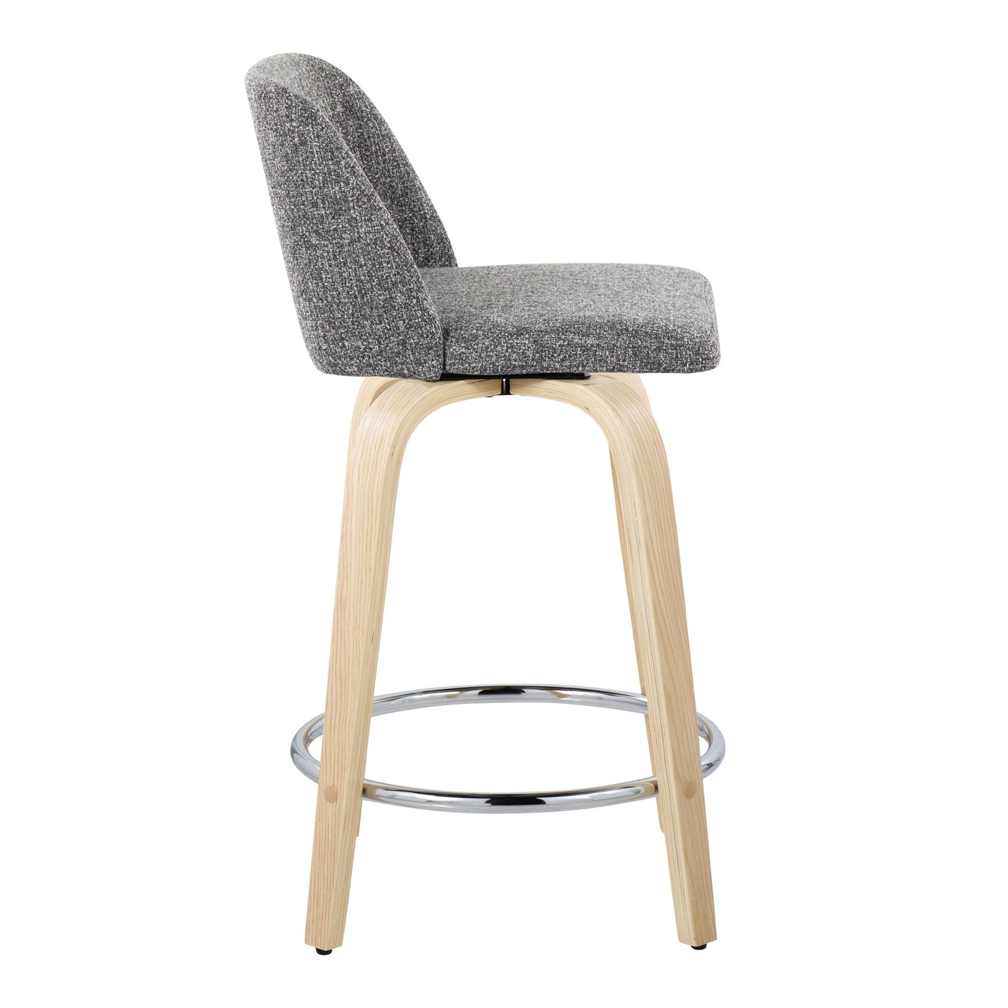 Elevate your home decor with these stools that feature a padded, upholstered swivel seat providing exceptional comfort and support. The bent wood legs, complemented by a round chrome metal footrest, add both stability and a touch of elegance. Available in a sophisticated natural wood and noise grey fabric color scheme, these stools are sure to complement your existing decor.