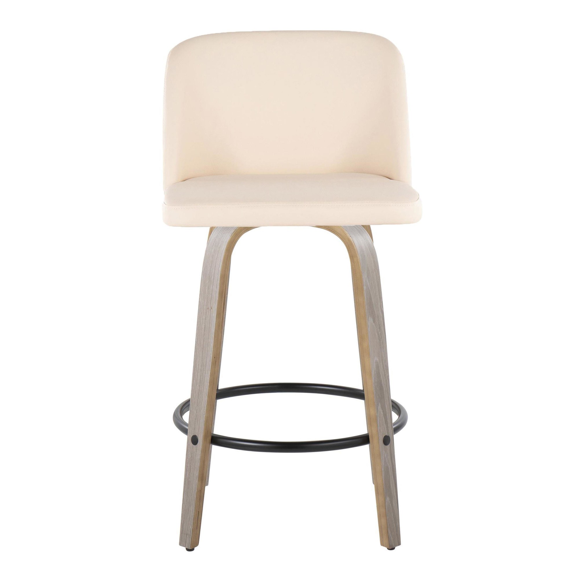 These stools not only provide a comfortable seating option but also add a touch of sophistication to your space. The 360-degree swivel function allows for easy movement, while the cushioned backrest ensures maximum comfort. The combination of light grey wood, cream faux leather, and black metal accents creates a visually appealing and versatile design that complements various interior styles.