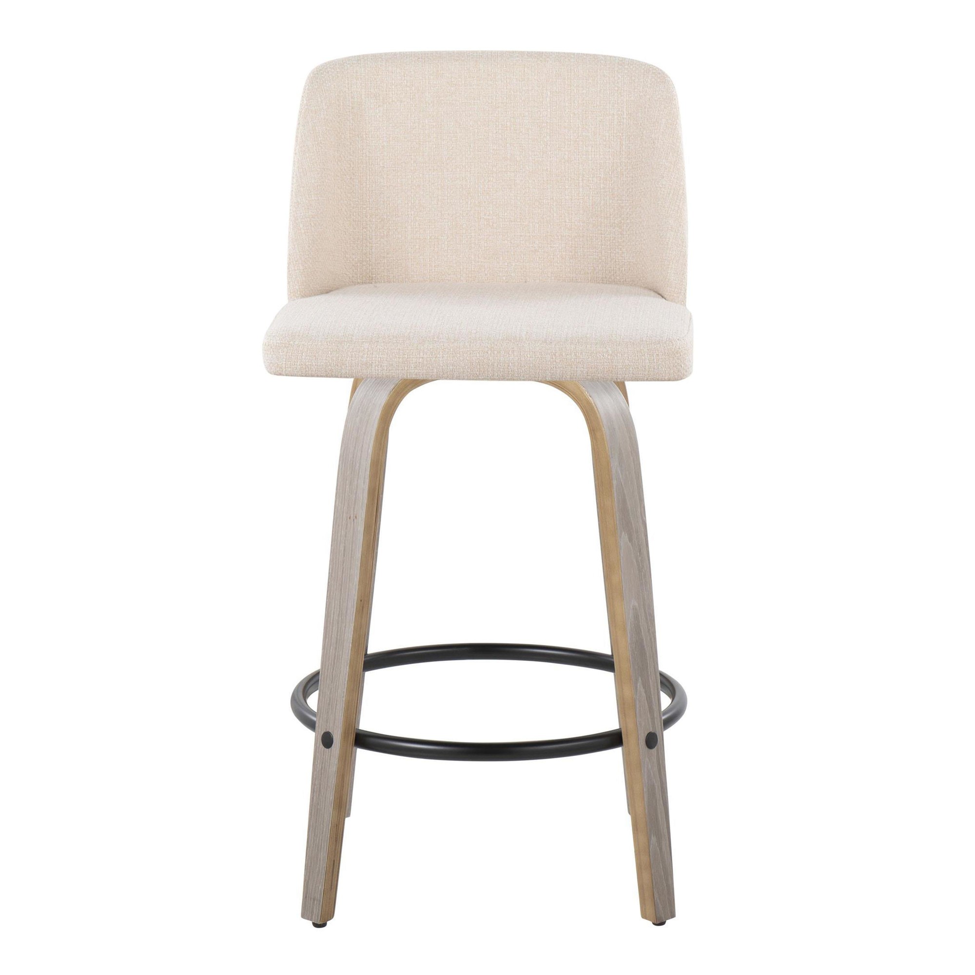 The Toriano Fixed-Height Counter Stools offer comfort and modern simplicity with classic lines. These stools feature a padded, upholstered swivel seat atop fixed-height bent wood legs, complete with a built-in footrest. Available in light grey and cream, these stools will suit any space. The 360-degree swivel and comfortable design make these counter stools a perfect addition to your home.
