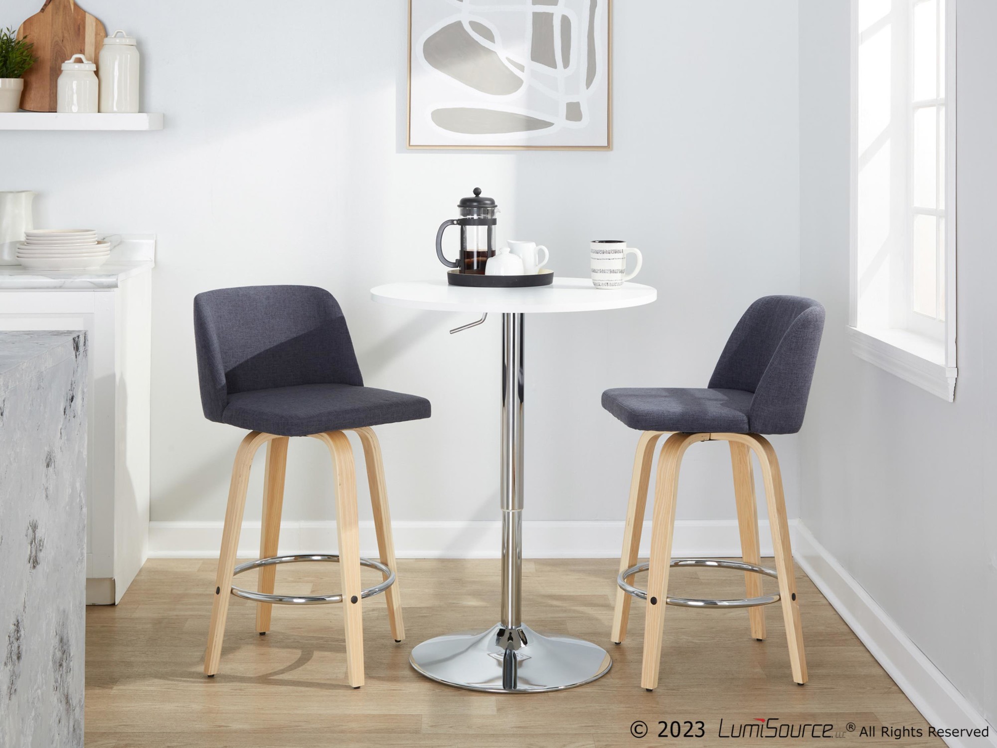 • Includes two counter stools
