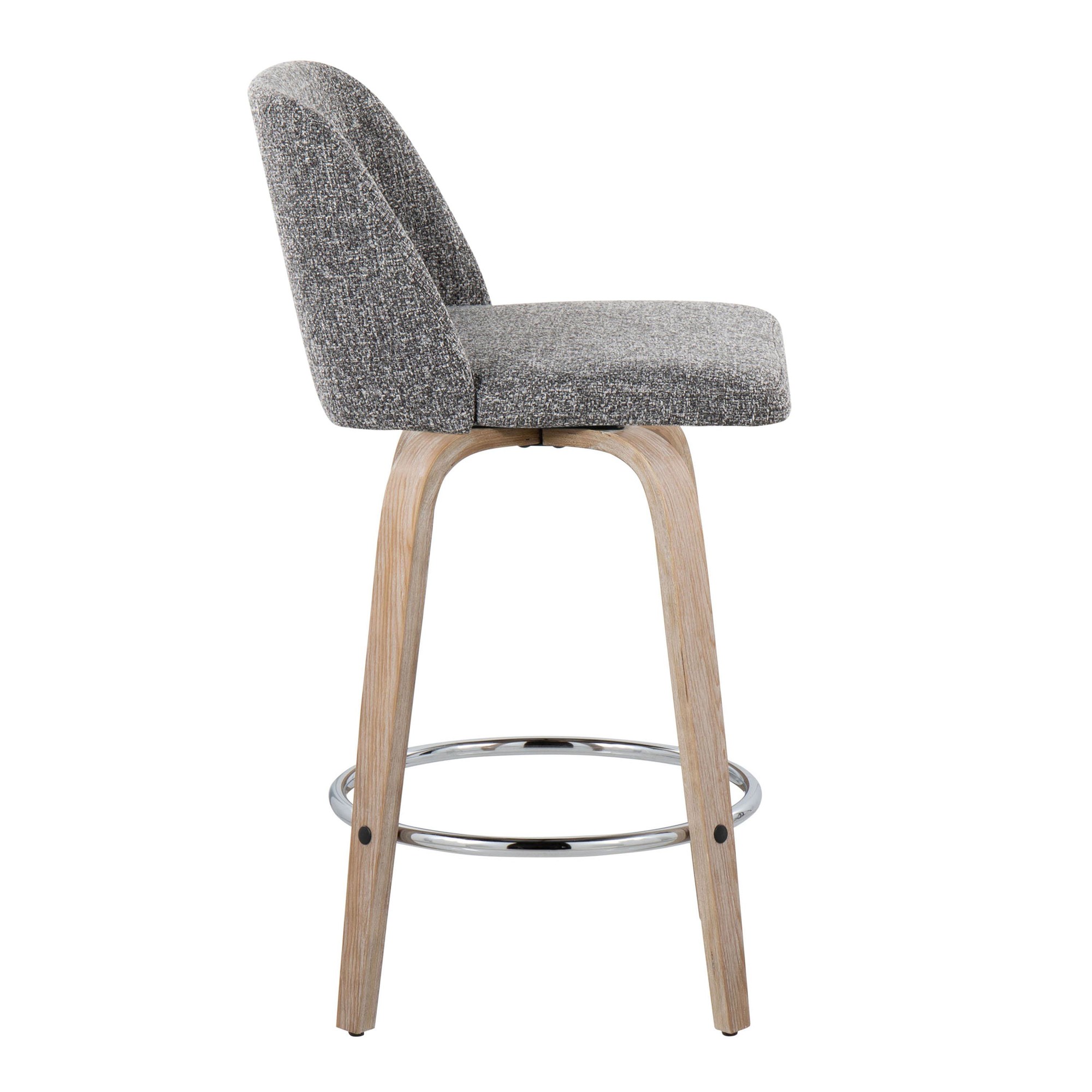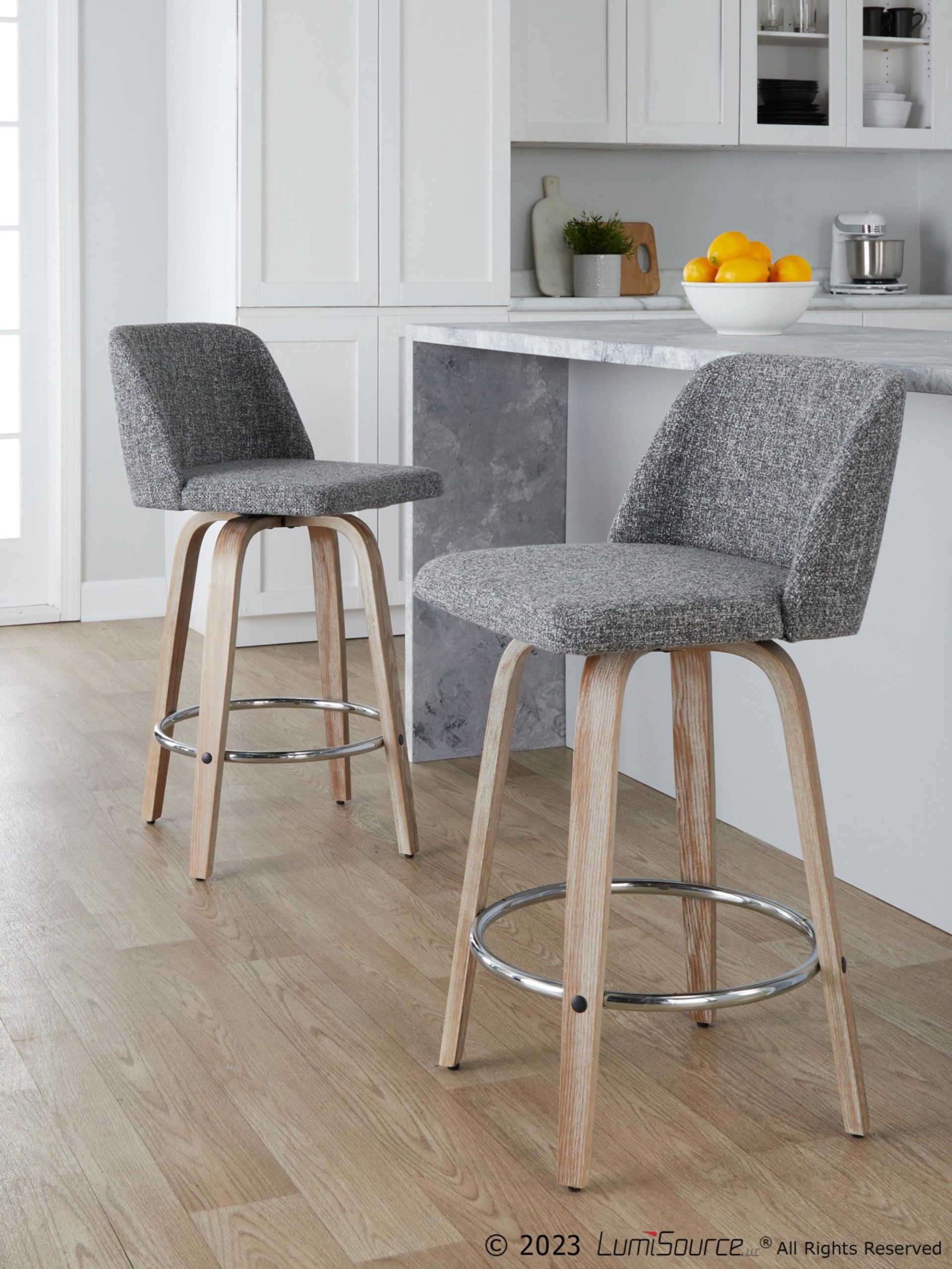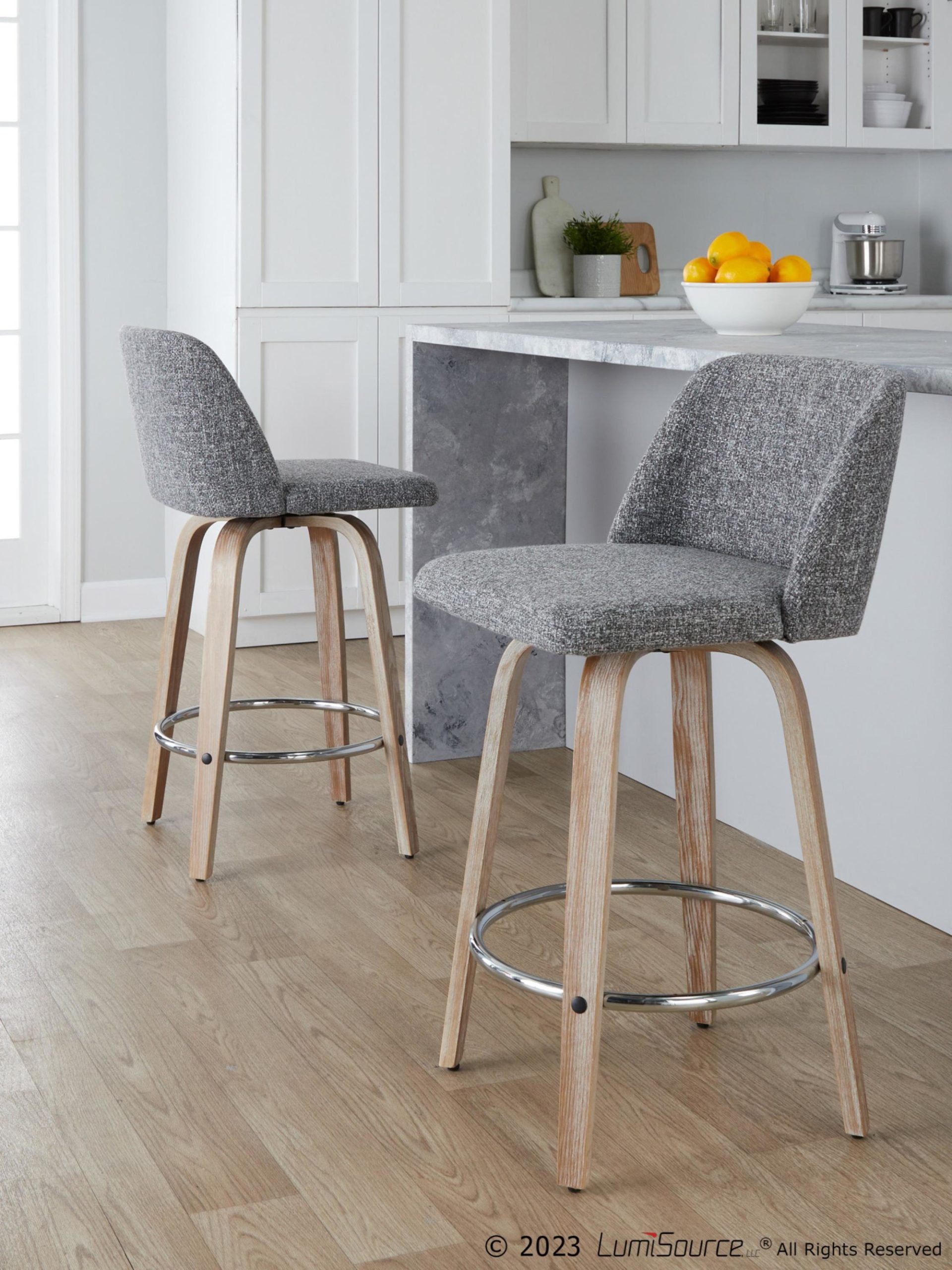 The Toriano 26-Inch Contemporary Grey Swivel Counter Stools combine comfort, modern simplicity, and classic lines, making them an appealing addition to any space. These fixed-height counter stools feature a padded, upholstered swivel seat and bent wood legs, complete with a built-in footrest.