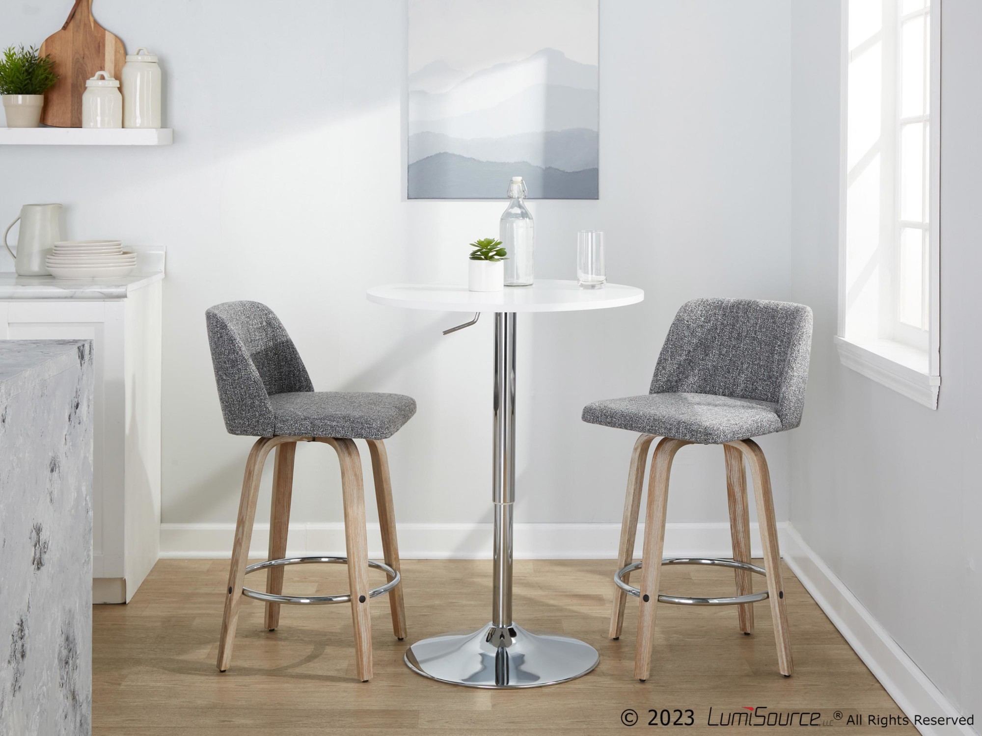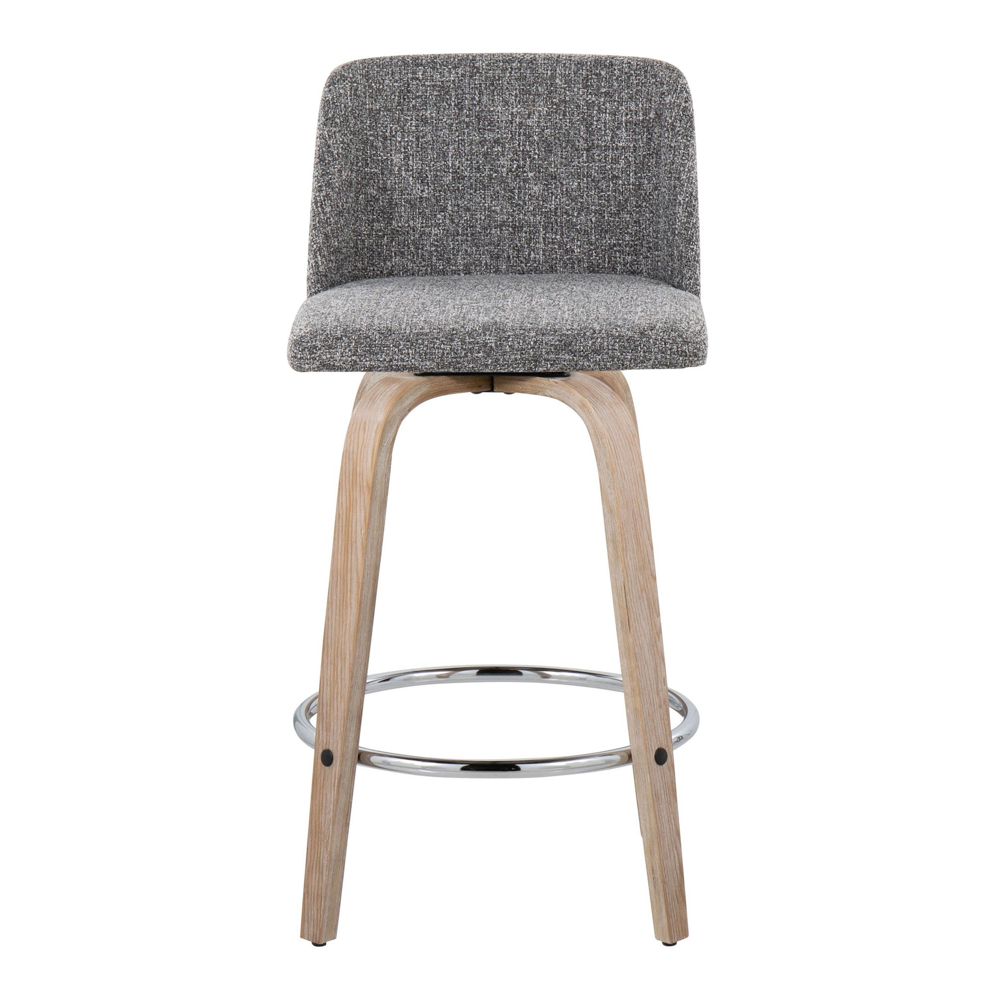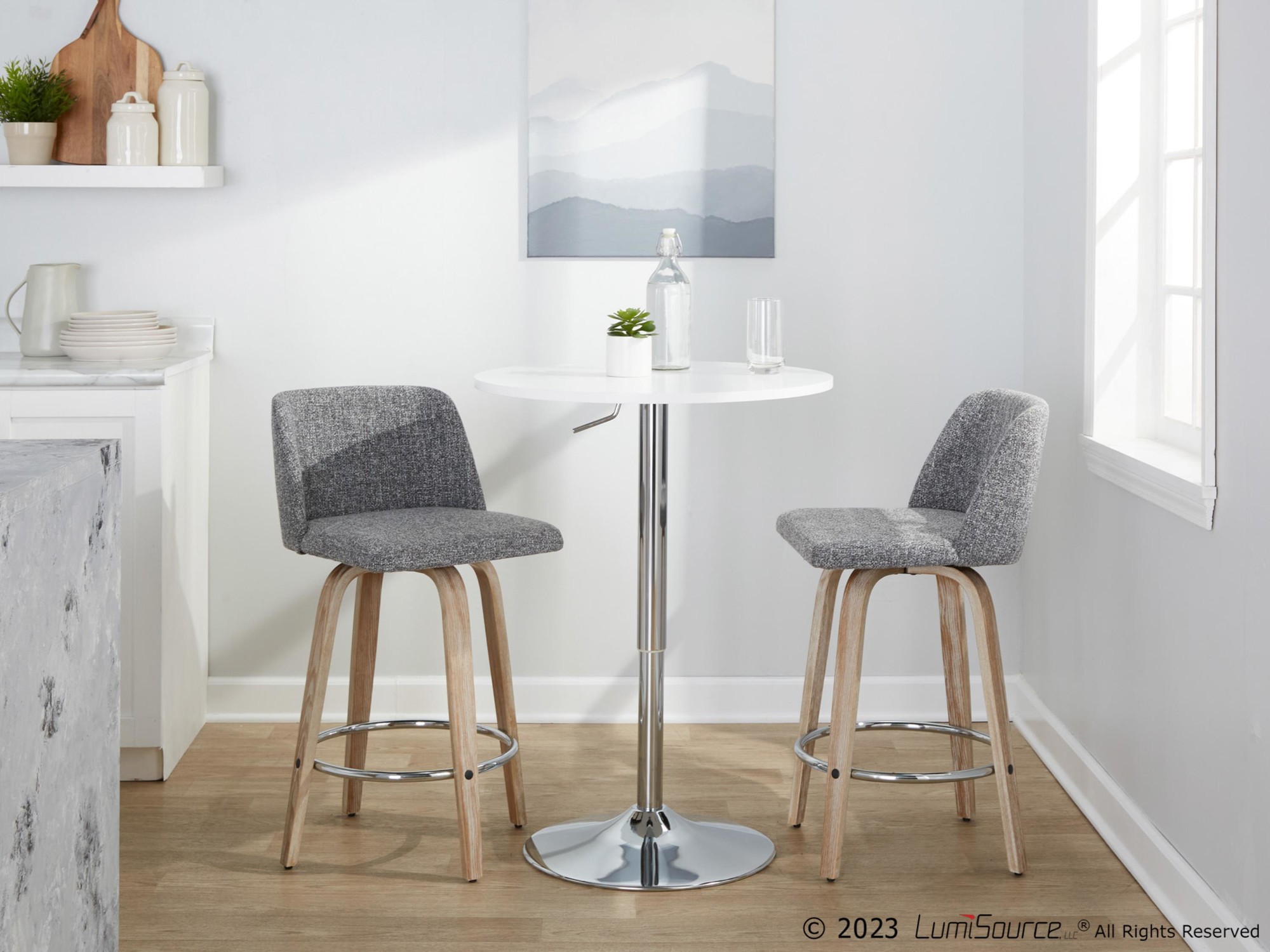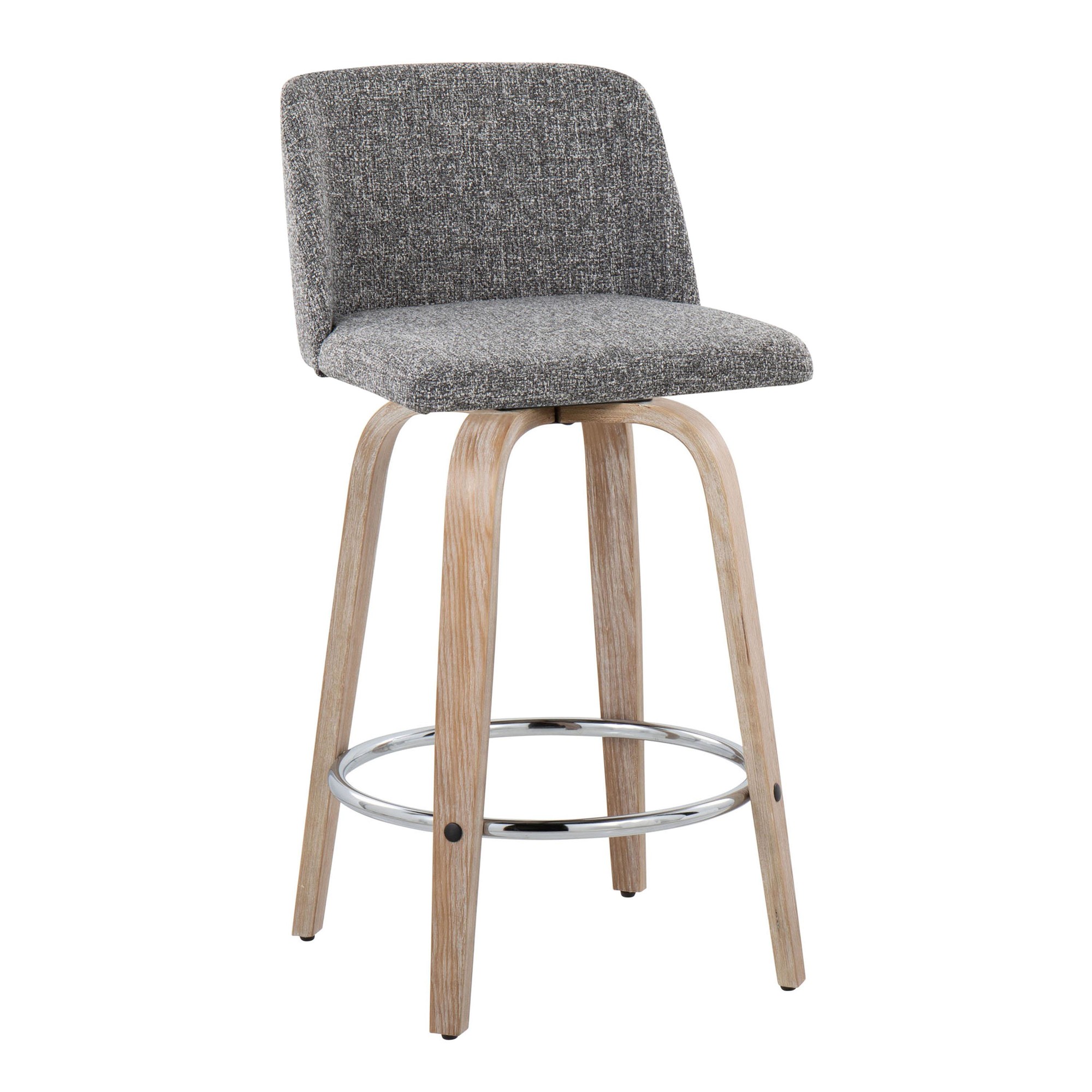 The Toriano 26-Inch Contemporary Grey Swivel Counter Stools combine comfort, modern simplicity, and classic lines, making them an appealing addition to any space. These fixed-height counter stools feature a padded, upholstered swivel seat and bent wood legs, complete with a built-in footrest.