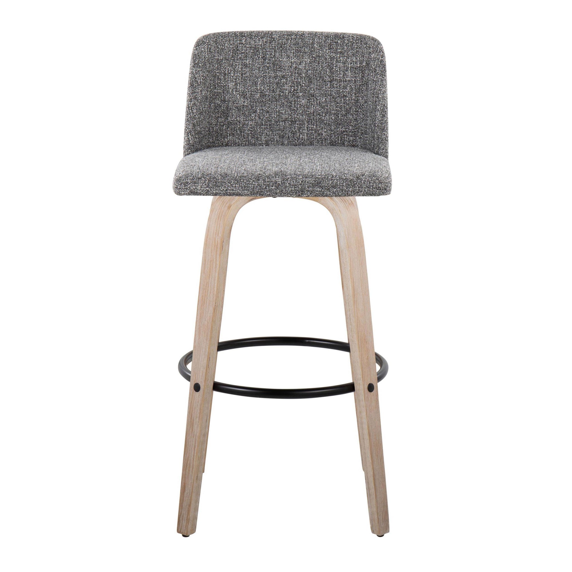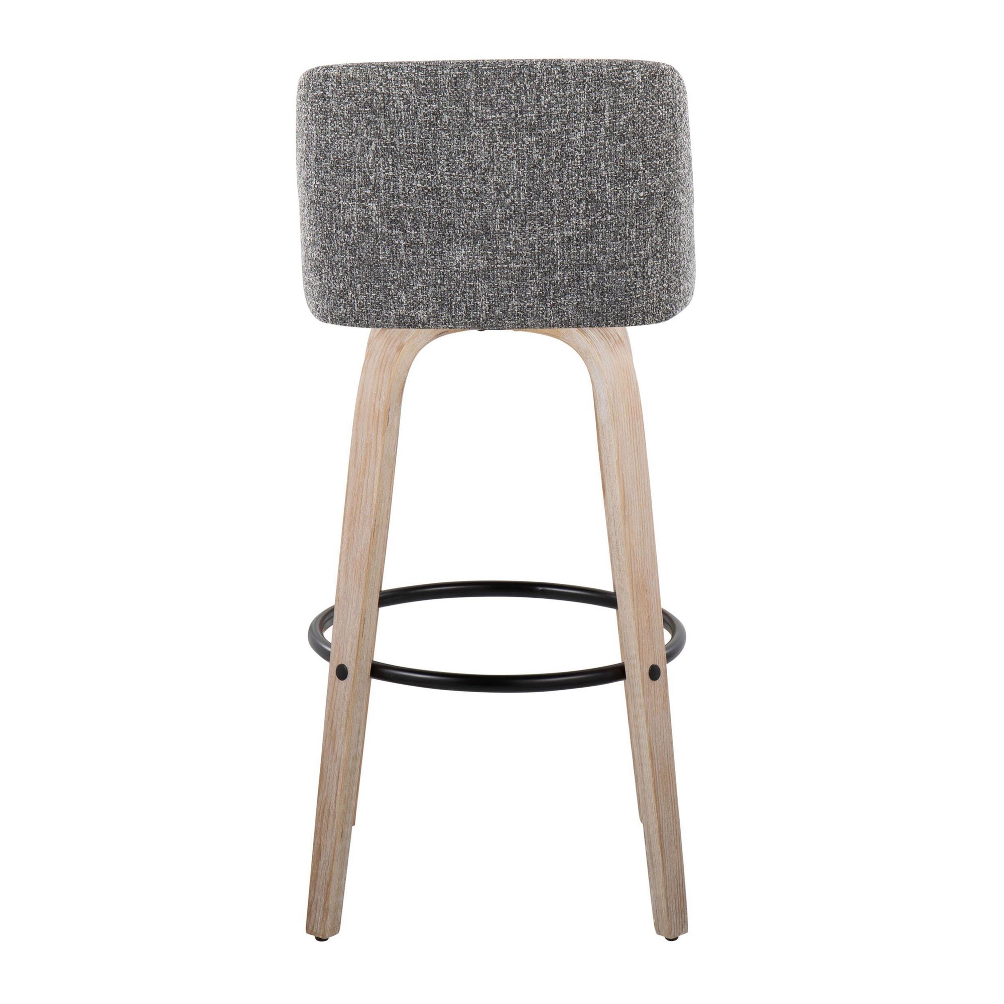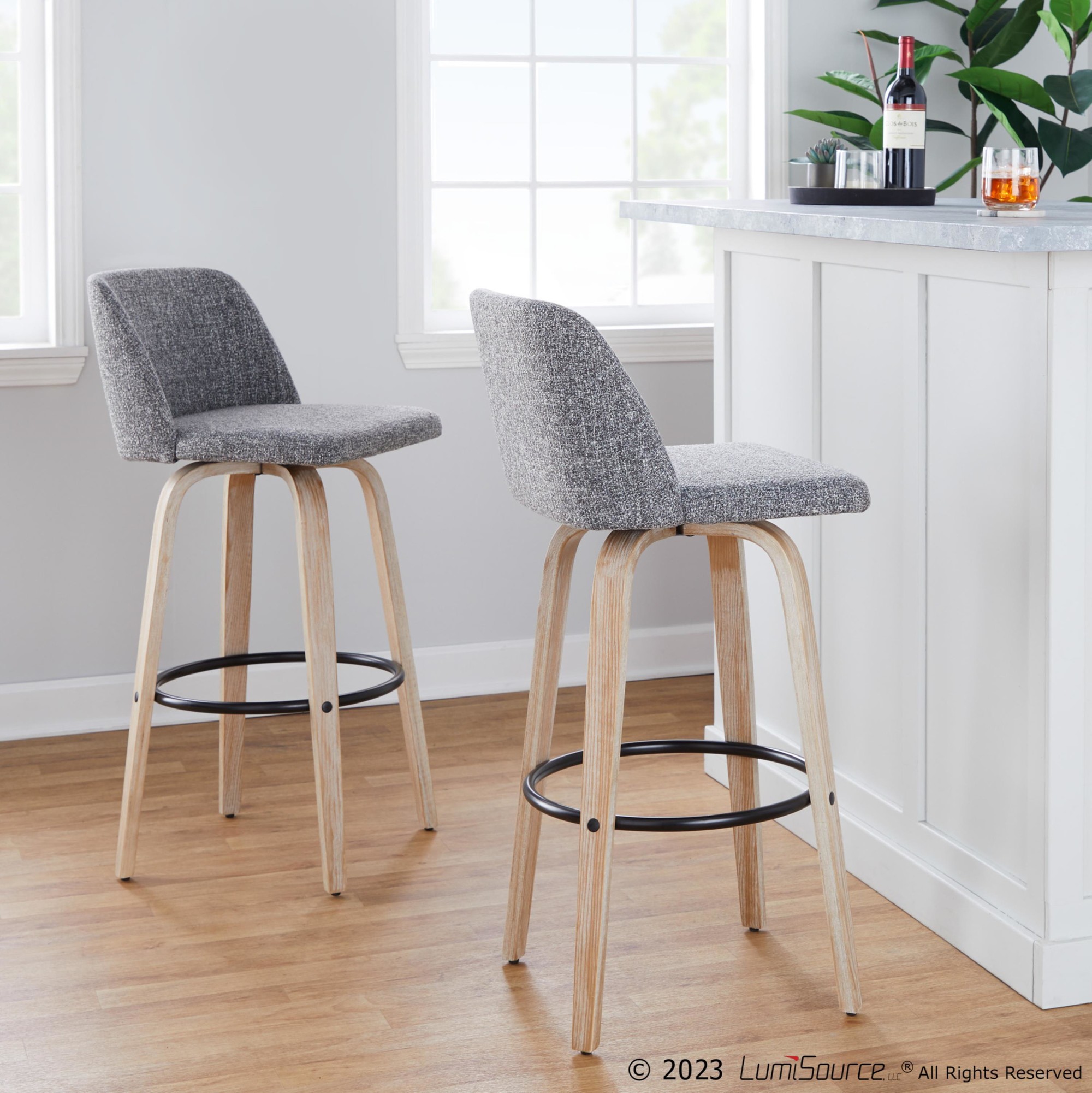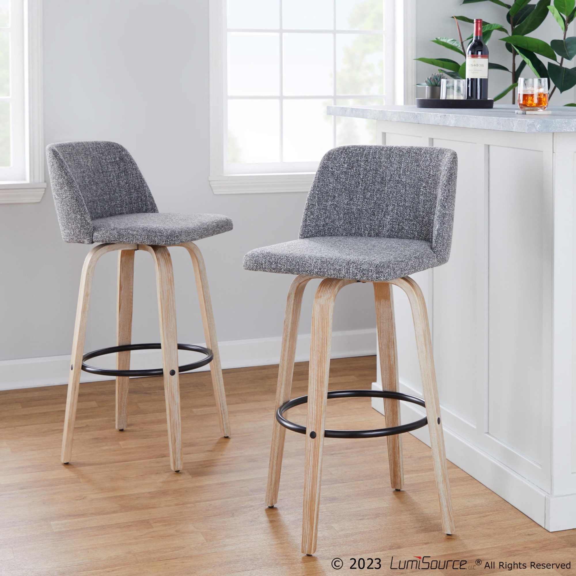 The Toriano 30 Contemporary Grey Noise Fabric Barstools offer a blend of comfort, modern simplicity, and classic design. These barstools are perfect for adding an inviting touch to your bar area or kitchen counter. Each stool features a padded, upholstered swivel seat, fixed-height bent wood legs, and a convenient built-in footrest.