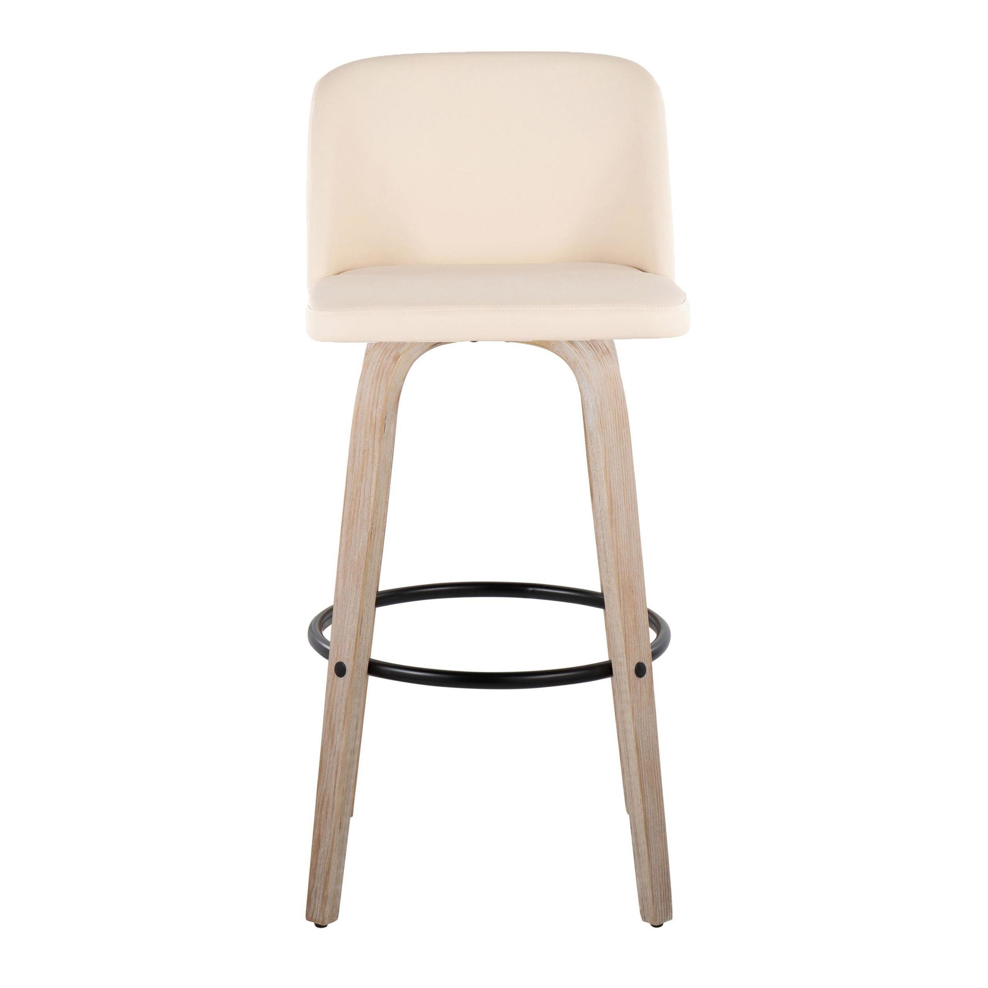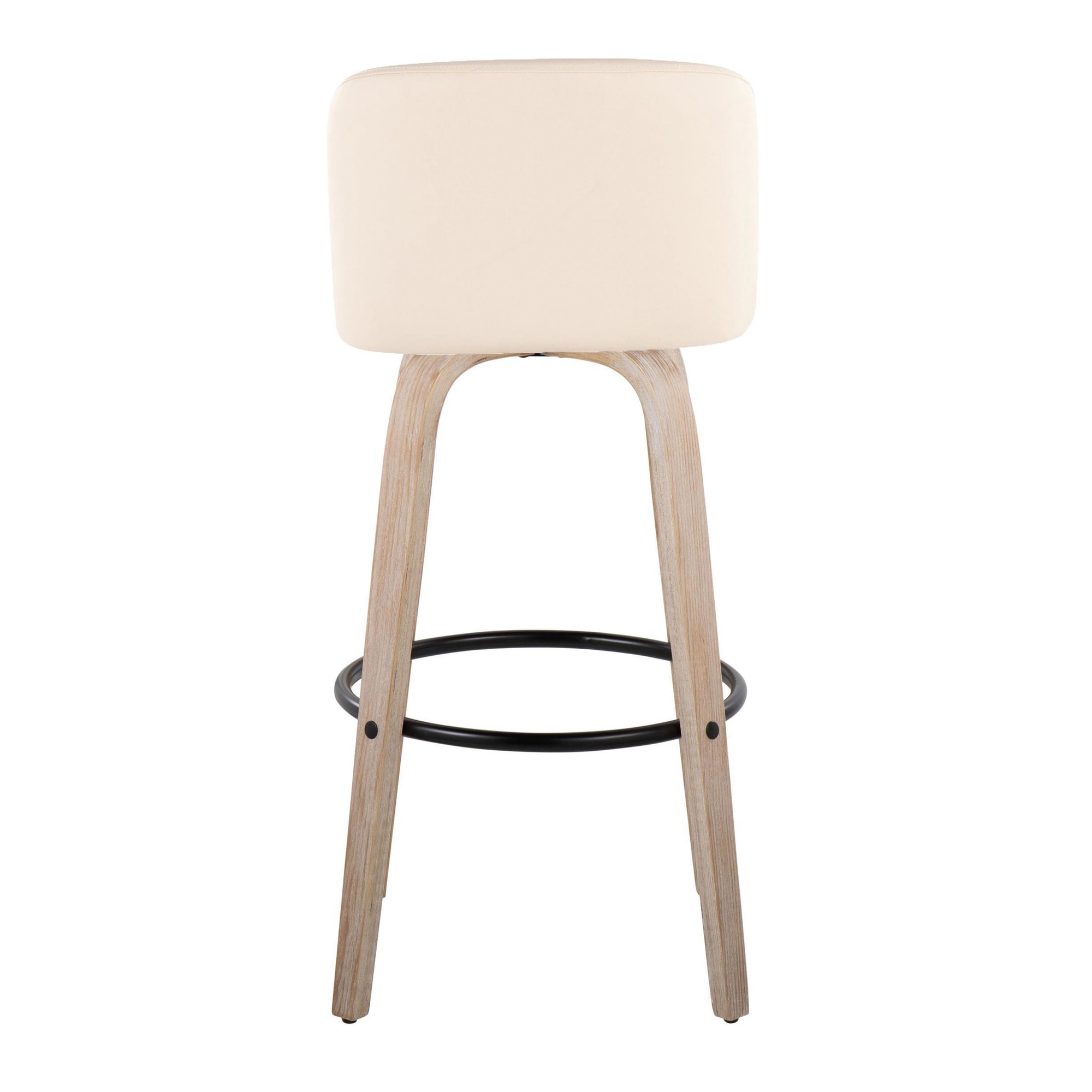 Add a touch of modern comfort to your man cave with the Toriano 30-Inch Farmhouse Cream Swivel Barstool Set. This set of two features a farmhouse style that will elevate your space. Each barstool has a fixed bar height and a 360-degree swivel, perfect for your bar or game room. Enjoy the comfort of the cushioned backrest and seat upholstered in faux leather, along with a sturdy built-in metal footrest. Some assembly is required. Each stool has a weight limit: 250 lbs. Material: Faux Leather, Foam, Steel, Bent Wood. Color: White-Washed Wood, Cream PU, Black Metal.