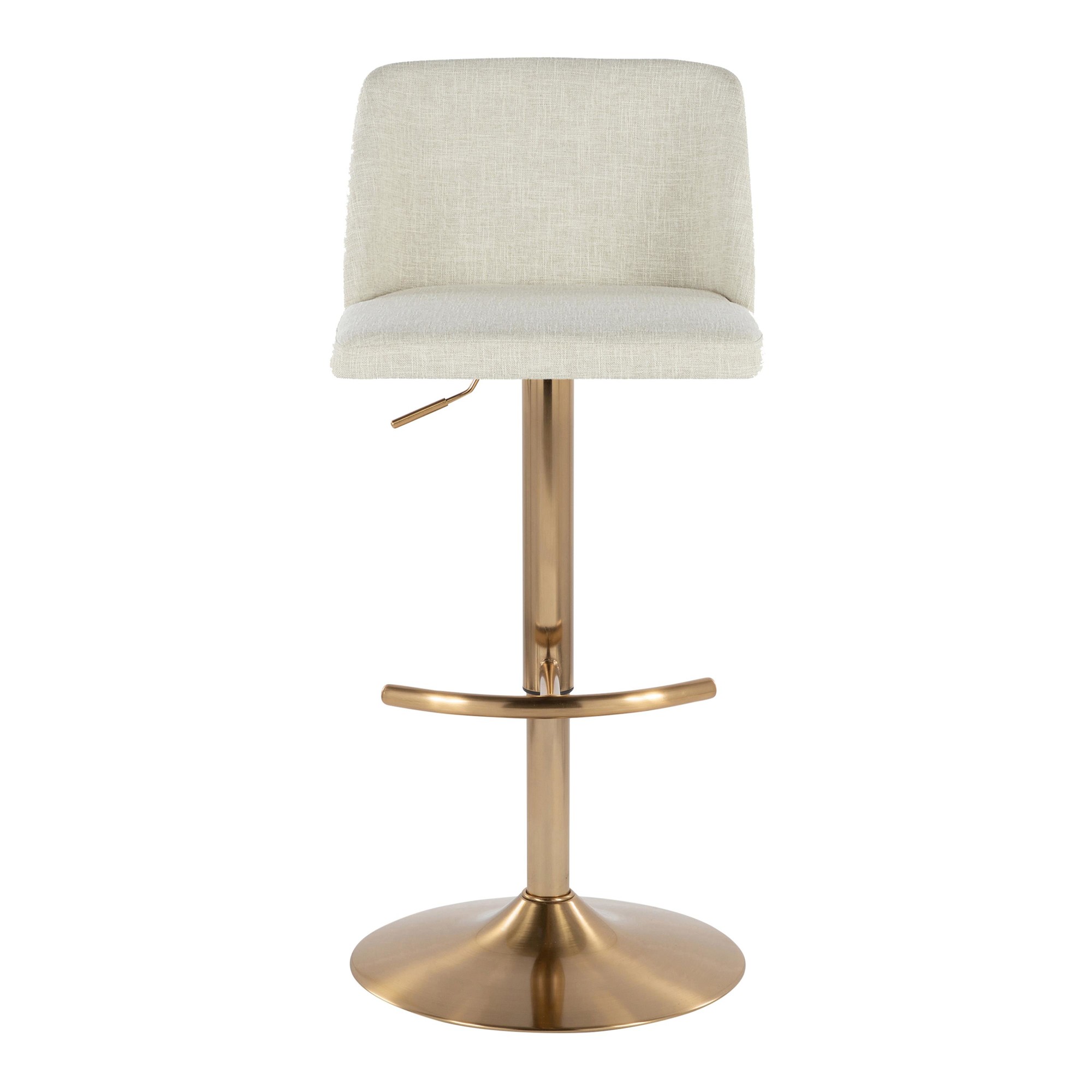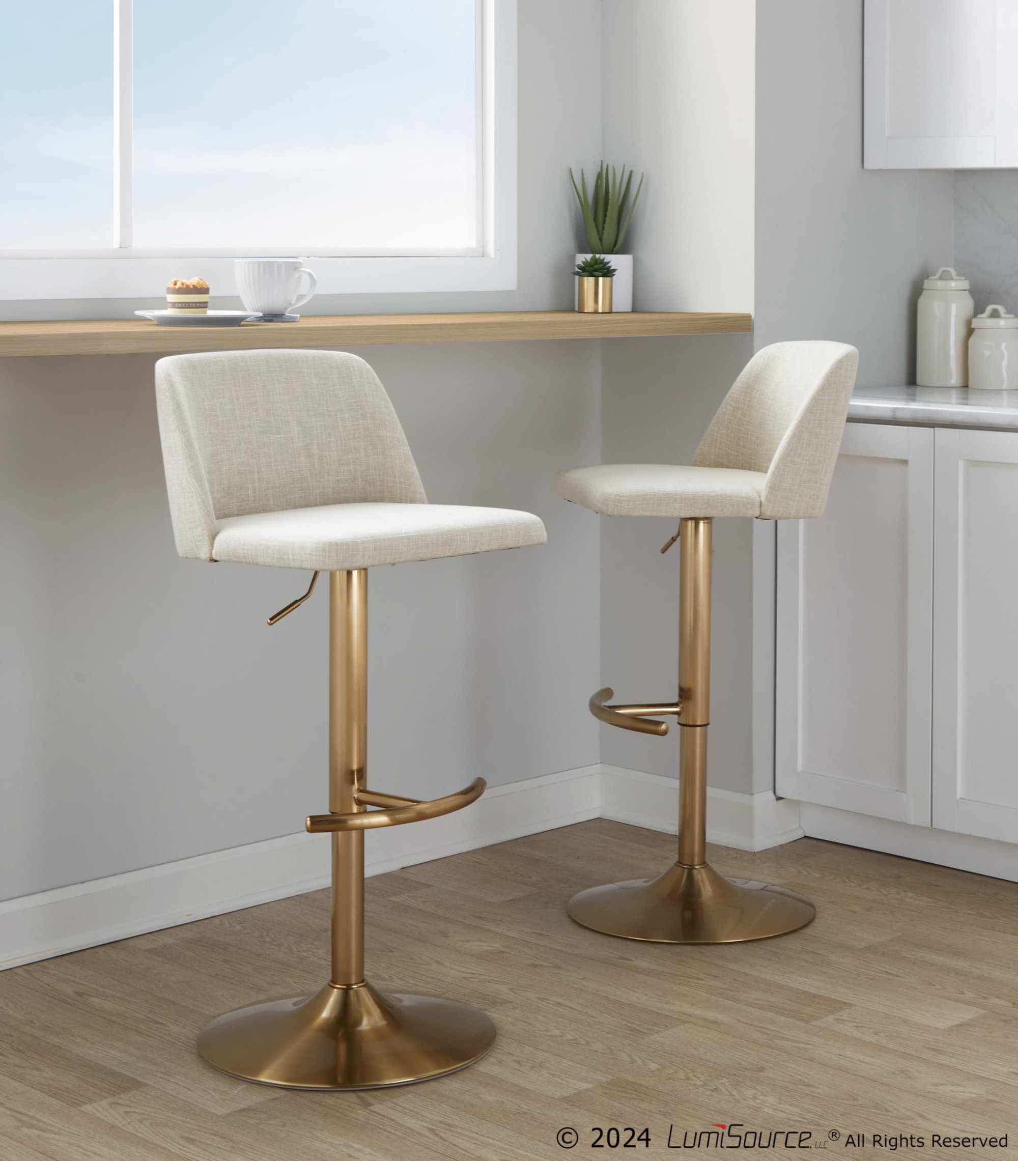 The Toriano Cream Fabric Gold Base Contemporary Swivel Barstools offer a blend of comfort, modern simplicity, and classic design, perfect for elevating your bar area. These barstools feature a padded, upholstered swivel seat and an adjustable pedestal base with a built-in footrest, providing both style and functionality. Sold in pairs, they are an excellent addition to any contemporary home.