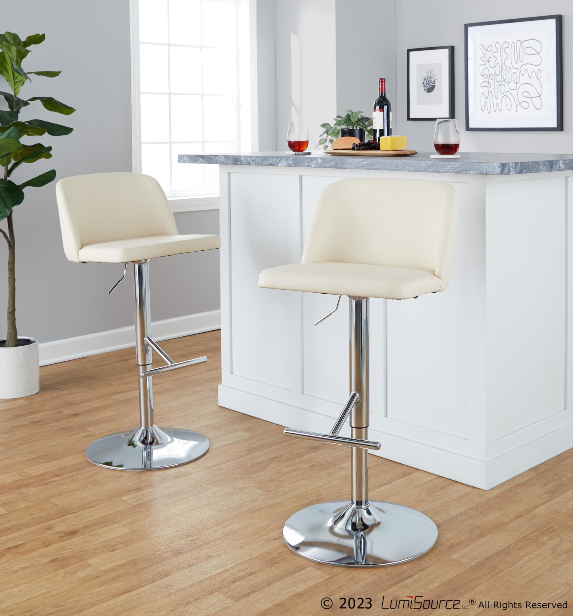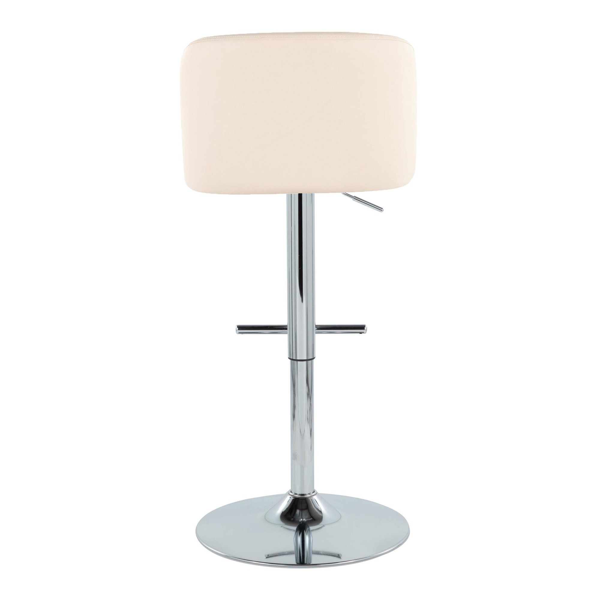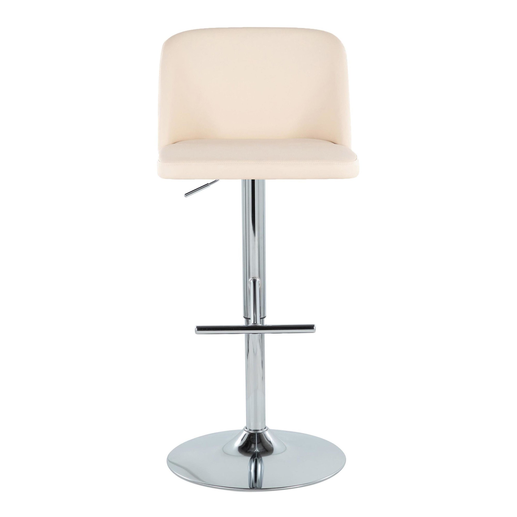 The padded upholstered swivel seat provides a cozy place to sit, while the adjustable height feature allows you to customize the stool to your preferred level. The contemporary inspired pedestal base includes a built-in footrest, adding extra comfort and support. Available in a cream finish that complements any decor.