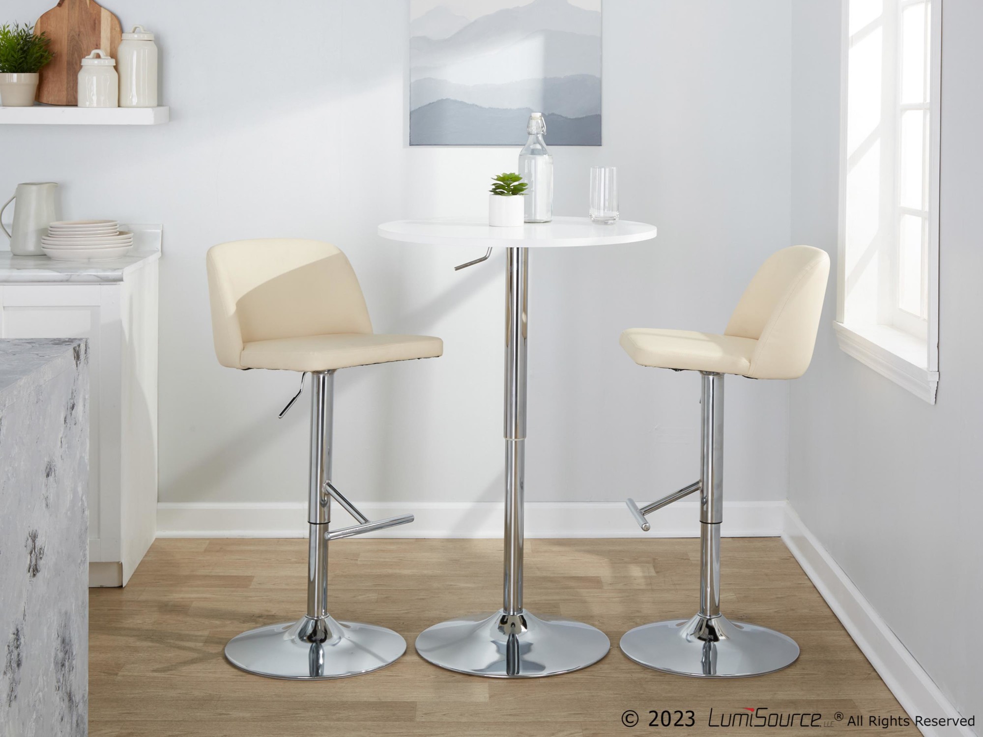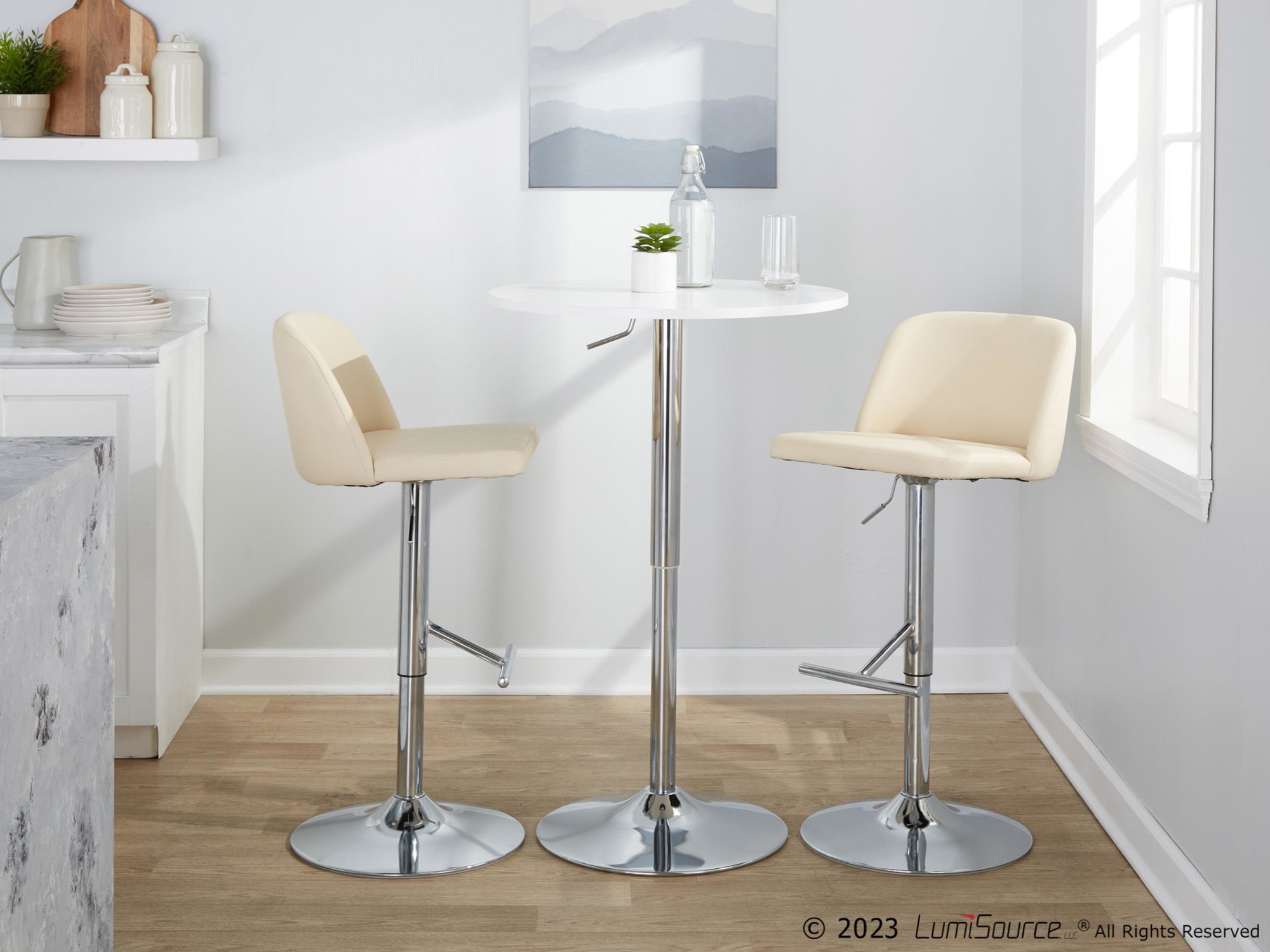 - Includes two barstools