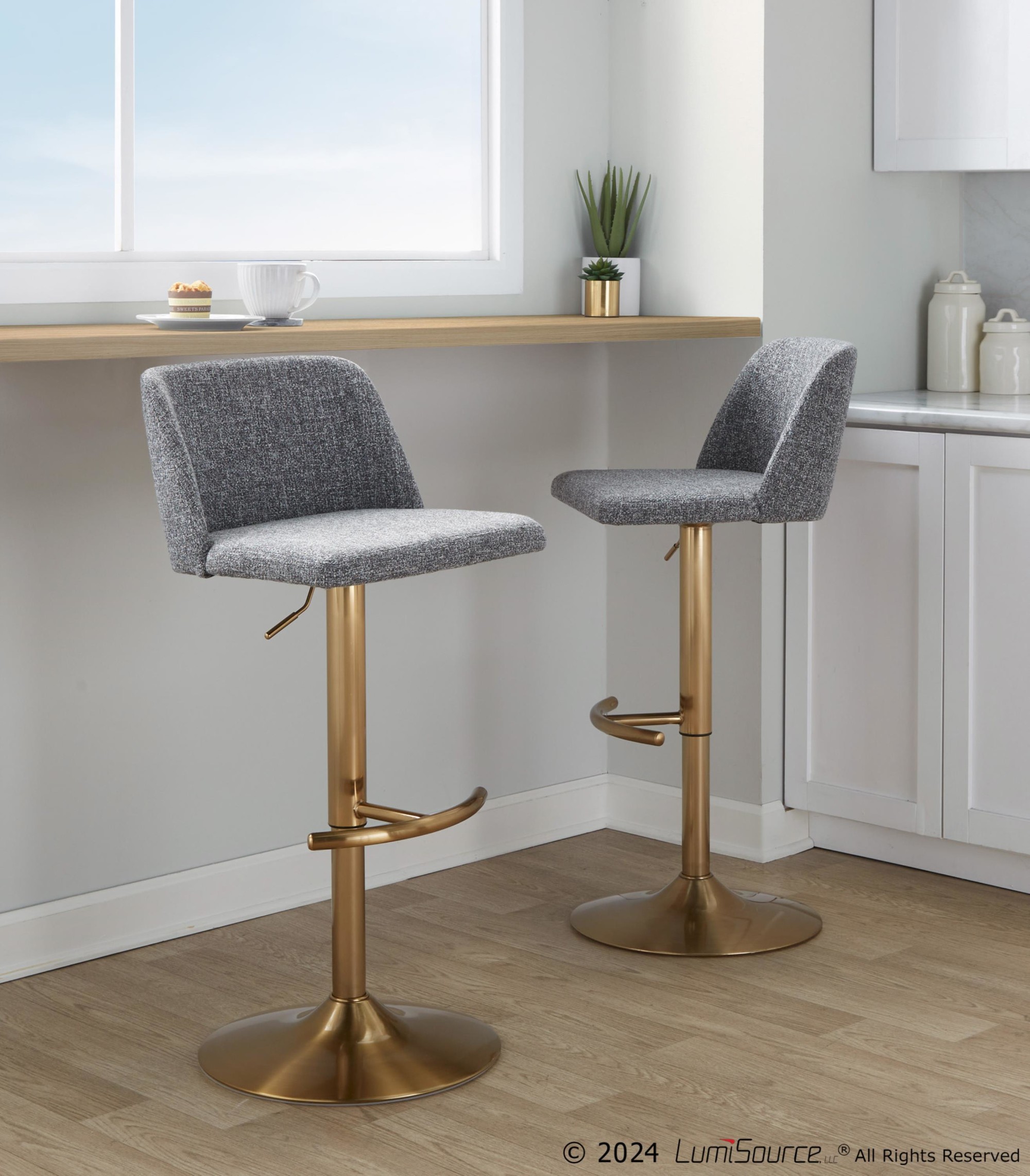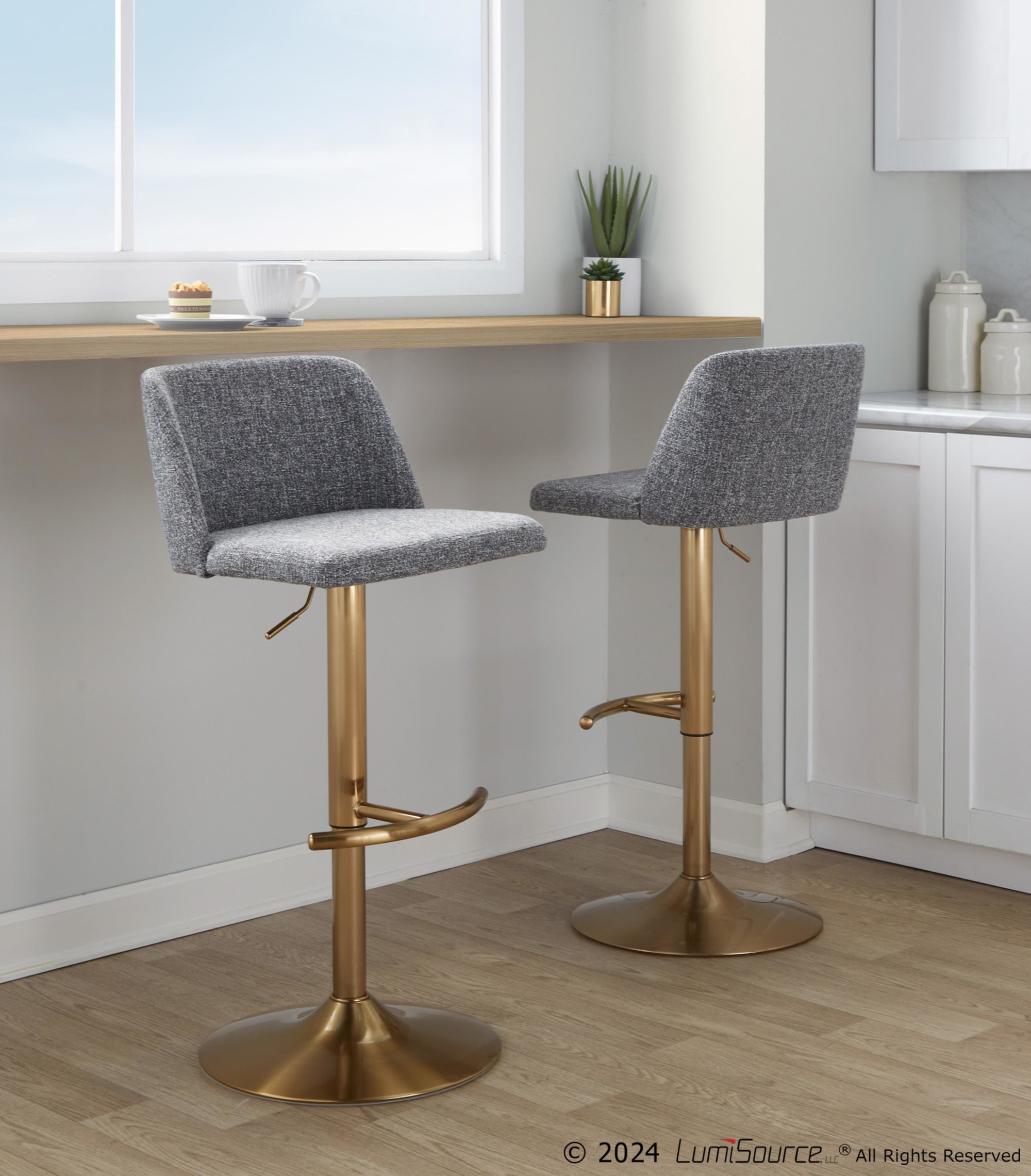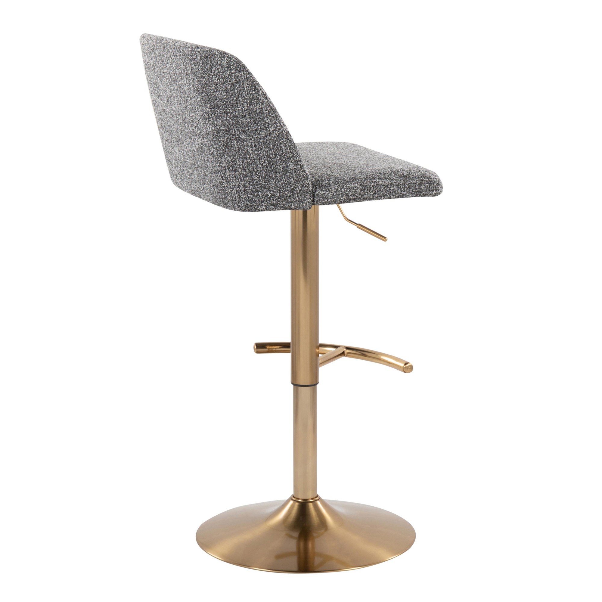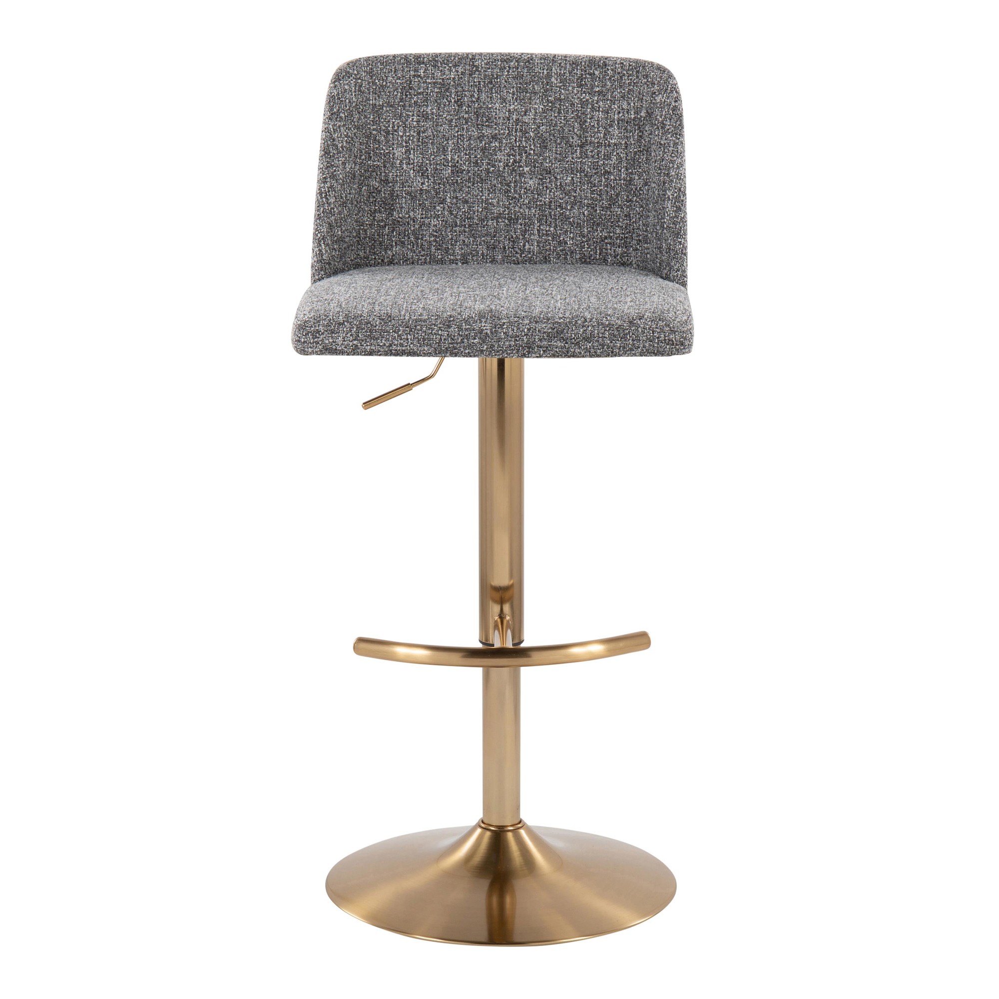 Enjoy the contemporary styling and the convenience of the 360-degree swivel. The cushioned backrest and seat, upholstered in a stylish fabric, provide exceptional comfort. The sturdy gold base features a rounded footrest, adding to the overall aesthetic and functionality. Sold in pairs, these barstools are an easy way to enhance your space.