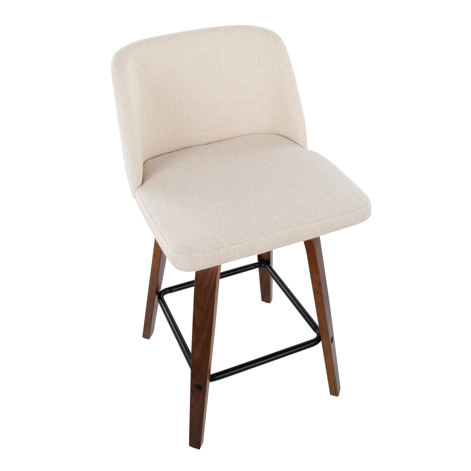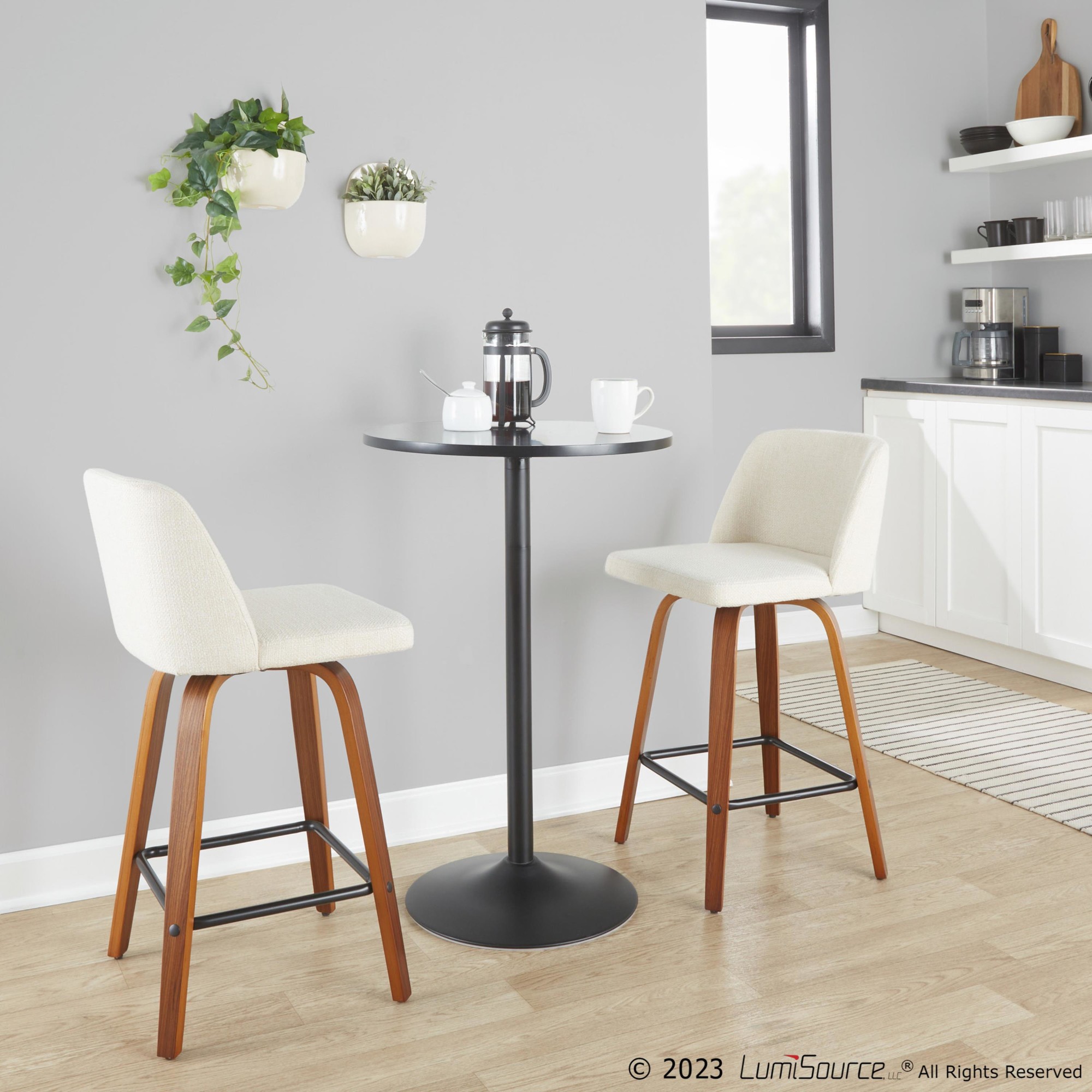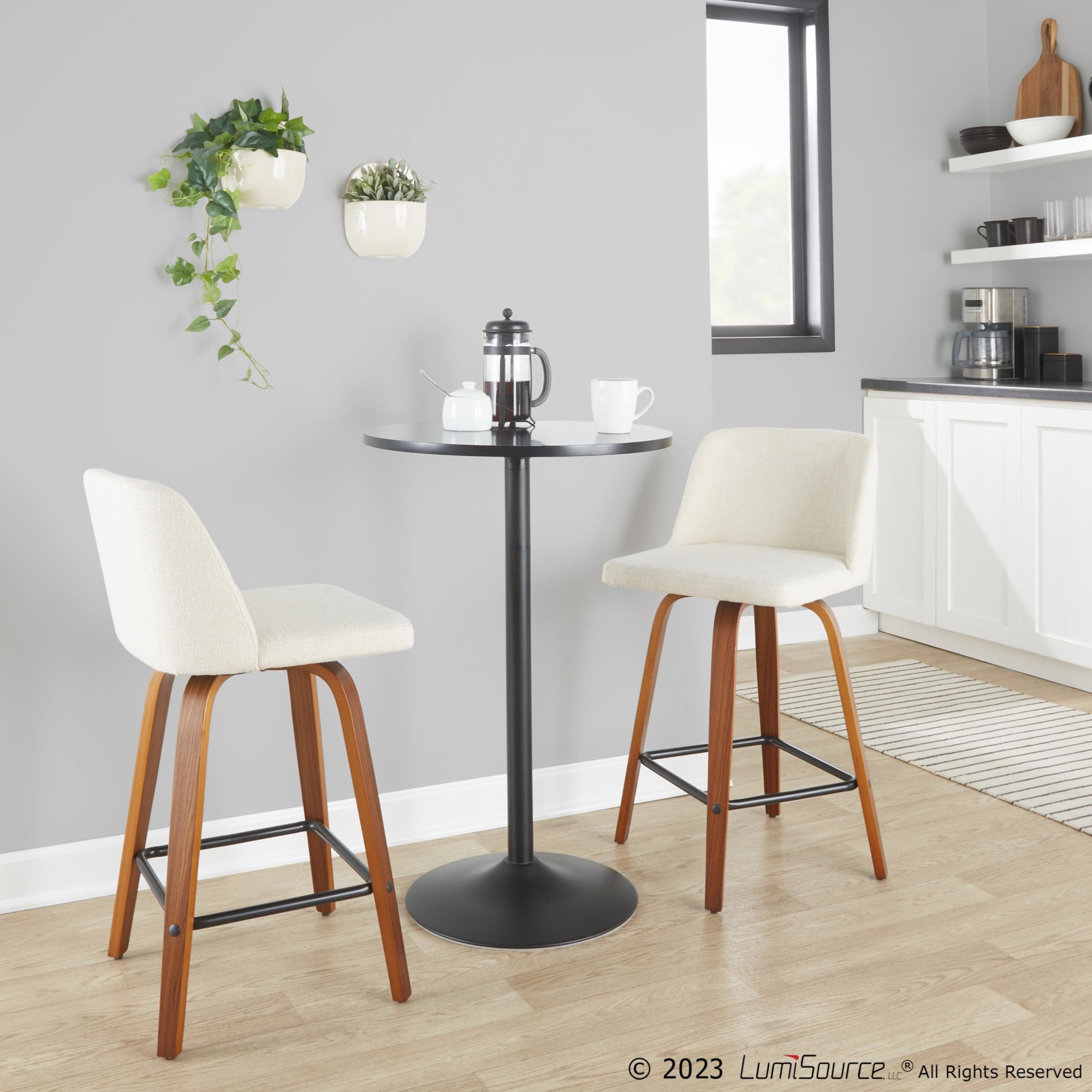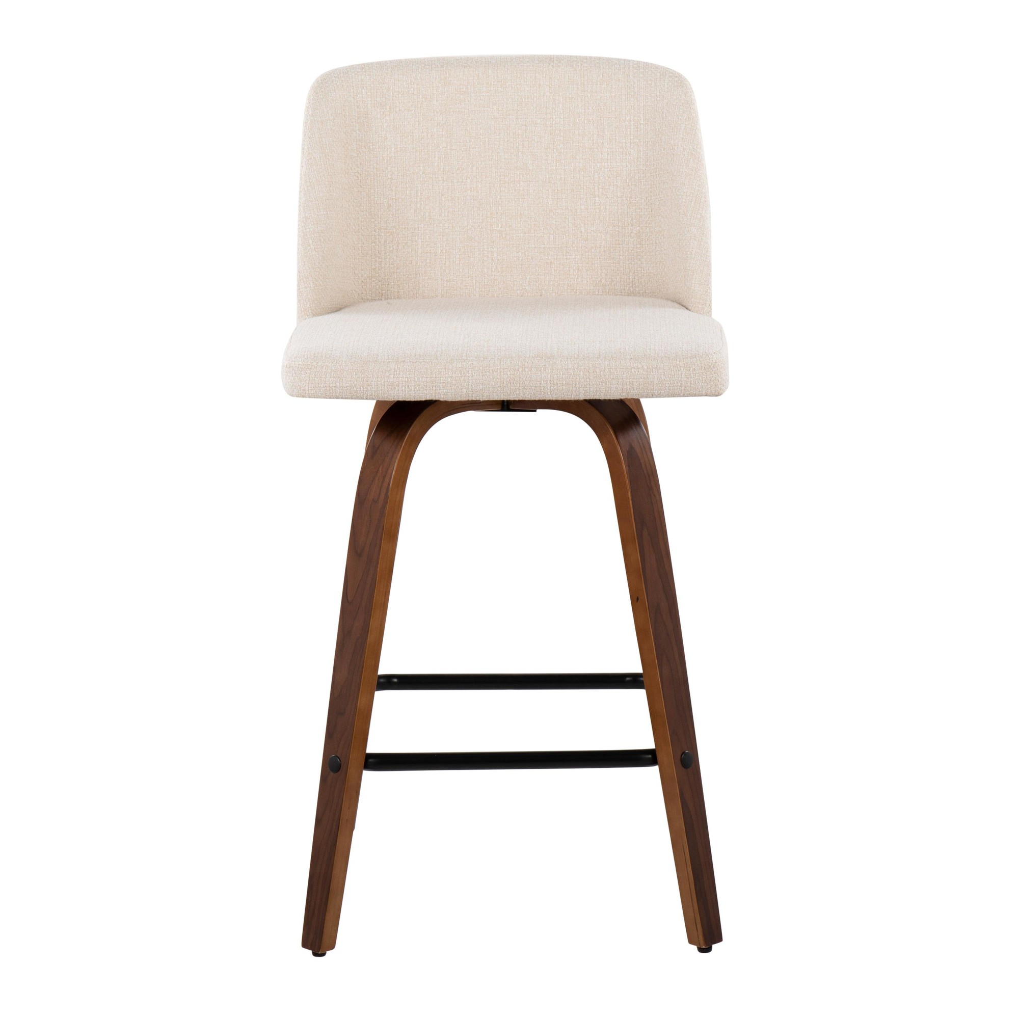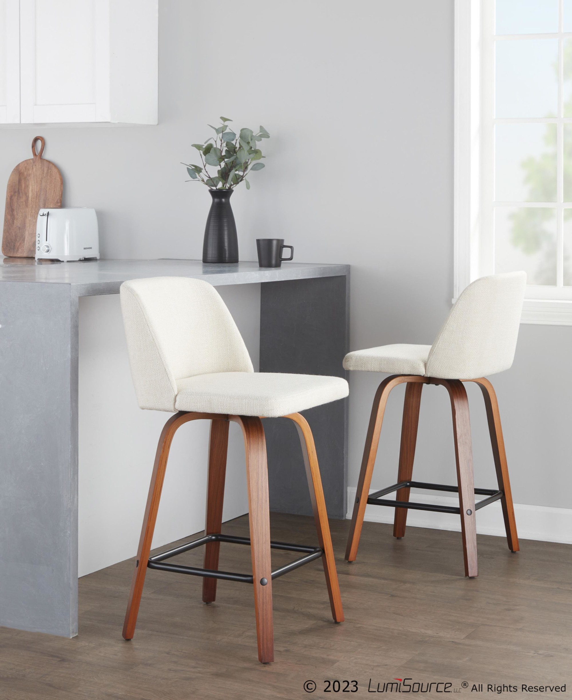 The Toriano Walnut Cream Mid-Century Modern 26-Inch Counter Stools offer a blend of comfort, modern simplicity, and classic lines. These appealing stools feature a padded, upholstered swivel seat atop fixed-height bent wood legs, complete with a built-in footrest. Perfect for adding a touch of mid-century charm to your man cave, these stools are as stylish as they are comfortable.