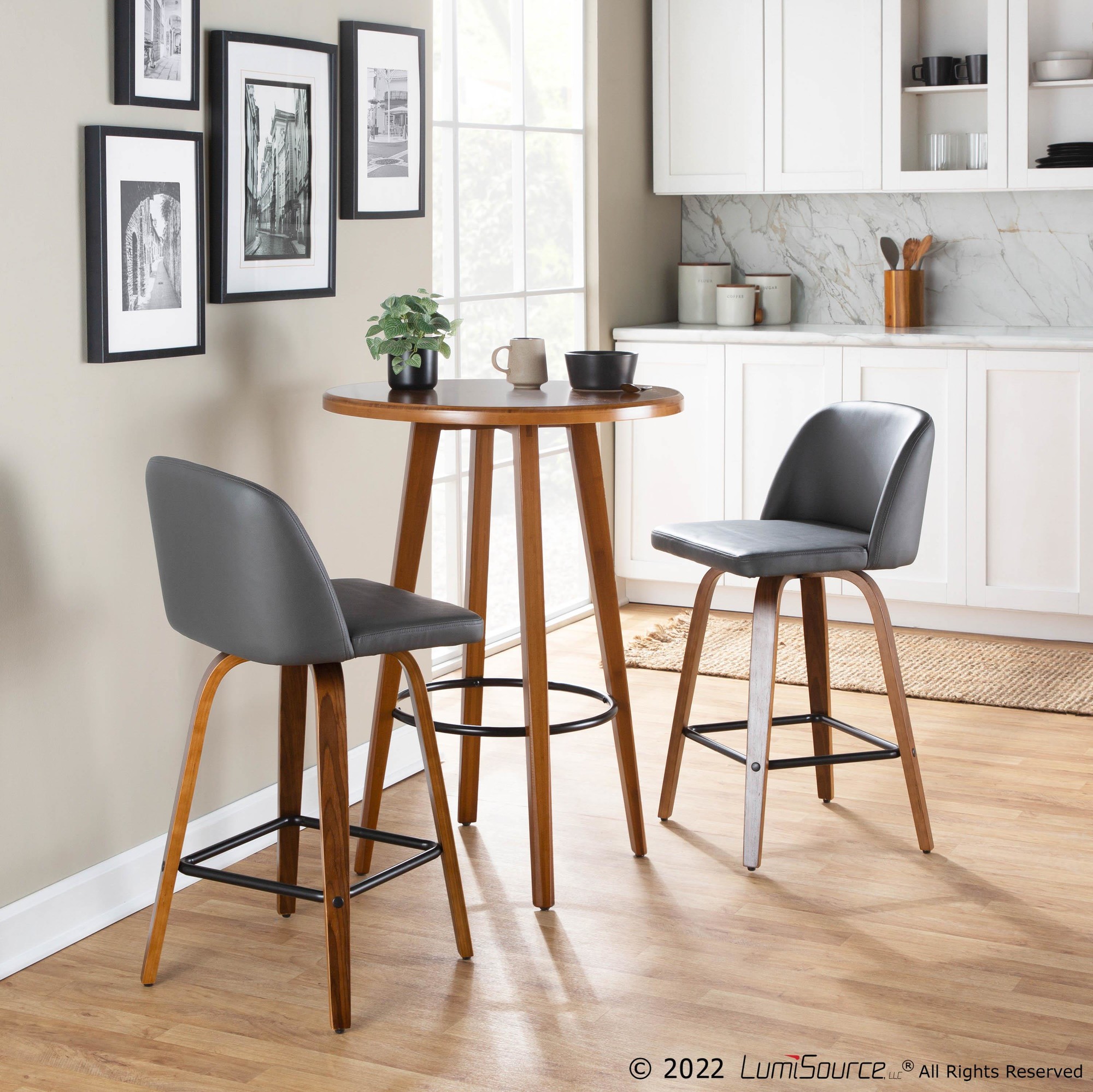 The Toriano Mid-Century Modern Counter Stools bring comfort, modern simplicity, and classic lines to your space. These stylish stools feature a padded, upholstered swivel seat, perfect for relaxing in your man cave. The fixed-height bent wood legs include a built-in footrest, adding both comfort and style. Available in a walnut wood finish with grey faux leather upholstery, these stools are sure to complement your decor.