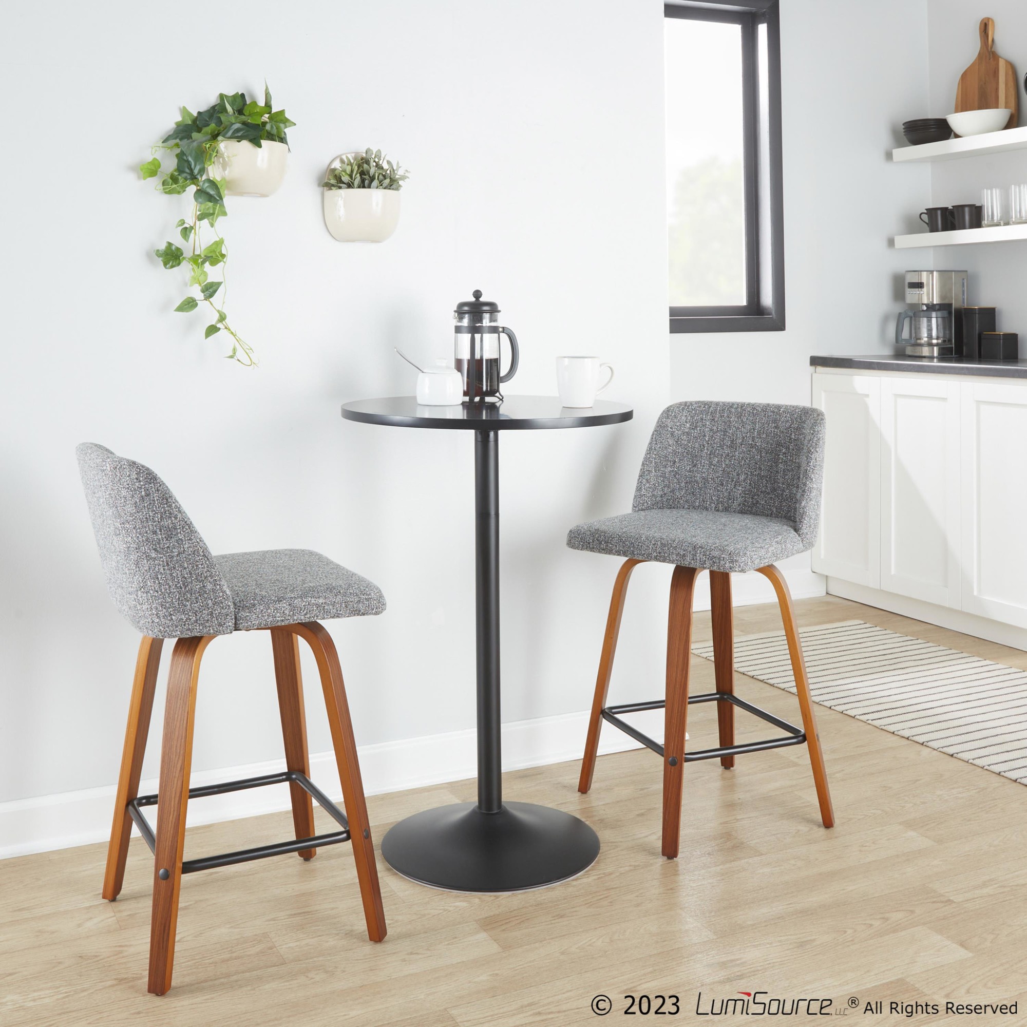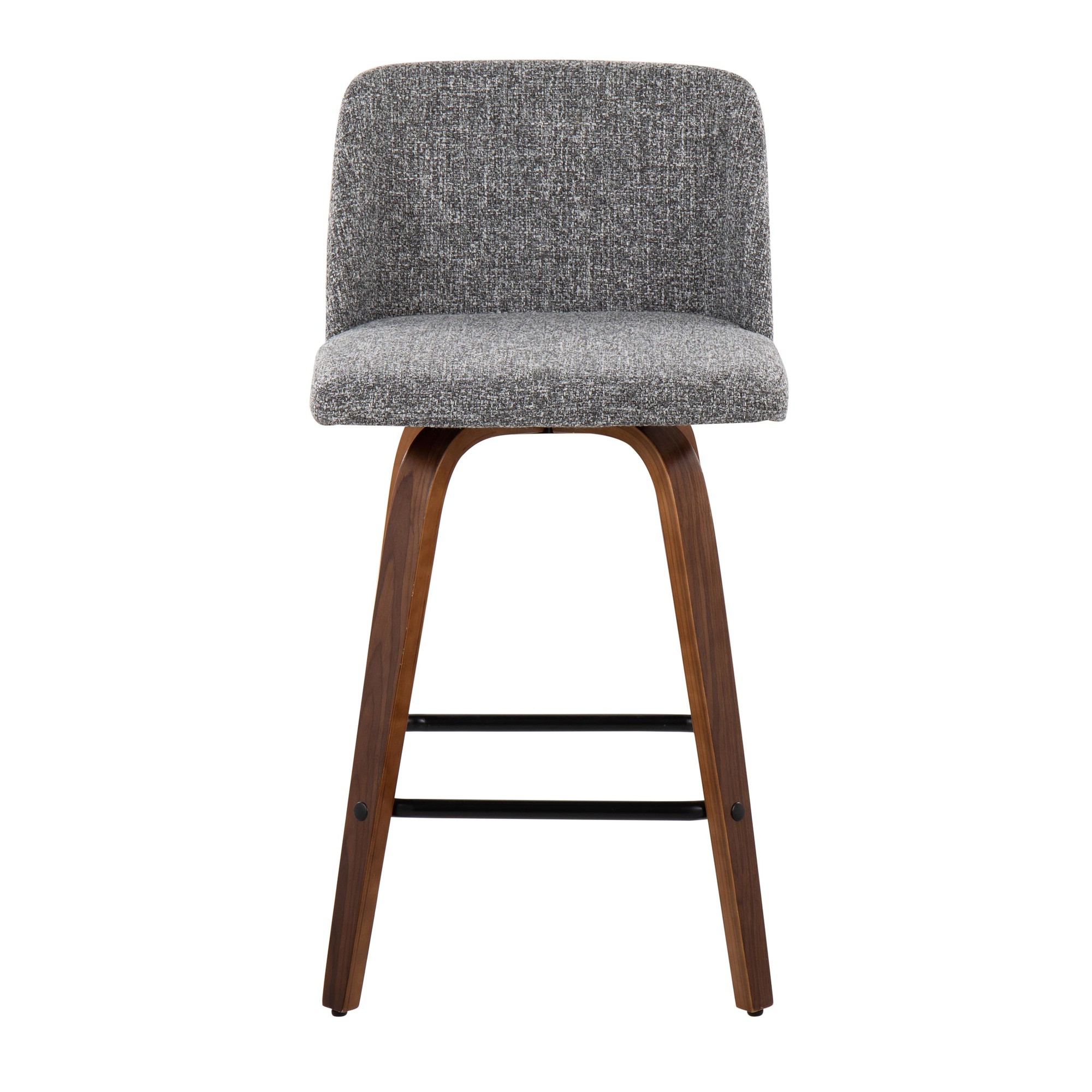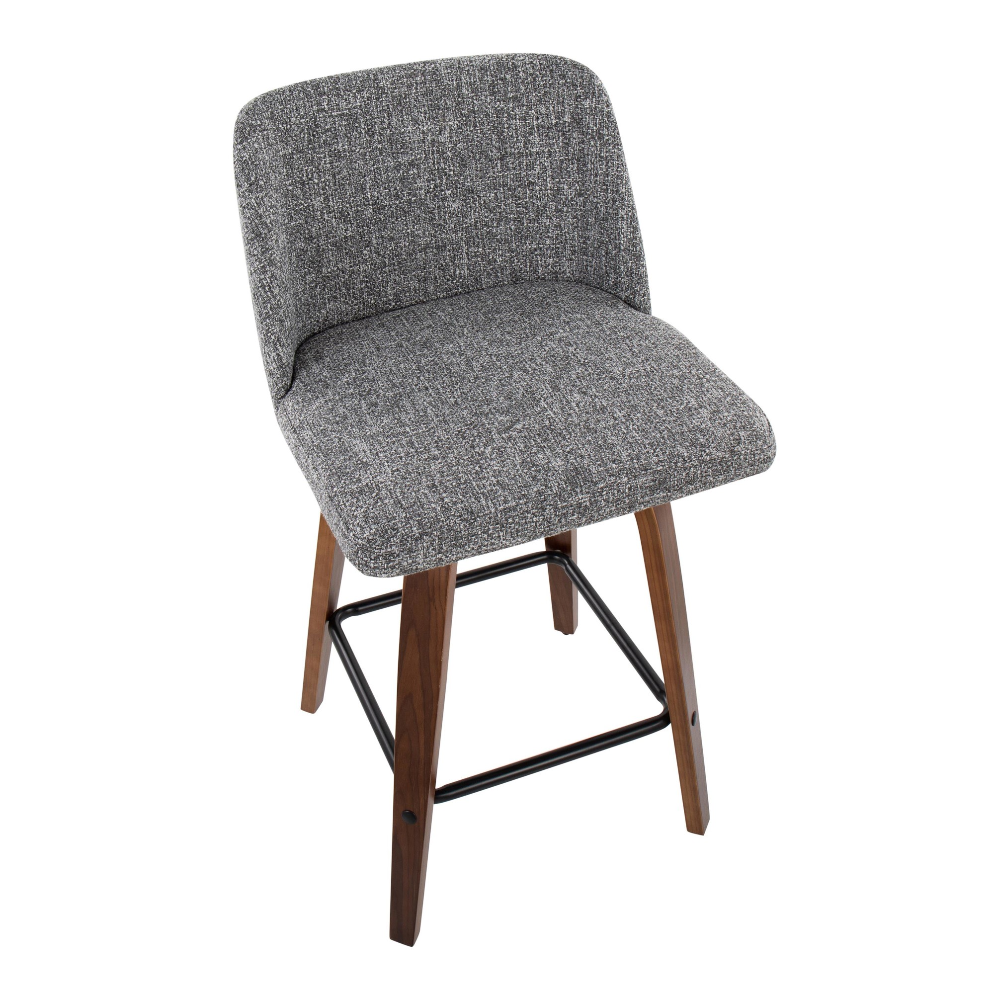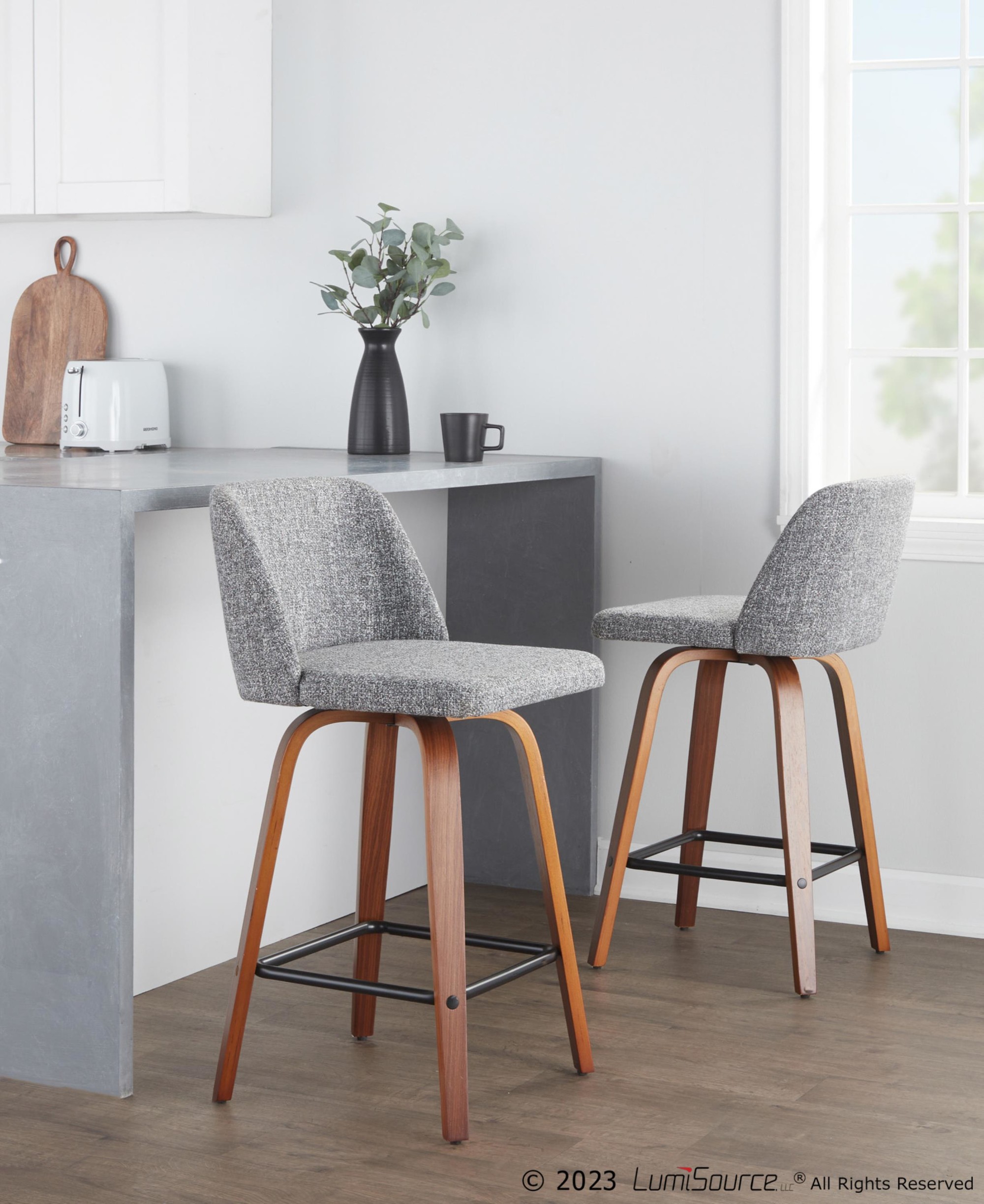 Upgrade your man cave with the Toriano Walnut Grey Fabric Mid-Century Modern Counter Stools! These stools blend comfort with modern style. The stylish fabric upholstery and walnut wood finish give a classic look. Each stool has a padded seat that swivels. The built-in footrest is made of black metal and adds extra comfort. The fixed counter height is perfect for your bar. This set includes two counter stools. Some assembly is needed. Each stool can hold up to 250 lbs. Add these to your bar for a cool, comfy touch.