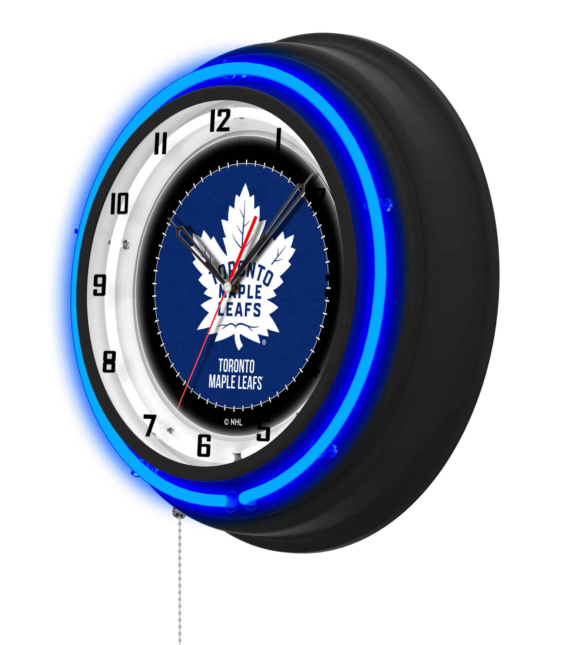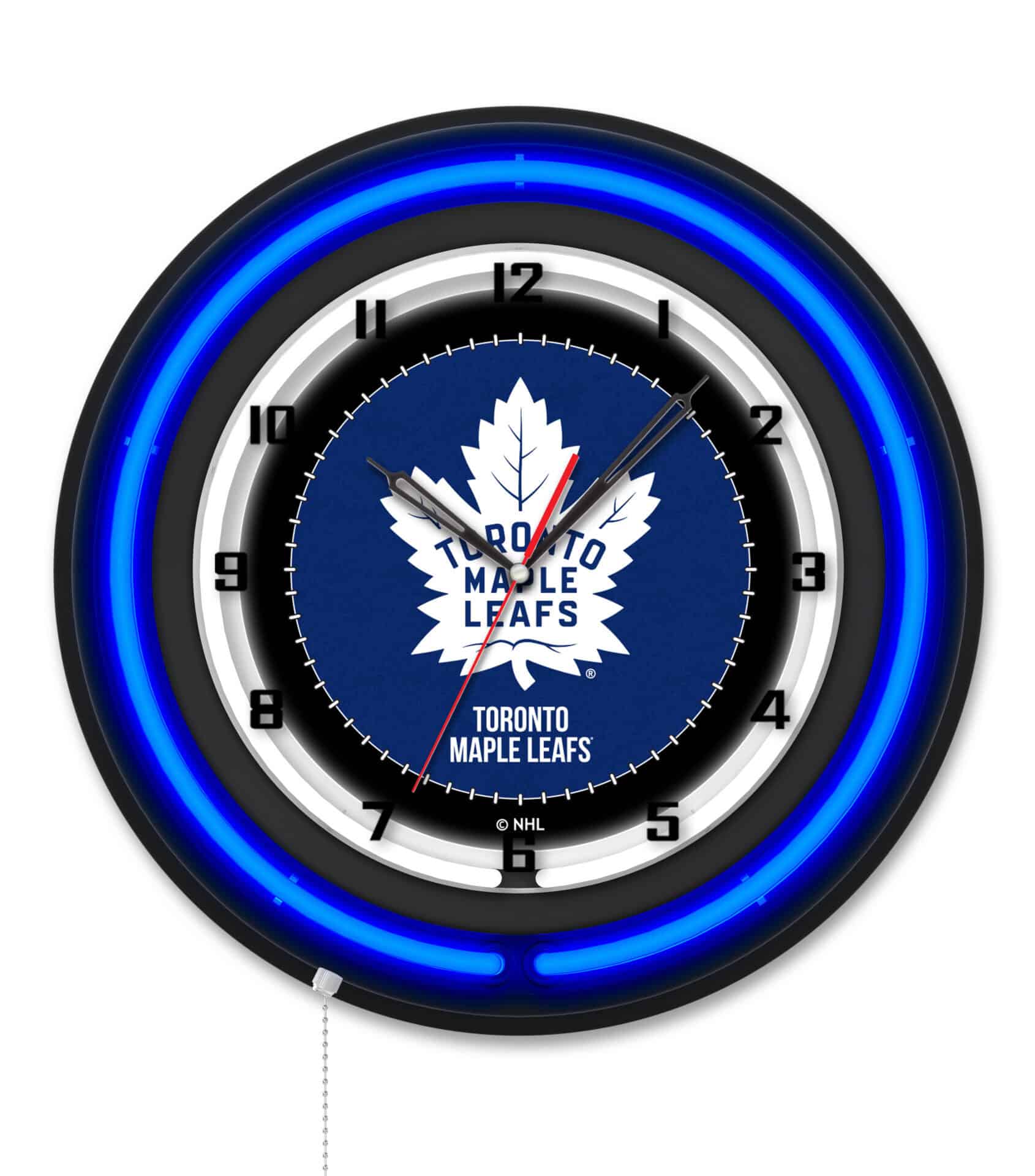 The Toronto Maple Leafs 19-Inch Double Neon Wall Clock in Black is the ultimate decor piece for any sports enthusiast’s man cave. This striking clock features a black casing complemented by vibrant team colors in the neon outer ring, creating a stunning visual display. The clock face is illuminated by a brilliant white inner neon ring, ensuring it stands out in any room. With easy operation through a pull chain and powered by a standard outlet, this clock combines functionality with team pride. Accurate quartz movement guarantees precise timekeeping, making it not just a decorative item but a reliable timepiece as well.