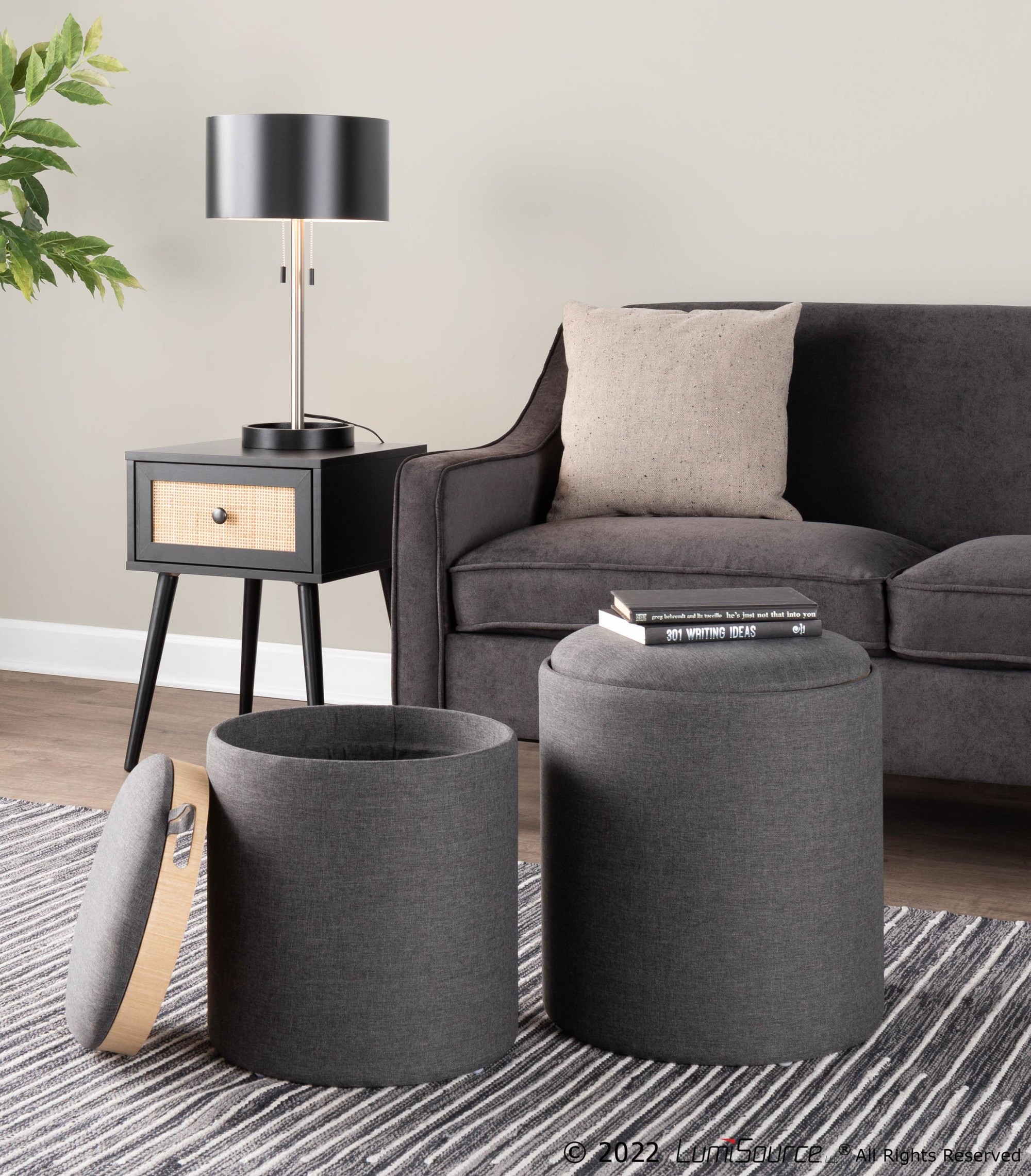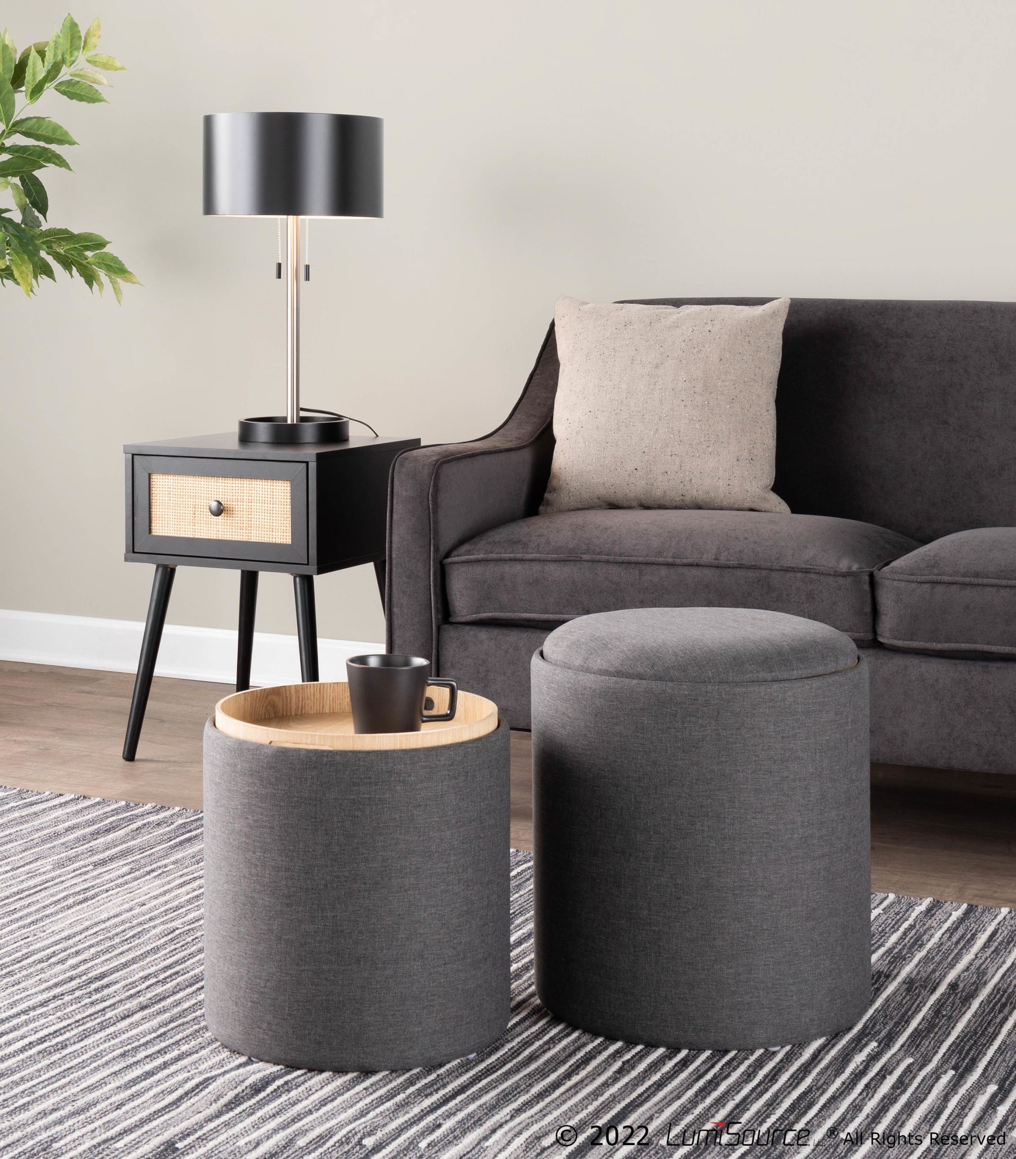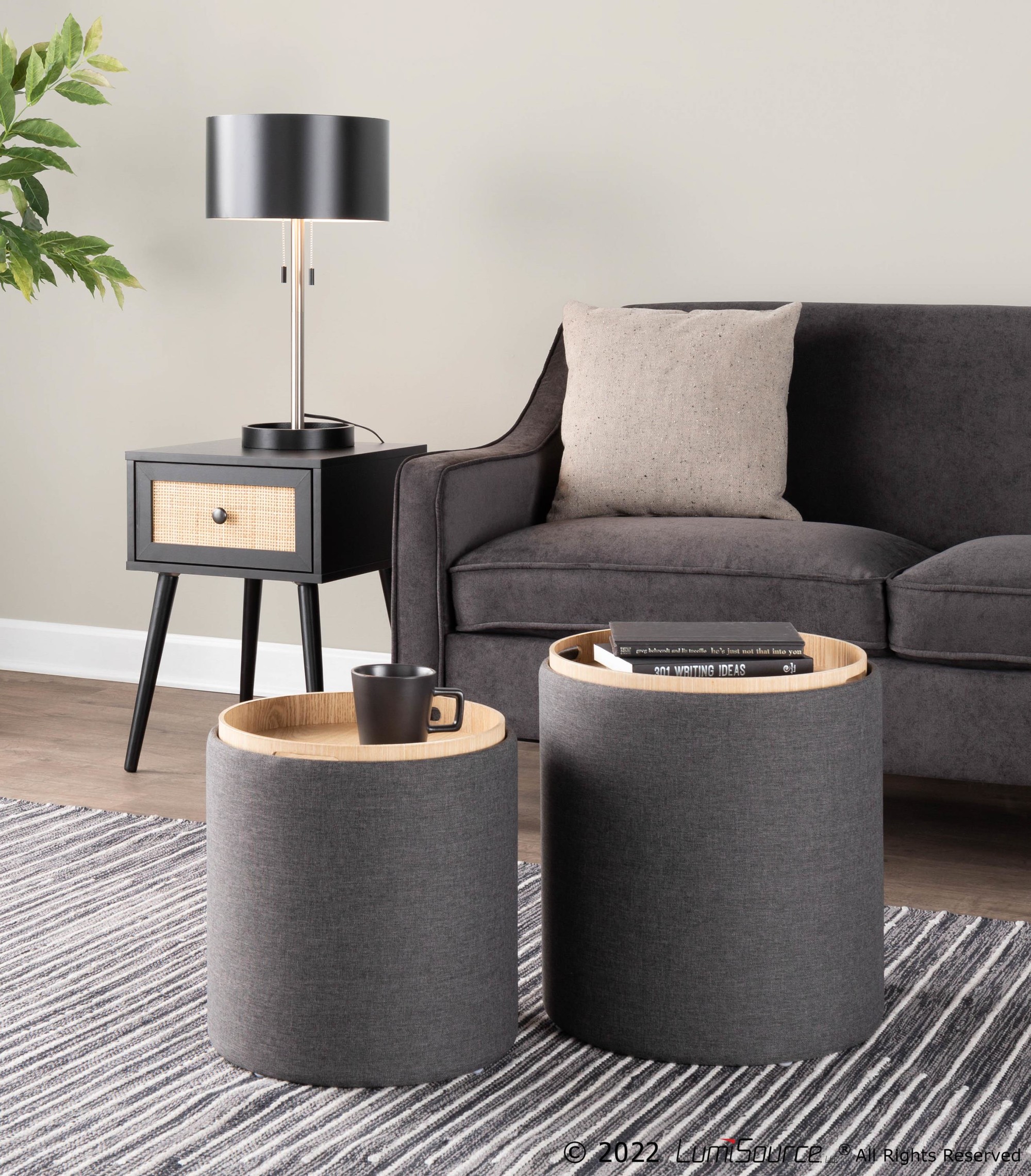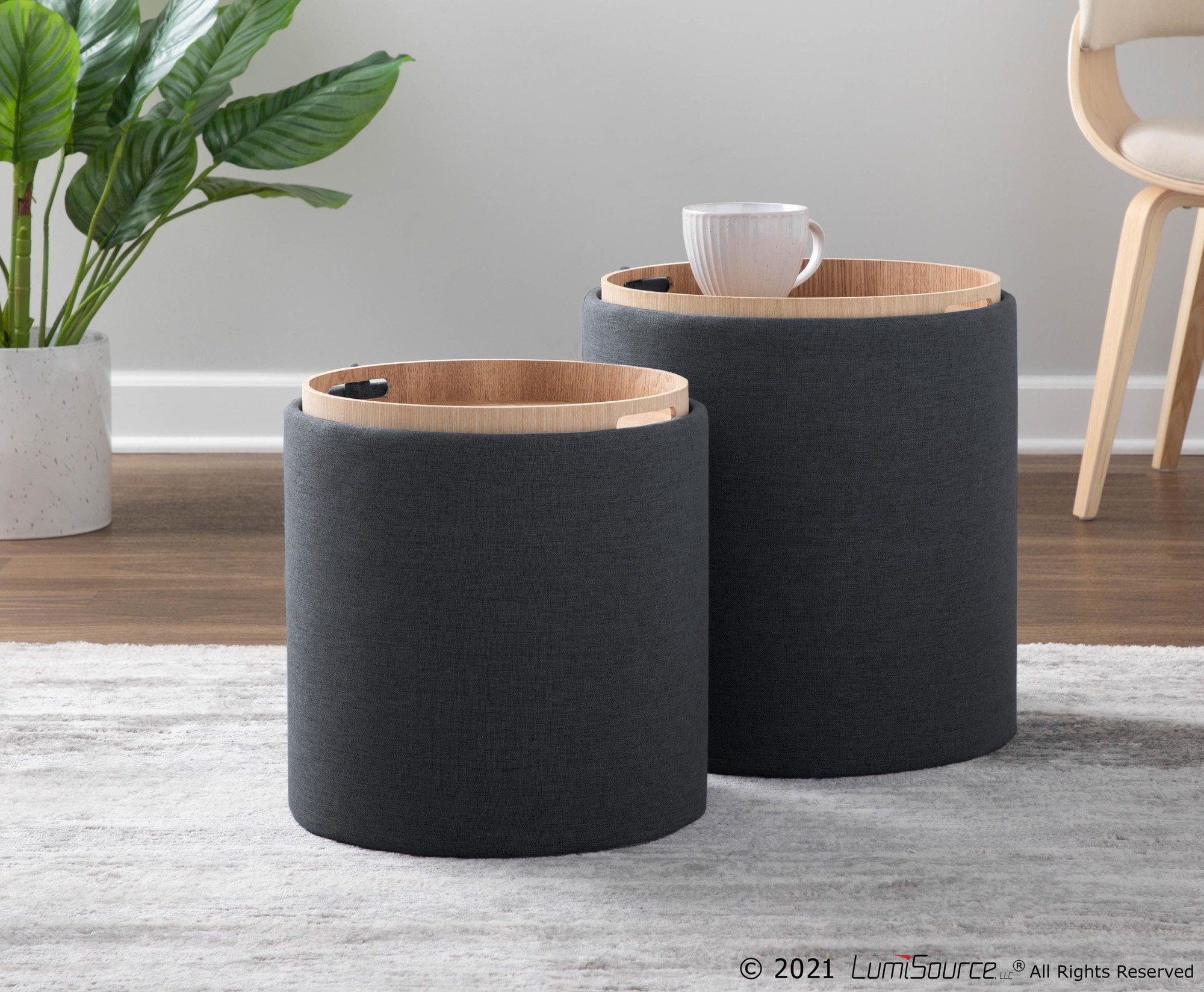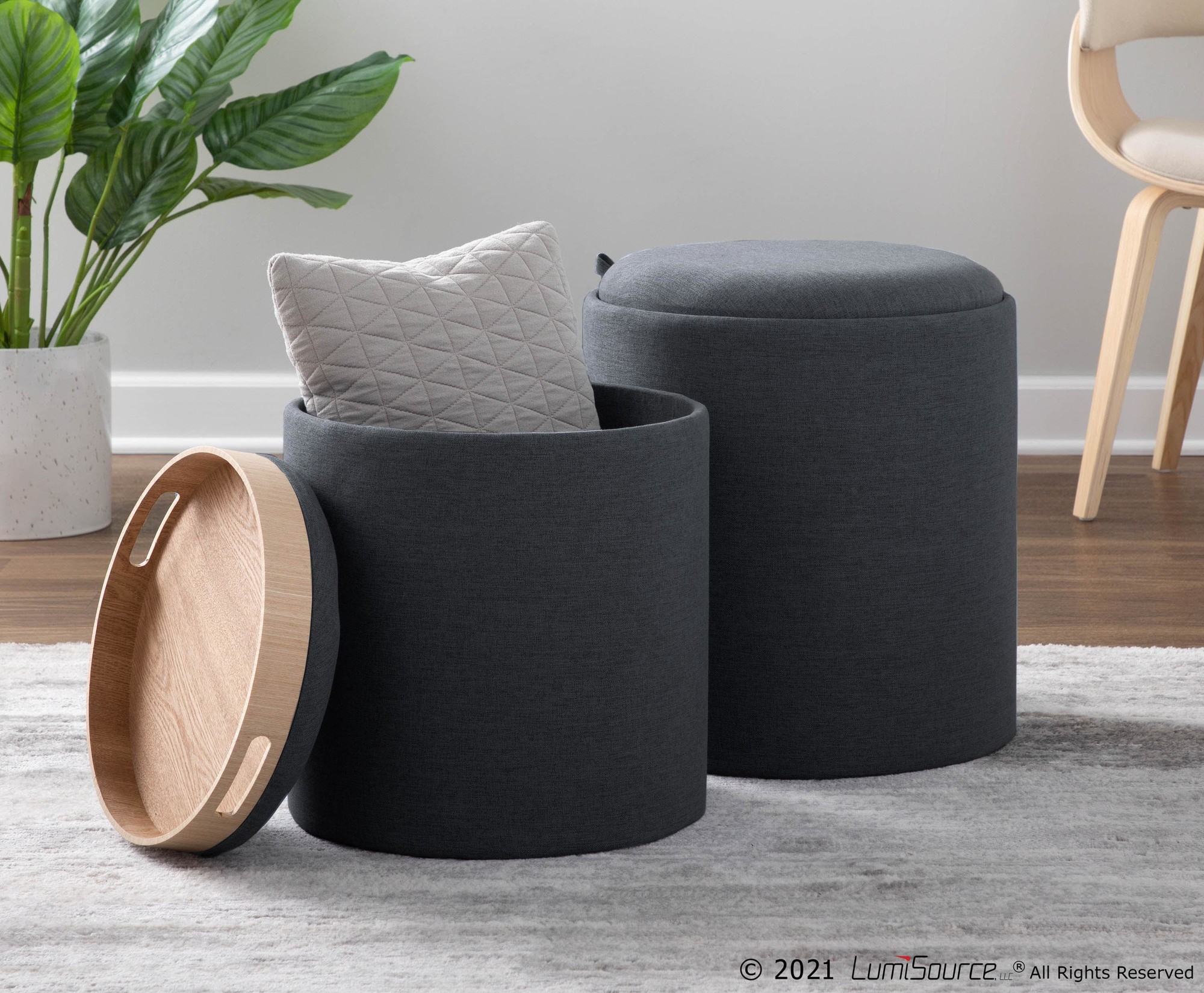 Enjoy the flexibility of using these ottomans individually or together. The removable lid reveals ample storage space, perfect for stowing away blankets, books, or other essentials. The natural wood tray adds a touch of elegance and practicality, making it ideal for entertaining or simply relaxing with a beverage.