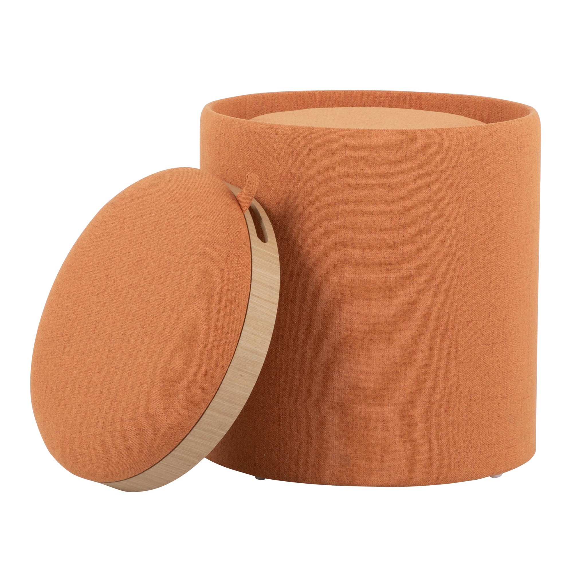 The smaller ottoman neatly nests inside the larger one, making it perfect for smaller spaces. Flip the top over to reveal a natural wood tray, ideal for snacks or drinks. Upholstered in stylish orange fabric, these ottomans will add a pop of color to any room.