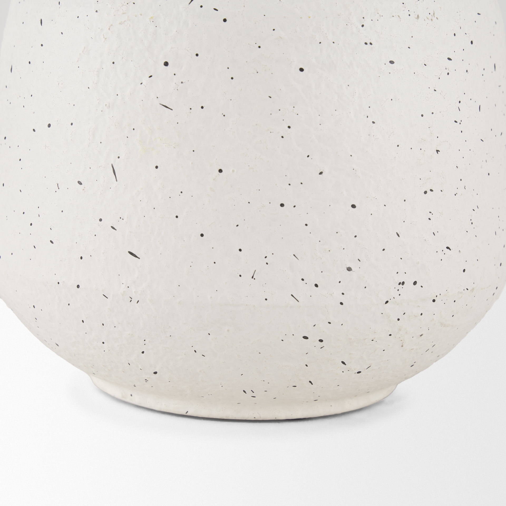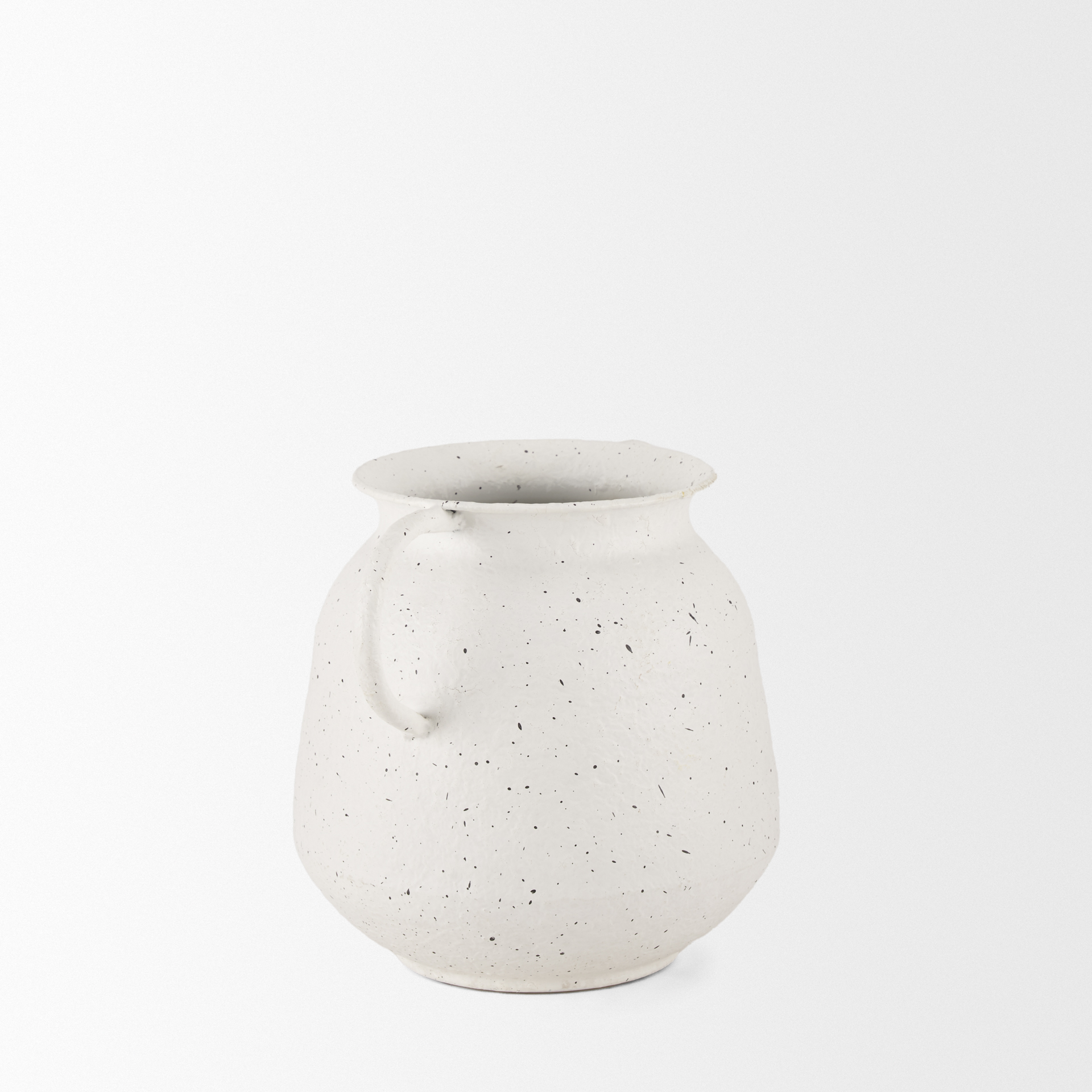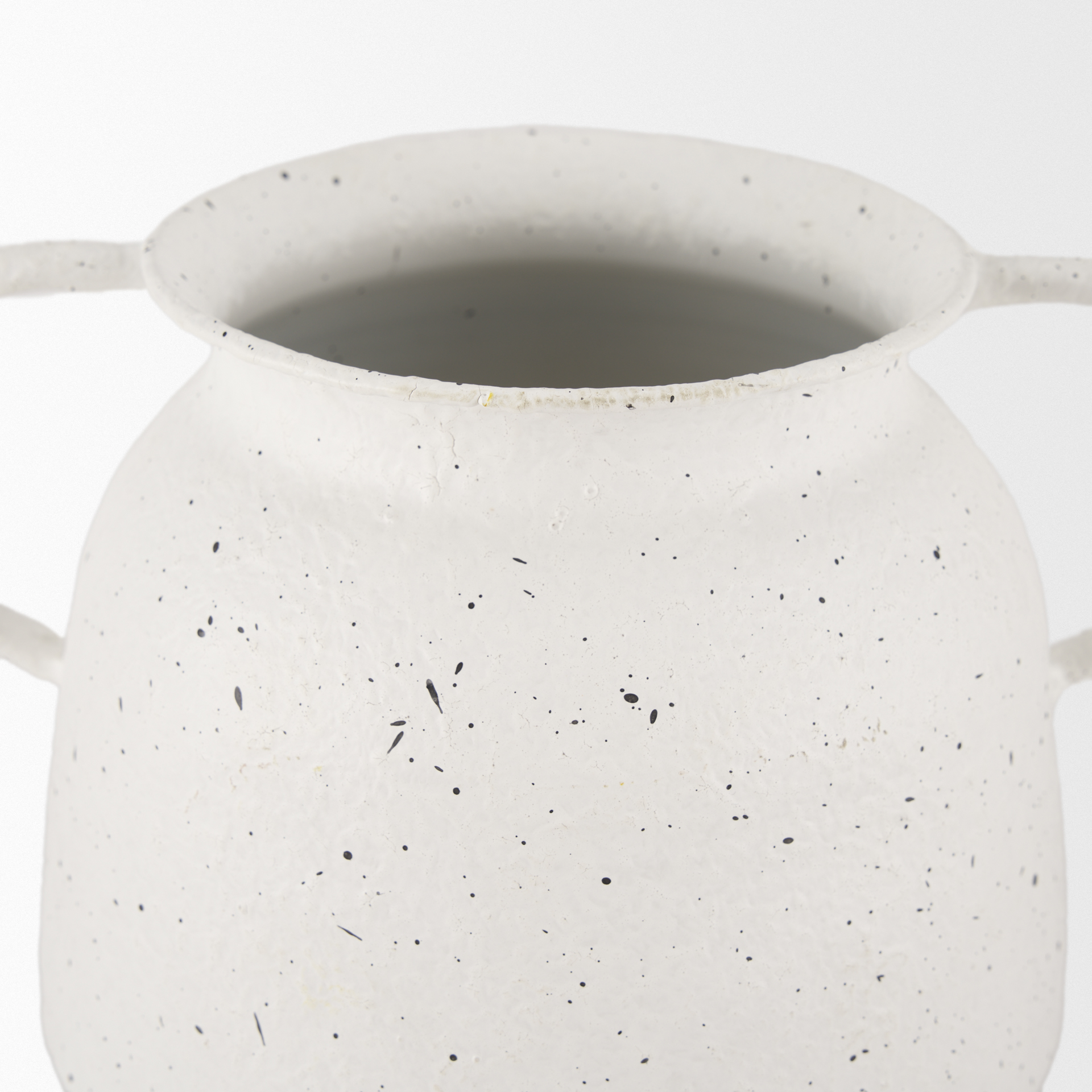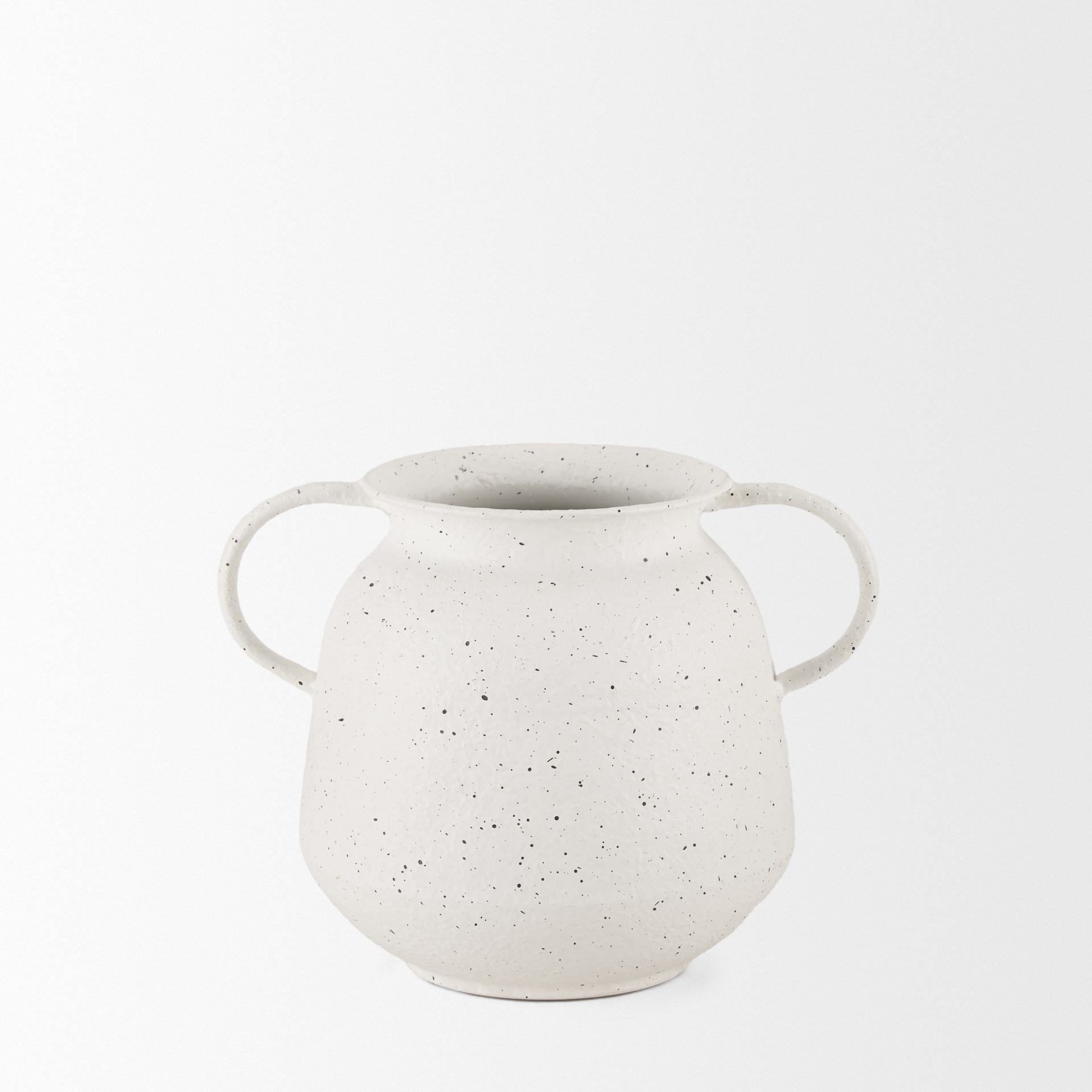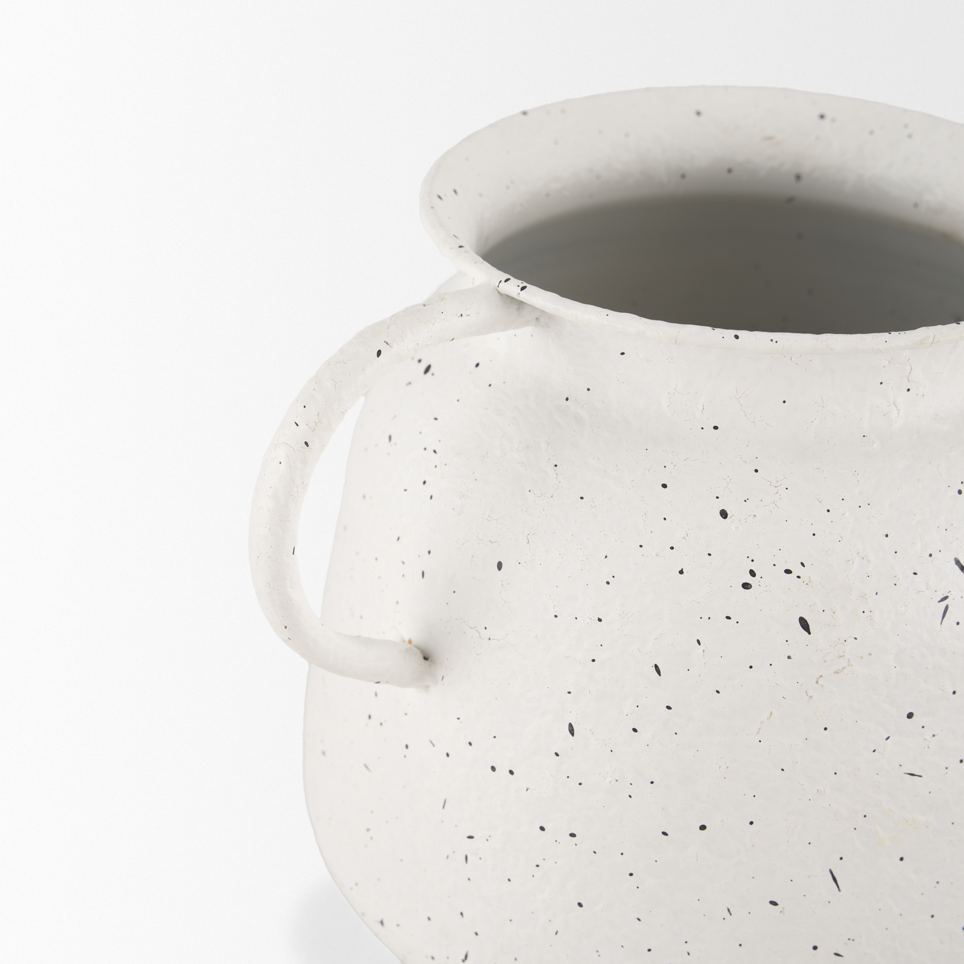 The Treva Vase is a lightweight metal vase featuring a matte white finish with subtle black speckling, providing a touch of rustic elegance to any space. Its textured surface and dual handles enhance its visual appeal. Perfect for showcasing on its own or with artificial floral arrangements, this vase effortlessly elevates your decor.