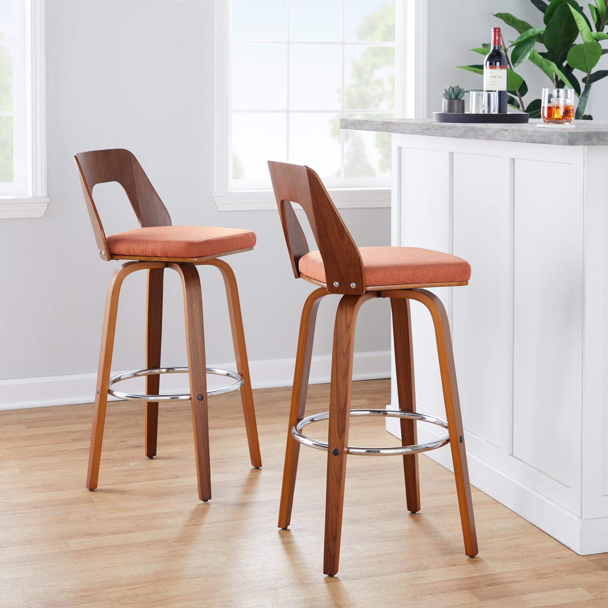 These Trilogy Barstools bring a cosmopolitan vibe to any space! Featuring sturdy bent wood construction and a sleek, retro shape, these barstools are as stylish as they are comfortable. The plush upholstered seat makes sitting for long periods a breeze.