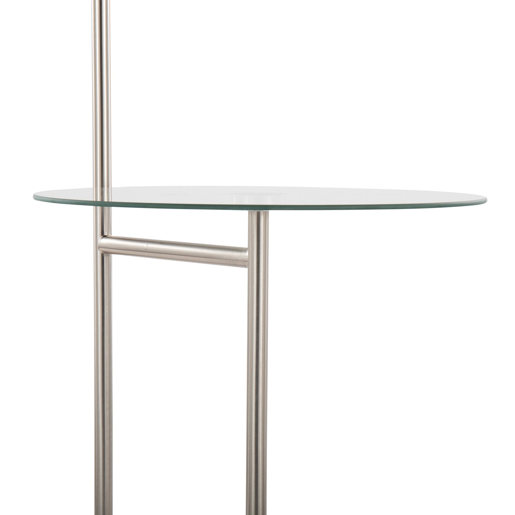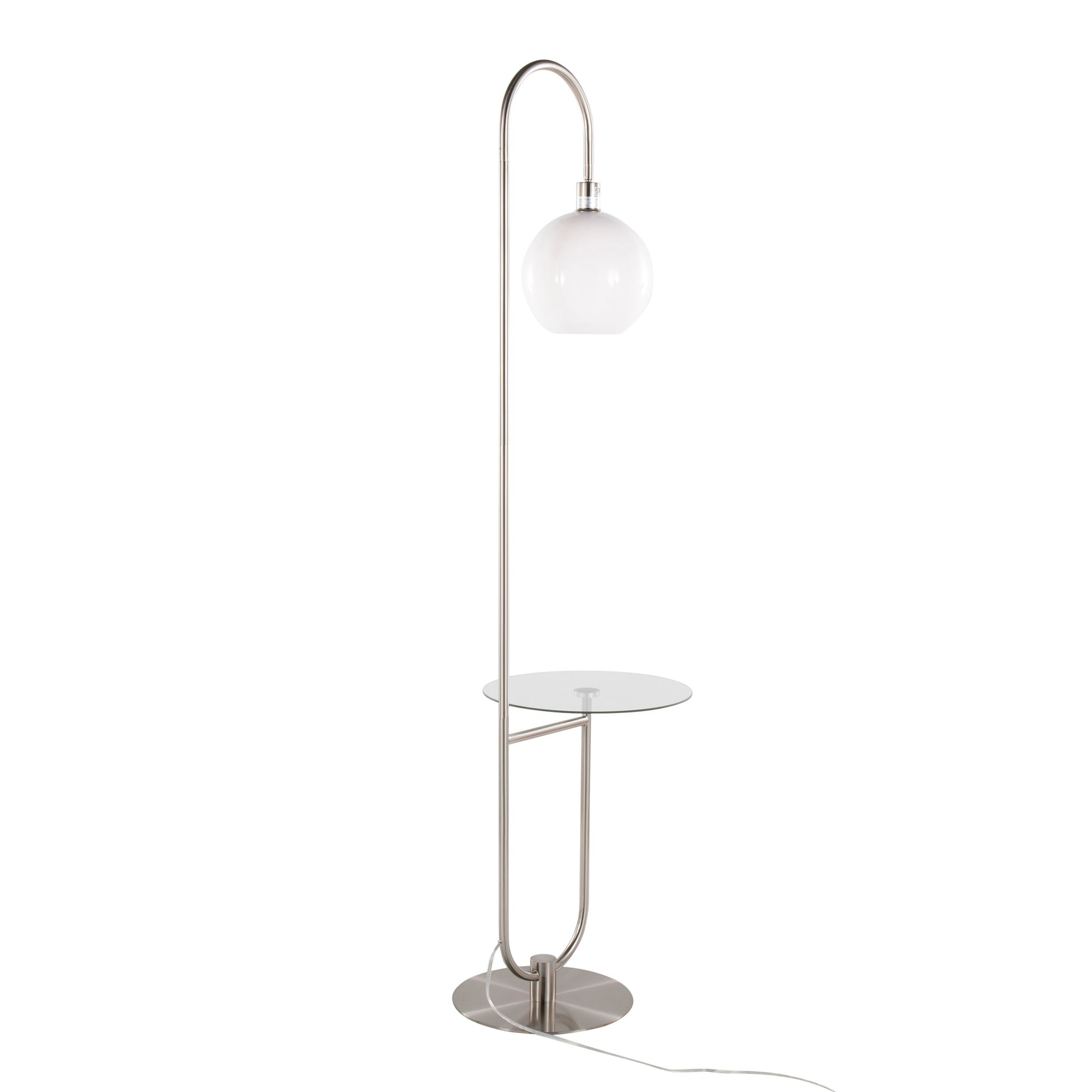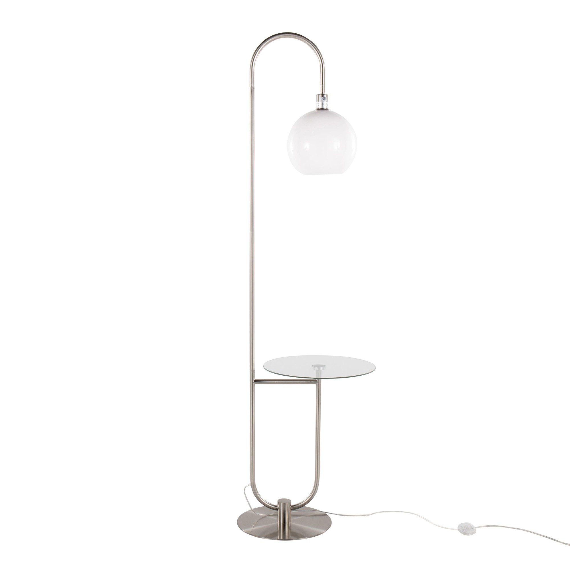 The Trombone Floor Lamp is a chic blend of materials creating a contemporary aesthetic perfect for any room. Its compact size makes it ideal for smaller spaces. The nickel frame, attached tempered glass table, and white round sconce combine to create a stylish accent next to sofas, chairs, or beds. Enjoy both illumination and convenience with this elegant floor lamp.