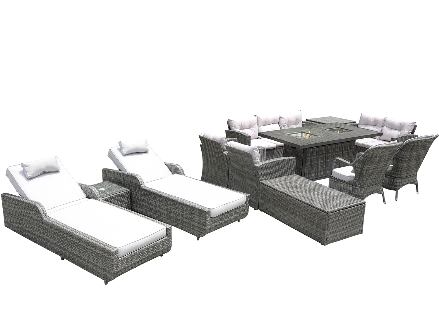 The Twelve Piece Outdoor Wicker Seating Group with Fire Pit combines comfort, style, and functionality for the ultimate outdoor entertainment experience. Designed with a wicker rattan outer frame, this set provides a luxurious and durable seating solution. Featuring a chaise lounge, loveseat, and a fire pit table, it’s perfect for relaxing, entertaining, and enhancing your outdoor space. The inclusion of white cushions adds a touch of elegance, while the built-in storage ensures your outdoor area stays organized and tidy.