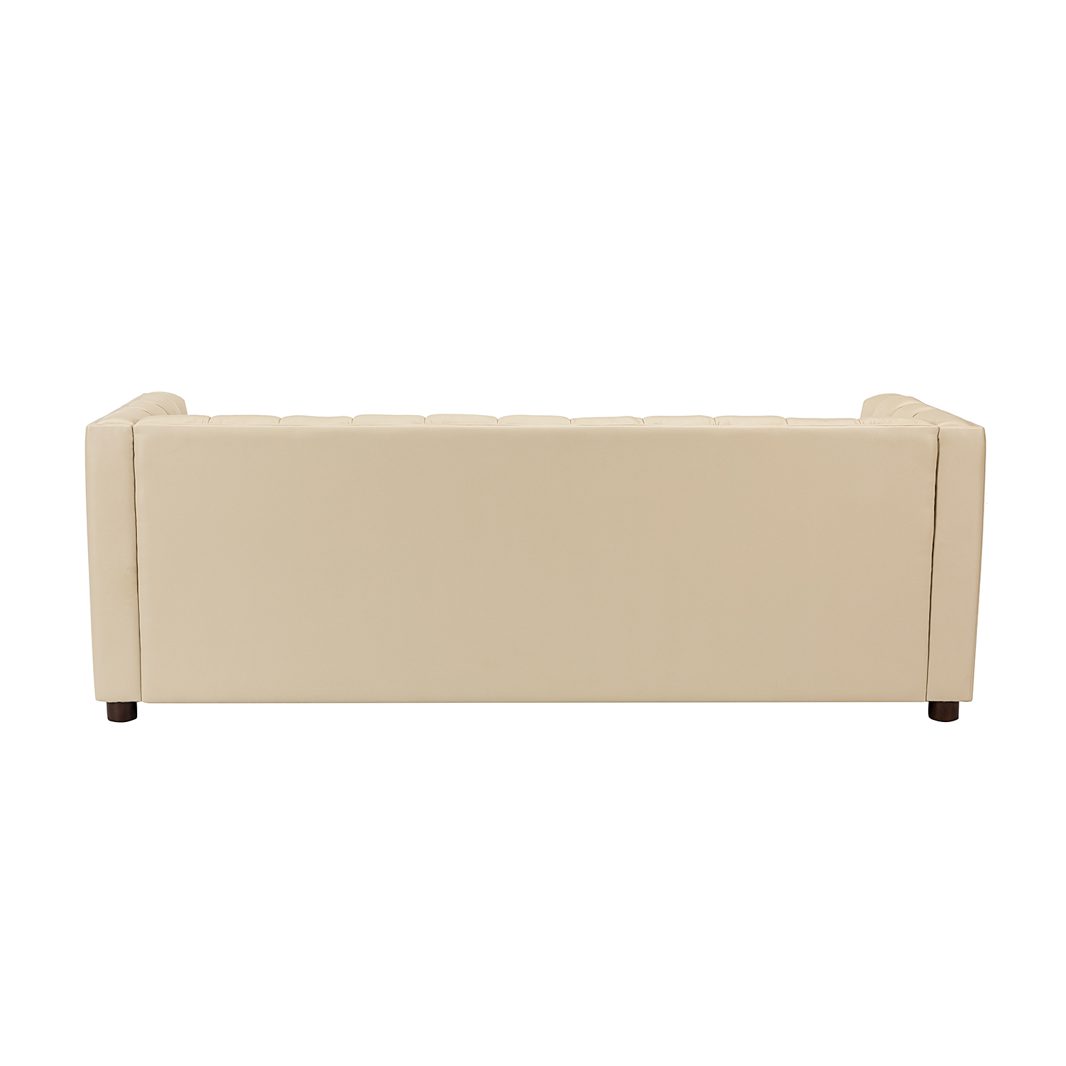 Sink into the Ulysses Beige Genuine Leather Channel Tufted Sofa and transform your living space! This sofa isn’t just seating; it’s an invitation to unwind after a long day. Featuring a durable wooden frame, luxurious genuine leather, and a supportive spring system, this sofa is designed for years of comfort and relaxation. Its channel-tufted details and solid wood legs add a touch of elegance to any room. Get ready to make this sofa the centerpiece of your relaxation zone!
