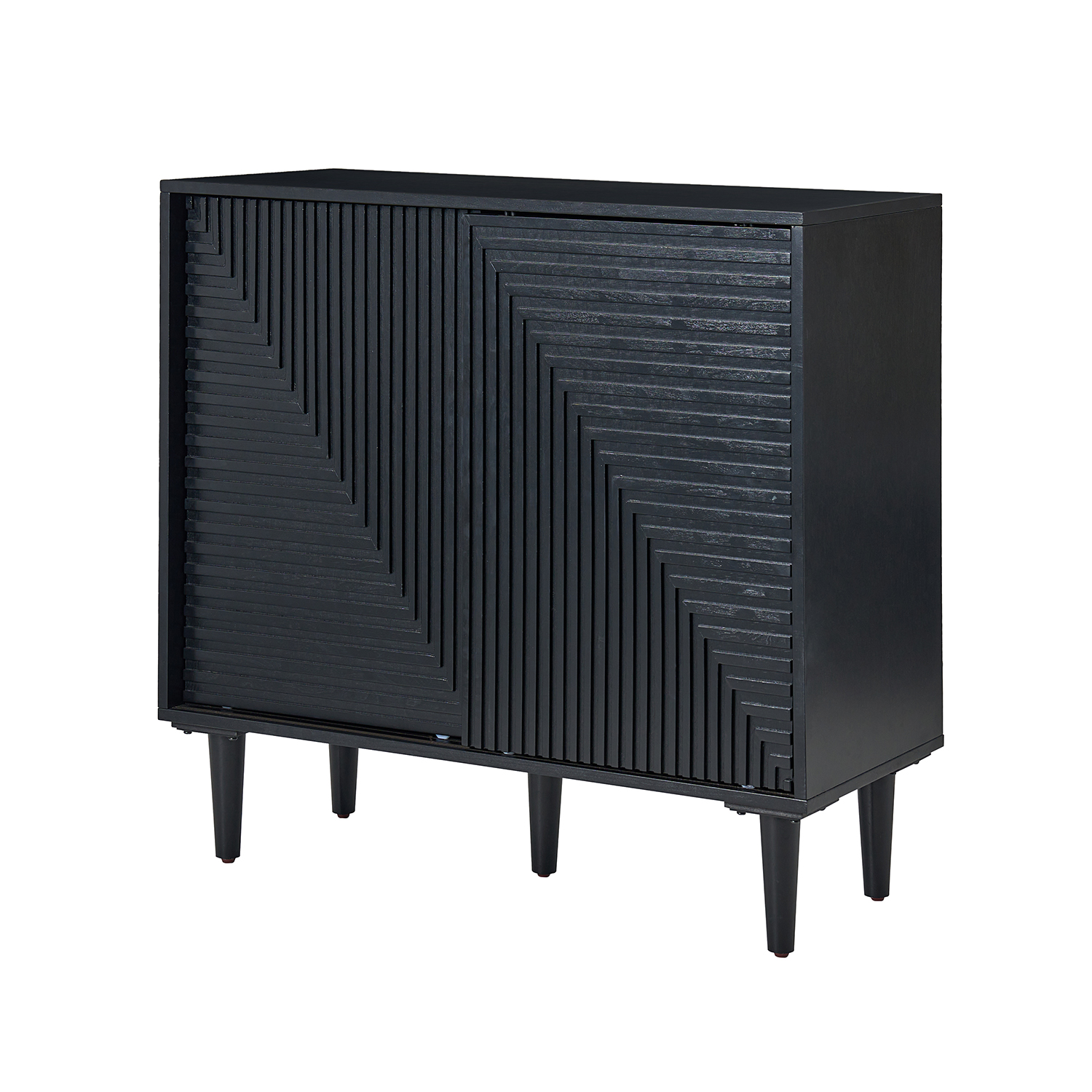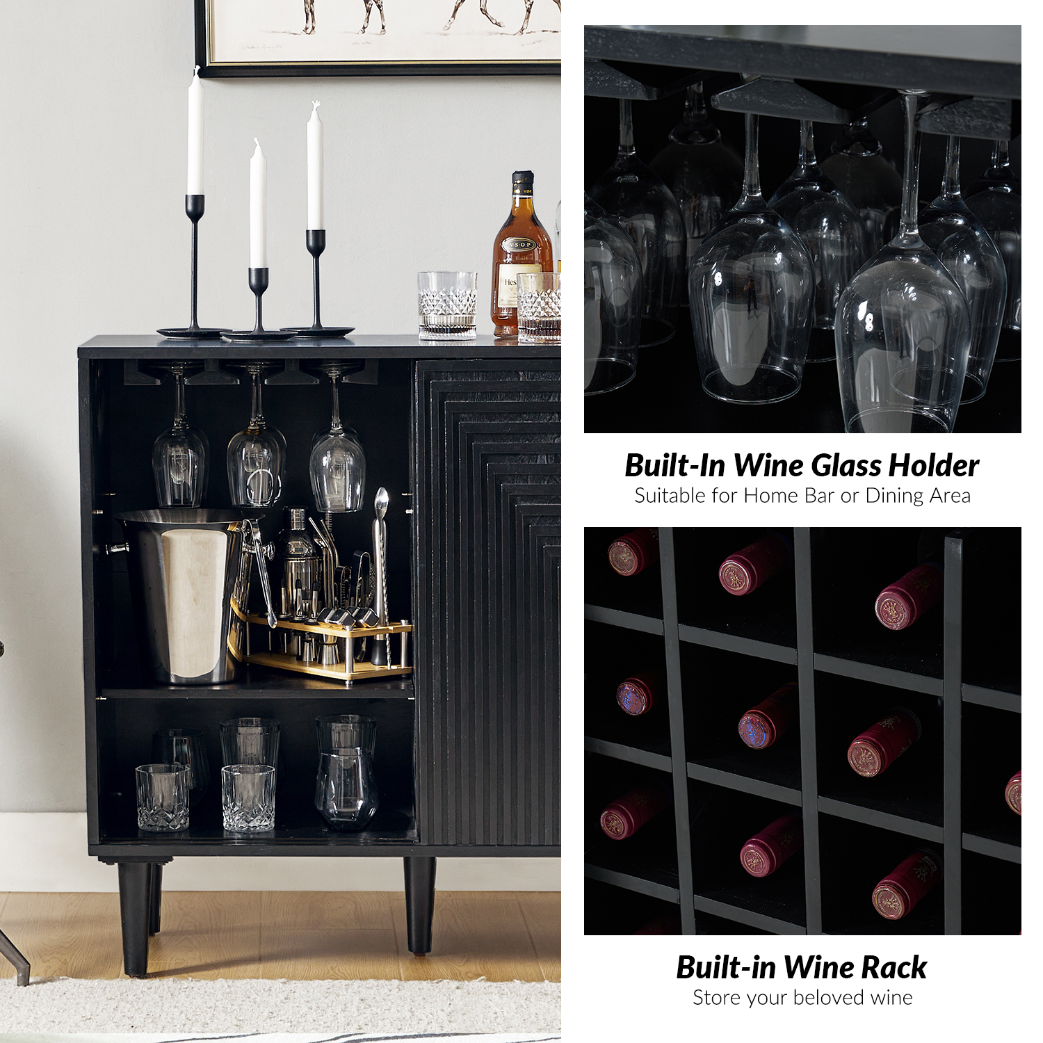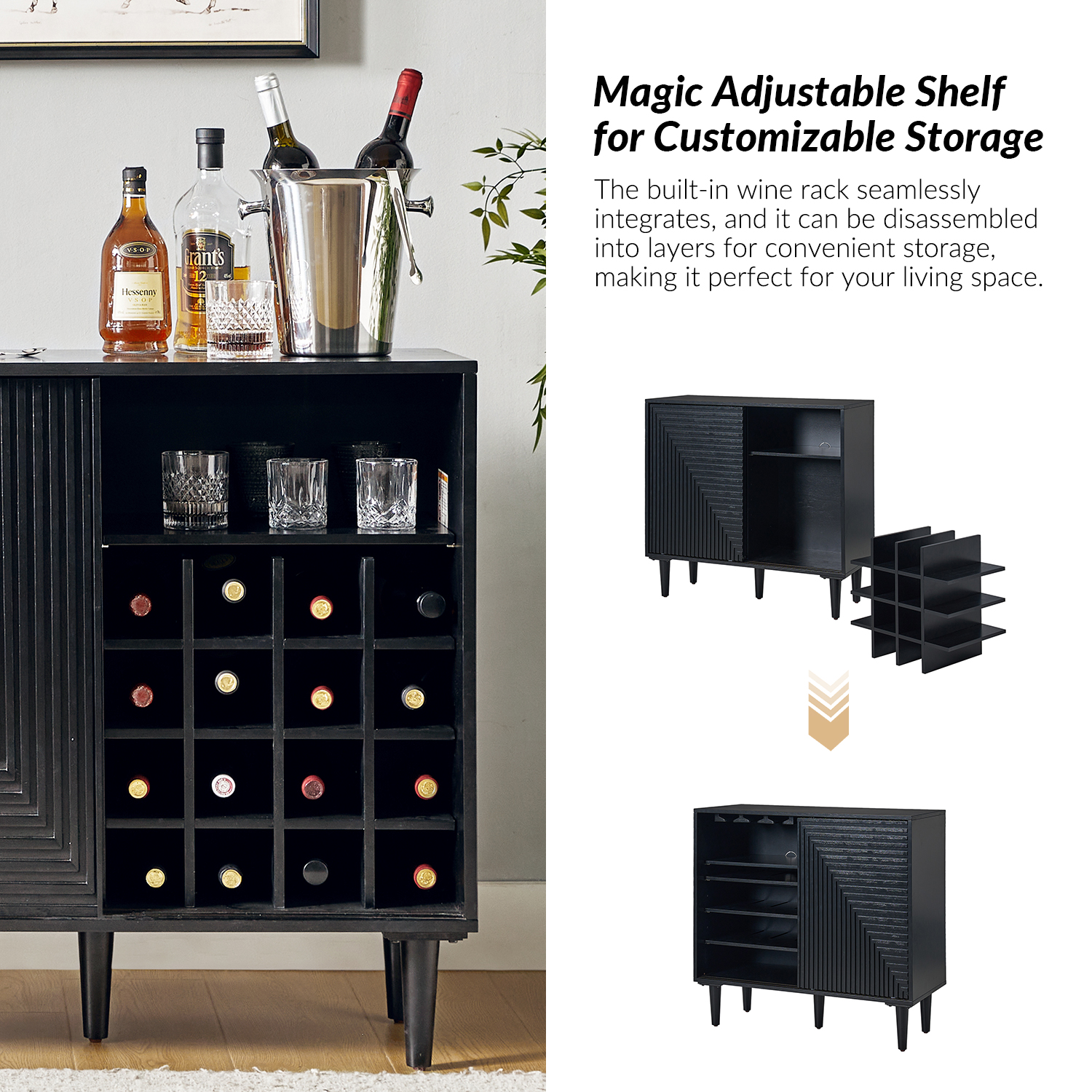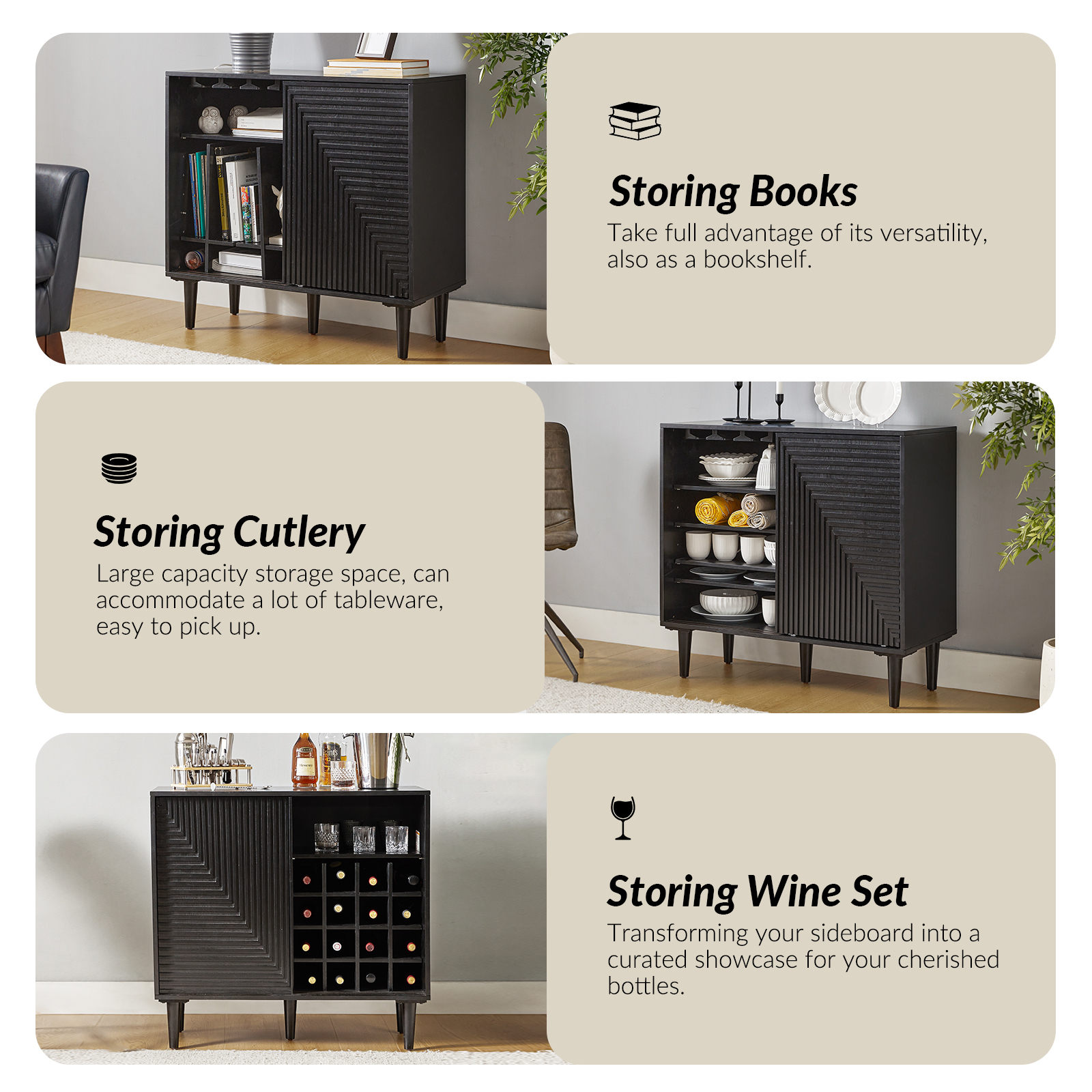 The Undine Black Mid-Century Modern Bar Buffet Cabinet is a stylish and functional addition to any space. It offers versatile storage with a touch of artisanal charm. This cabinet can be used as a buffet, bar, or coffee cabinet, adapting to your needs.