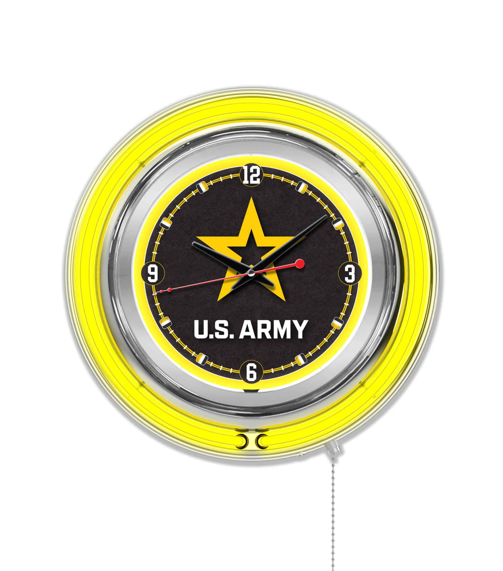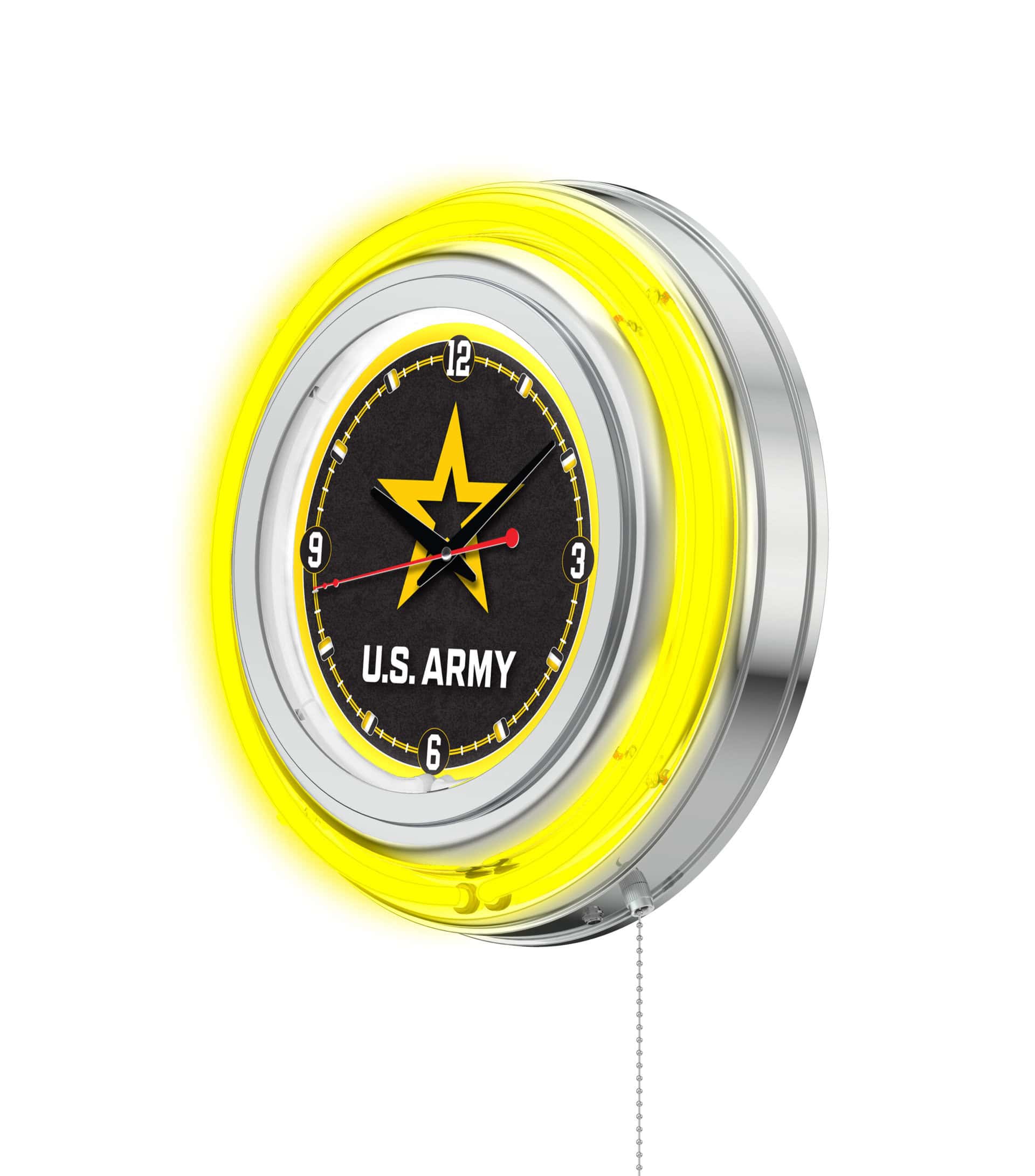 The United States Army 15-Inch Neon Logo Clock in Chrome is a striking addition to any man cave, showcasing vibrant artwork and a sleek design that pays tribute to our troops. Featuring a chrome casing and a neon outer ring, this clock is not only functional but also a bold statement piece. The clock face is illuminated by a brilliant white inner neon ring, creating a captivating visual effect. Easy operation is ensured with a pull chain on the bottom of the clock for turning the neon lights on and off, while the accurate quartz movement guarantees precise timekeeping.