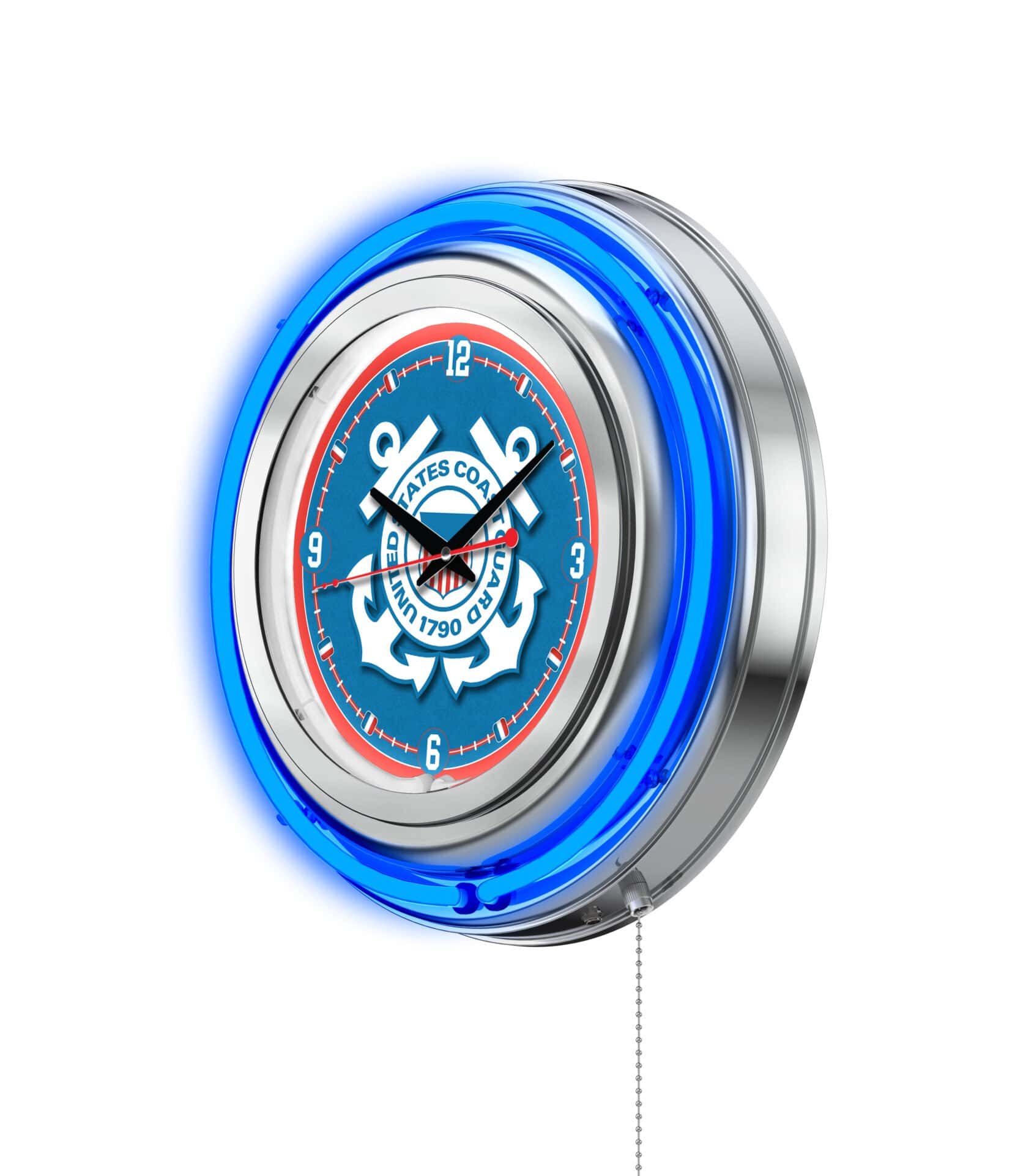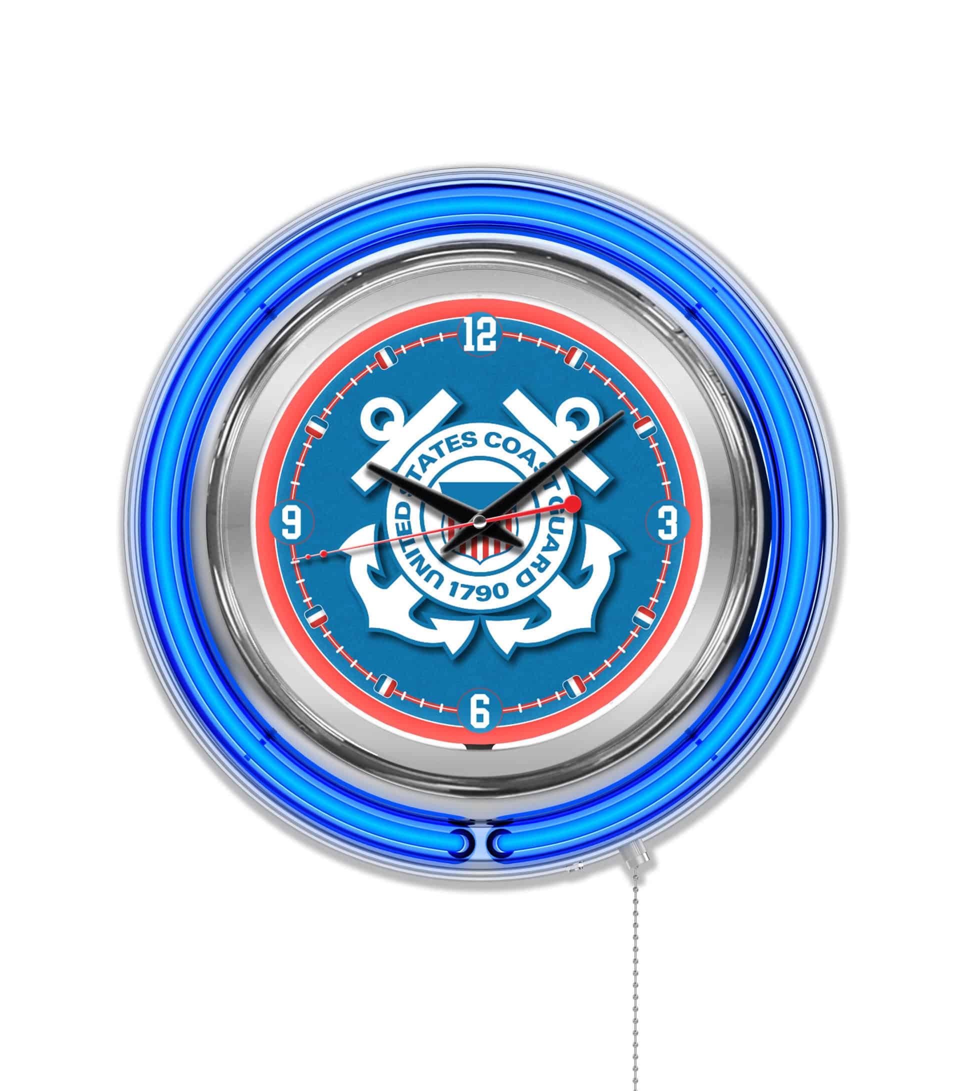The United States Coast Guard 15-Inch Neon Logo Clock in Chrome is an eye-catching addition to any man cave, showcasing your support for our troops with style. Featuring a stunning chrome casing, this clock is designed with vibrant, full-color artwork and double neon tubes, including one accent color and a brilliant white inner ring that illuminates the clock face. The easy-to-use pull chain allows for simple on/off operation, while the quartz movement ensures accurate timekeeping. This clock is not just a decorative piece; it’s a reliable timepiece powered by a standard 120V outlet and a single AA battery (not included).