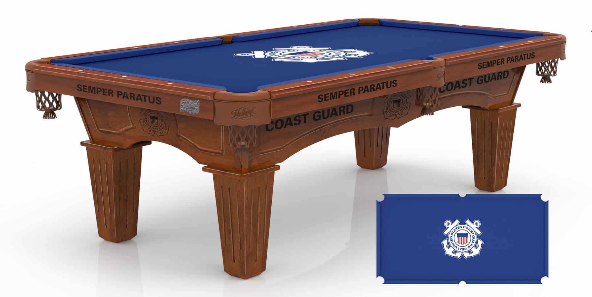 The United States Coast Guard Pool Table with Chardonnay Finish and Tapered Leg is a professional-quality pool table designed to deliver exceptional performance and stunning aesthetics. Featuring a solid double-arched cabinet with laser-engraved logo art, this table is built for durability and style. Its furniture-quality finish, high-grade materials, and precision engineering ensure a superior playing experience. The elegant Chardonnay finish complements most room settings, while the hand-carved ball and tapered legs provide timeless appeal. With its premium Hainsworth worsted cloth, this table guarantees smooth, consistent ball play, making it a standout addition to any game room.