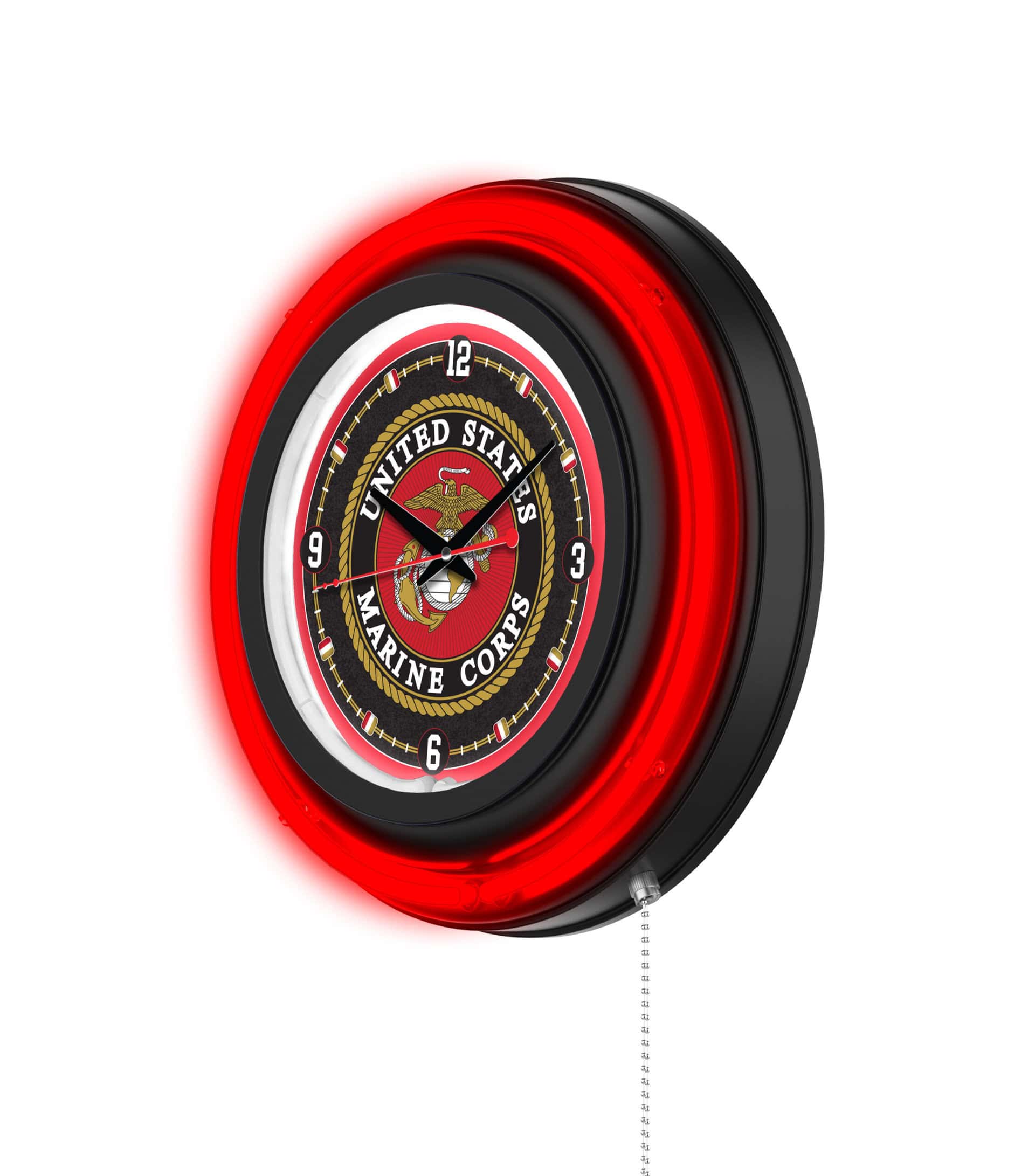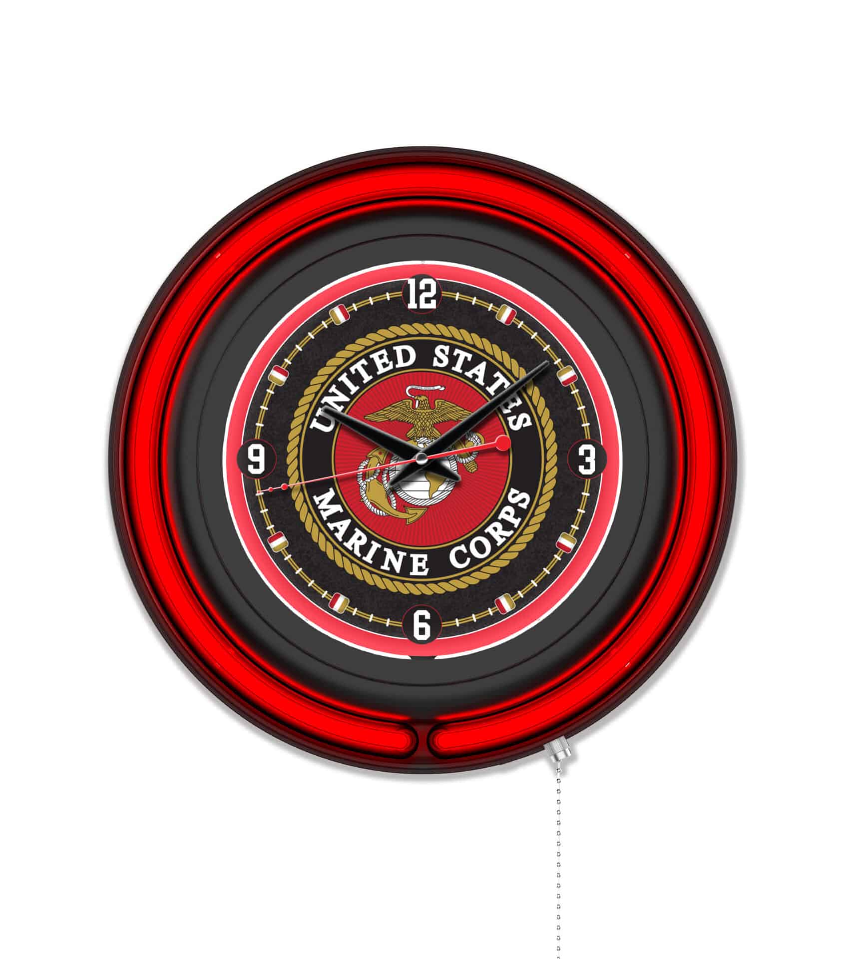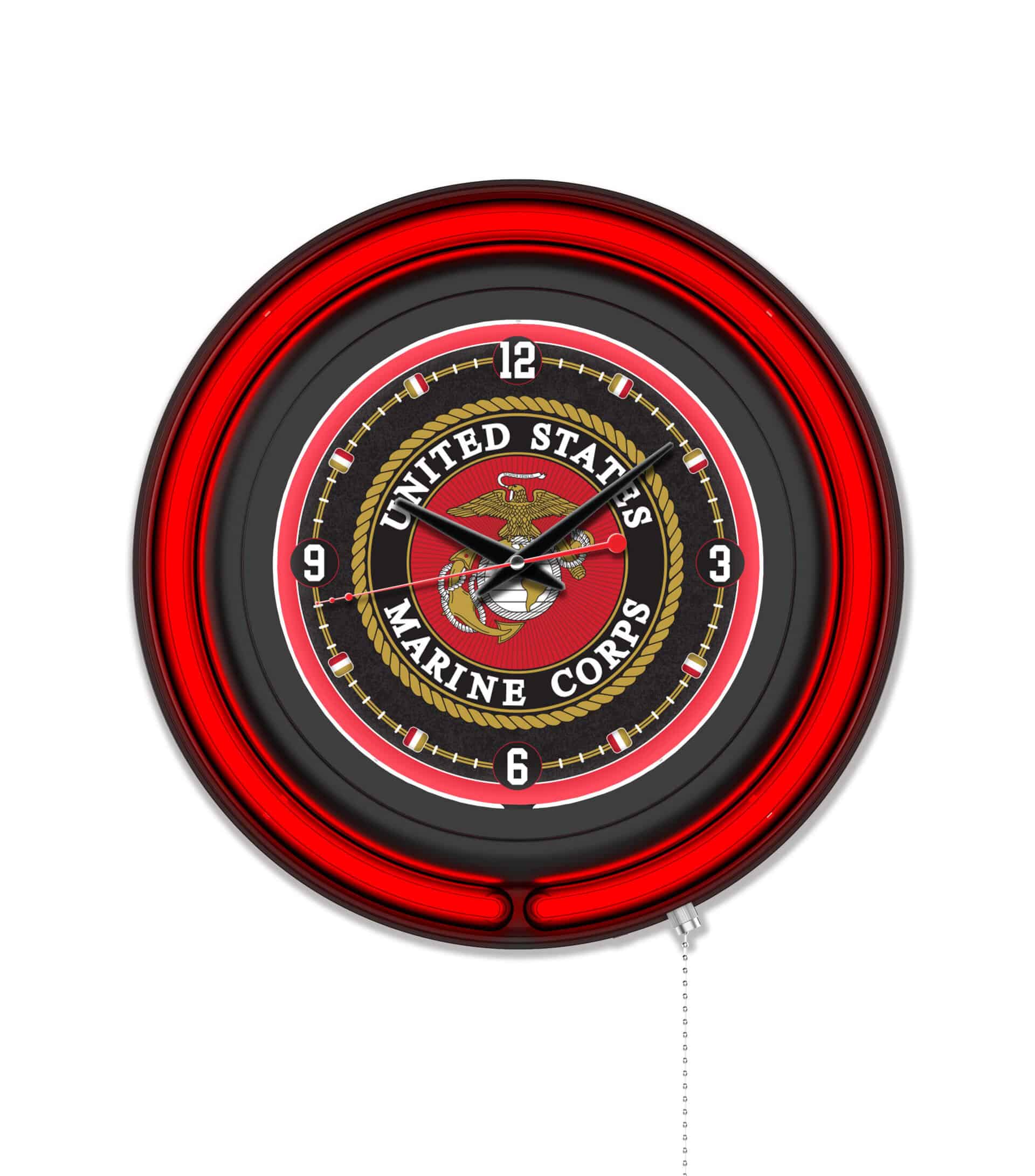 This vibrant United States Marine Corps 15-Inch Neon Logo Clock in Black is the perfect addition to any man cave, showcasing your support for our troops while enhancing your decor. Featuring a striking black casing and a color-specific neon outer ring, this clock is not only functional but also a stunning focal point. The brilliant white inner neon ring illuminates the custom printed clock face, ensuring visibility at all times. The neon rings can be easily turned on and off using a convenient pull chain located at the bottom of the clock. Powered by a UL Listed transformer that connects to a standard 120V outlet, this clock also boasts accurate quartz movement, ensuring you always know the time.