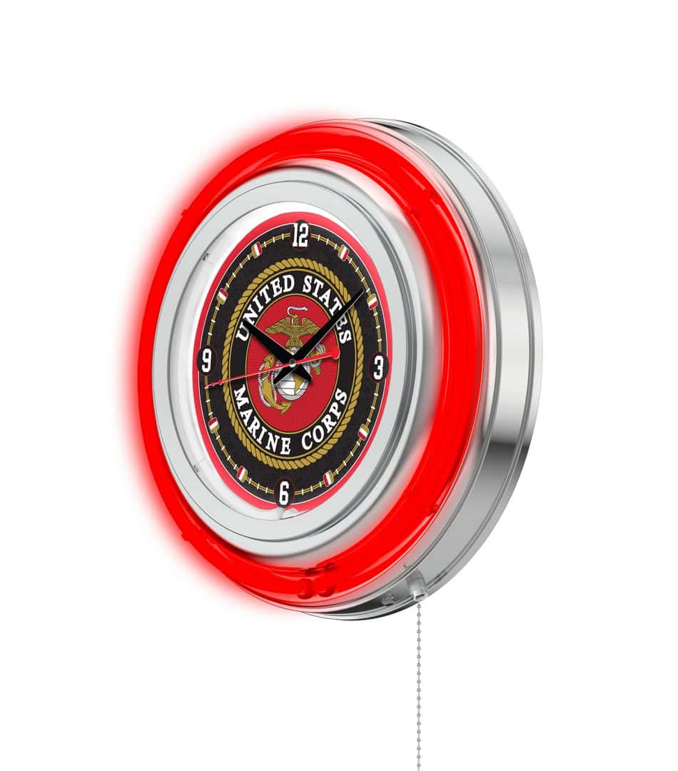 The United States Marine Corps 15-Inch Neon Logo Clock in Chrome is the ultimate statement piece for any fan of the armed forces. With its striking design and vibrant colors, this clock not only keeps accurate time but also showcases your support for our troops. The clock features a chrome casing with an eye-catching neon outer ring, while the custom printed clock face is illuminated by a bright white inner neon ring. Conveniently, the neon lights can be easily turned on and off using a pull chain located at the bottom of the clock. Powered by a UL Listed transformer for standard 120V outlets, this clock combines functionality with patriotic flair.