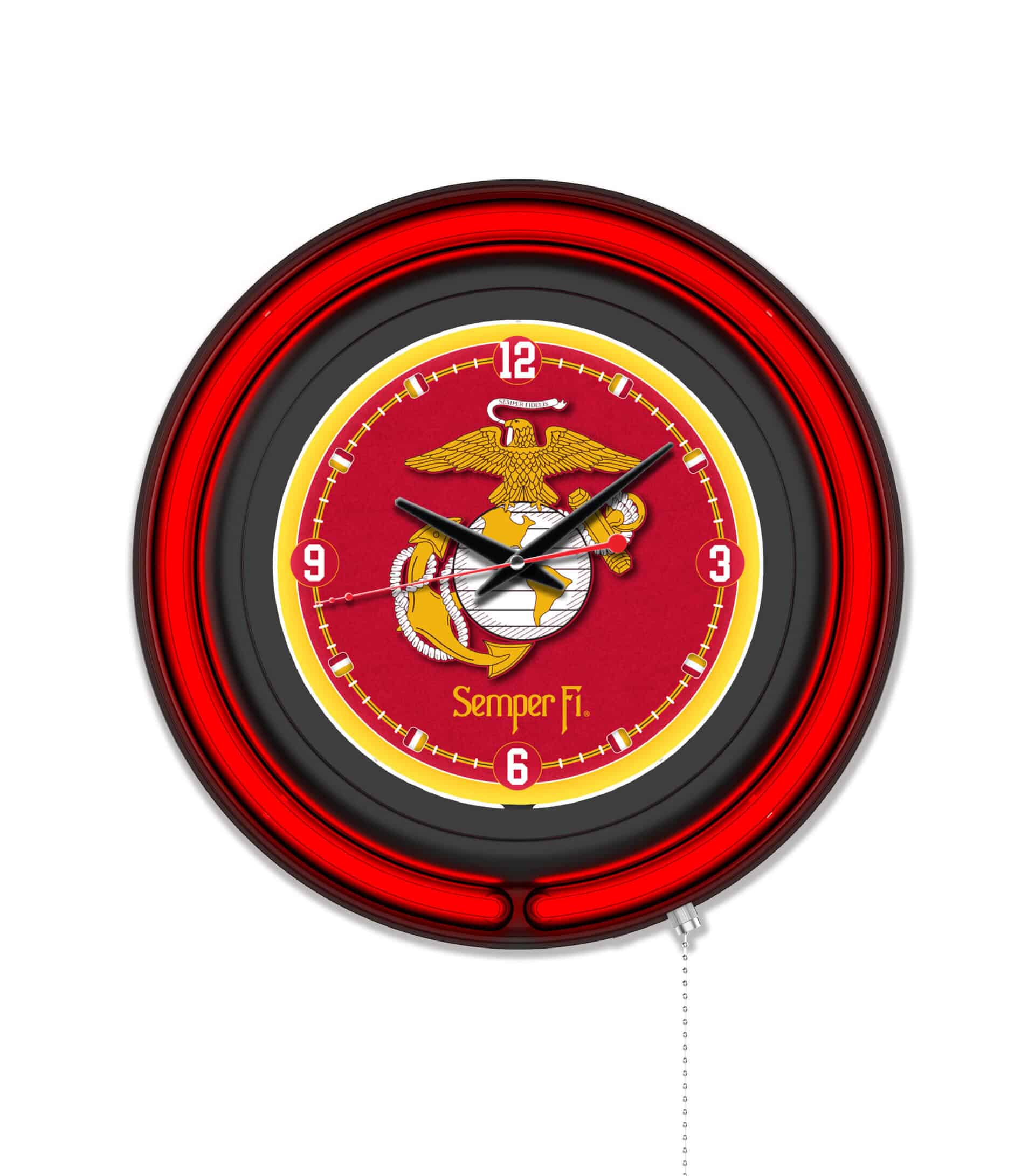 The United States Marine Corps (Red/Yellow) 15-Inch Neon Logo Clock in Black is the perfect addition to any man cave, showcasing your support for the troops. This eye-catching clock features a sleek black casing with vibrant neon rings that enhance the custom printed clock face. The brilliant white inner neon ring illuminates the clock, making it a standout piece in any room. With easy ON/OFF operation via a pull chain and a reliable quartz movement powered by a single AA battery, this clock combines style and functionality seamlessly.