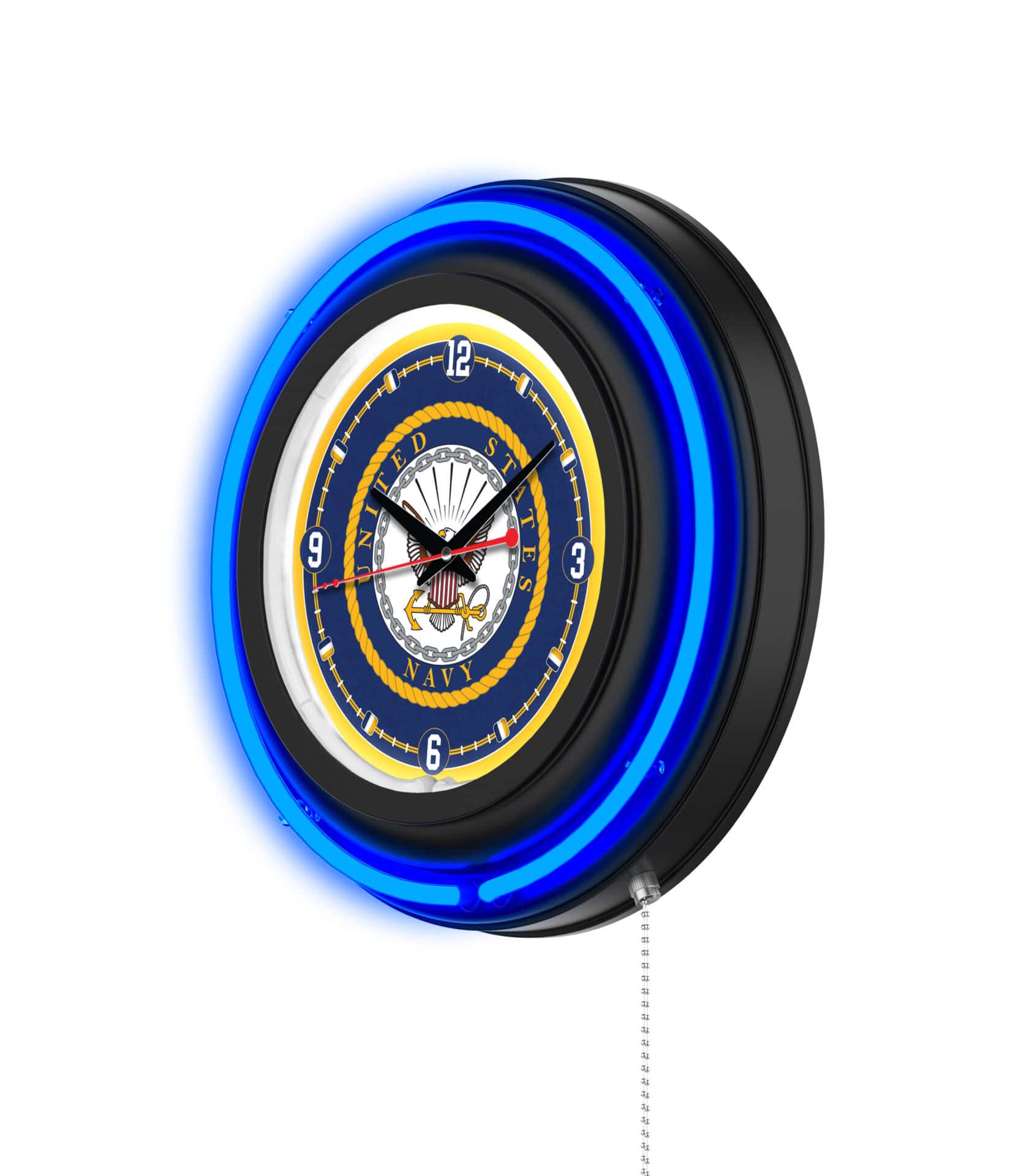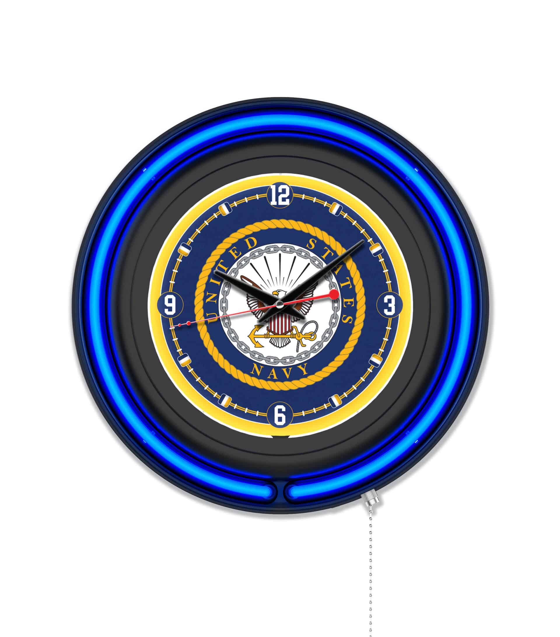 The United States Navy 15-Inch Neon Logo Clock in Black is the perfect addition to any man cave, showcasing your support for our troops with vibrant neon illumination. This clock features a striking black casing that beautifully highlights the custom printed clock face, illuminated by a brilliant white inner neon ring. The neon rings can be easily activated with a pull chain, making it convenient to switch on and off. Powered by a UL Listed transformer and standard 120V outlet, this clock combines style with functionality. With accurate quartz movement, it ensures precise timekeeping, requiring only a single AA battery (not included). Enjoy the satisfaction of owning a clock that embodies quality craftsmanship.