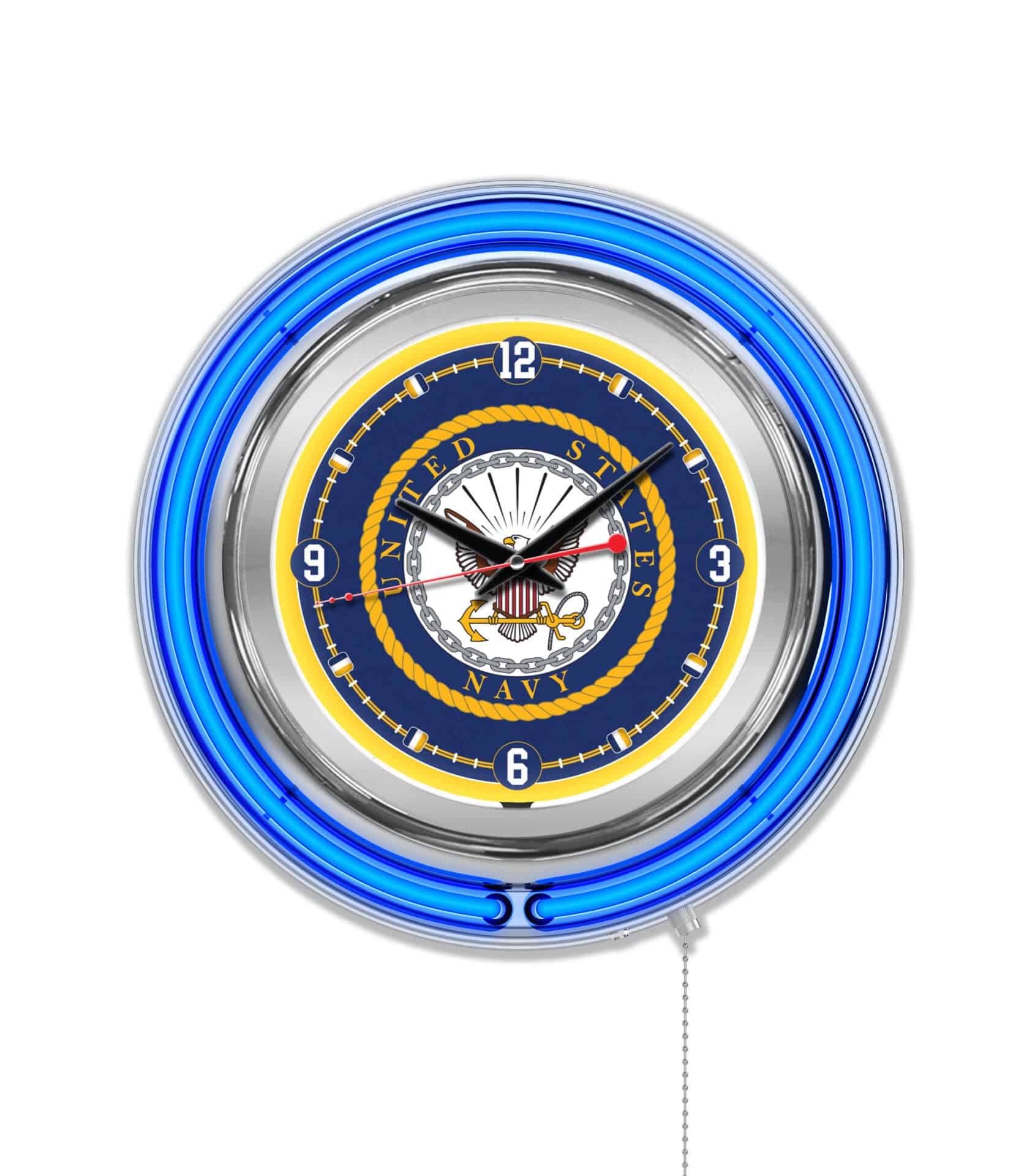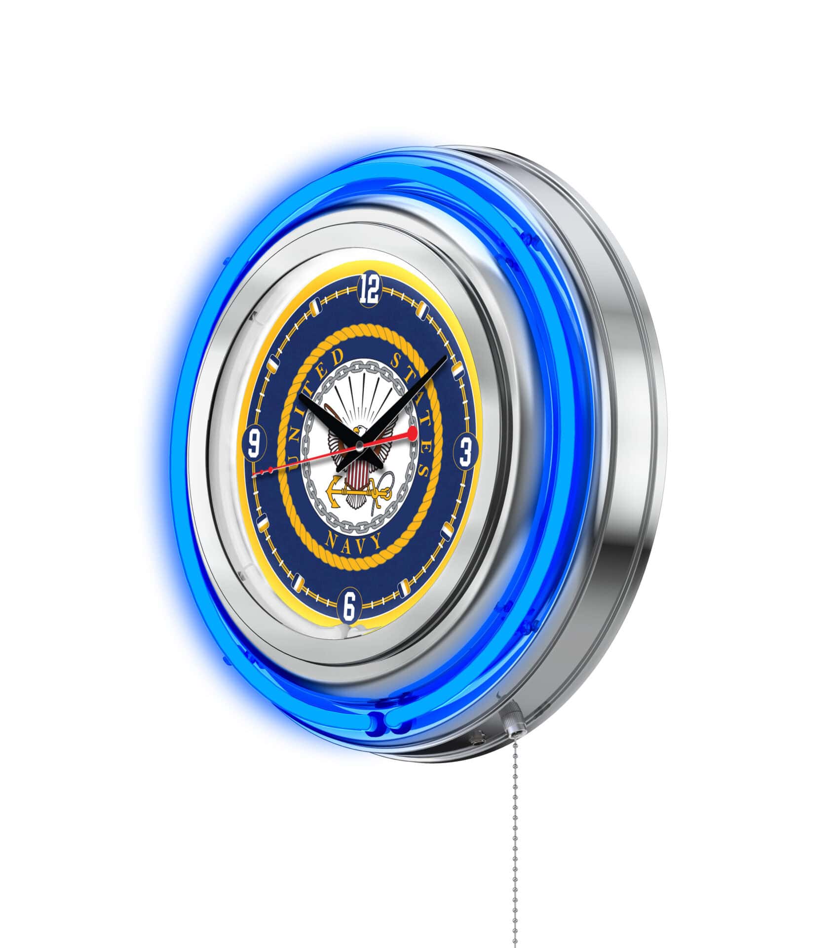 The United States Navy 15-Inch Neon Logo Clock in Chrome is a vibrant and stylish addition to any man cave. This clock features a stunning chrome casing and a color-specific neon outer ring that highlights the custom-printed clock face, illuminated by a brilliant white inner neon ring. With its easy-to-use pull chain for turning the neon lights on and off, this clock combines functionality with a patriotic flair. The accurate quartz movement ensures precise timekeeping, powered by a standard AA battery (not included). Elevate your space while showing support for our troops with this officially licensed clock.