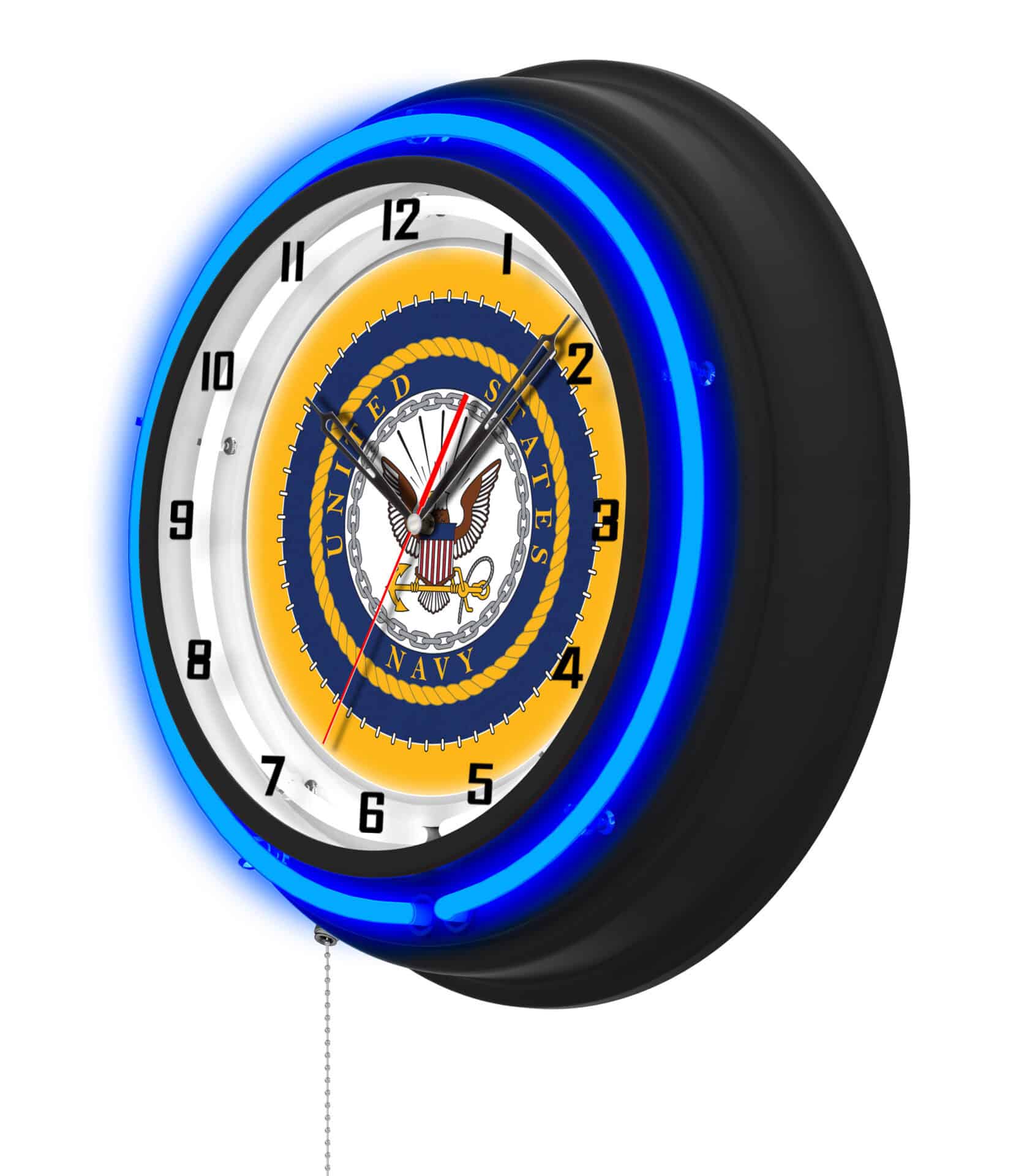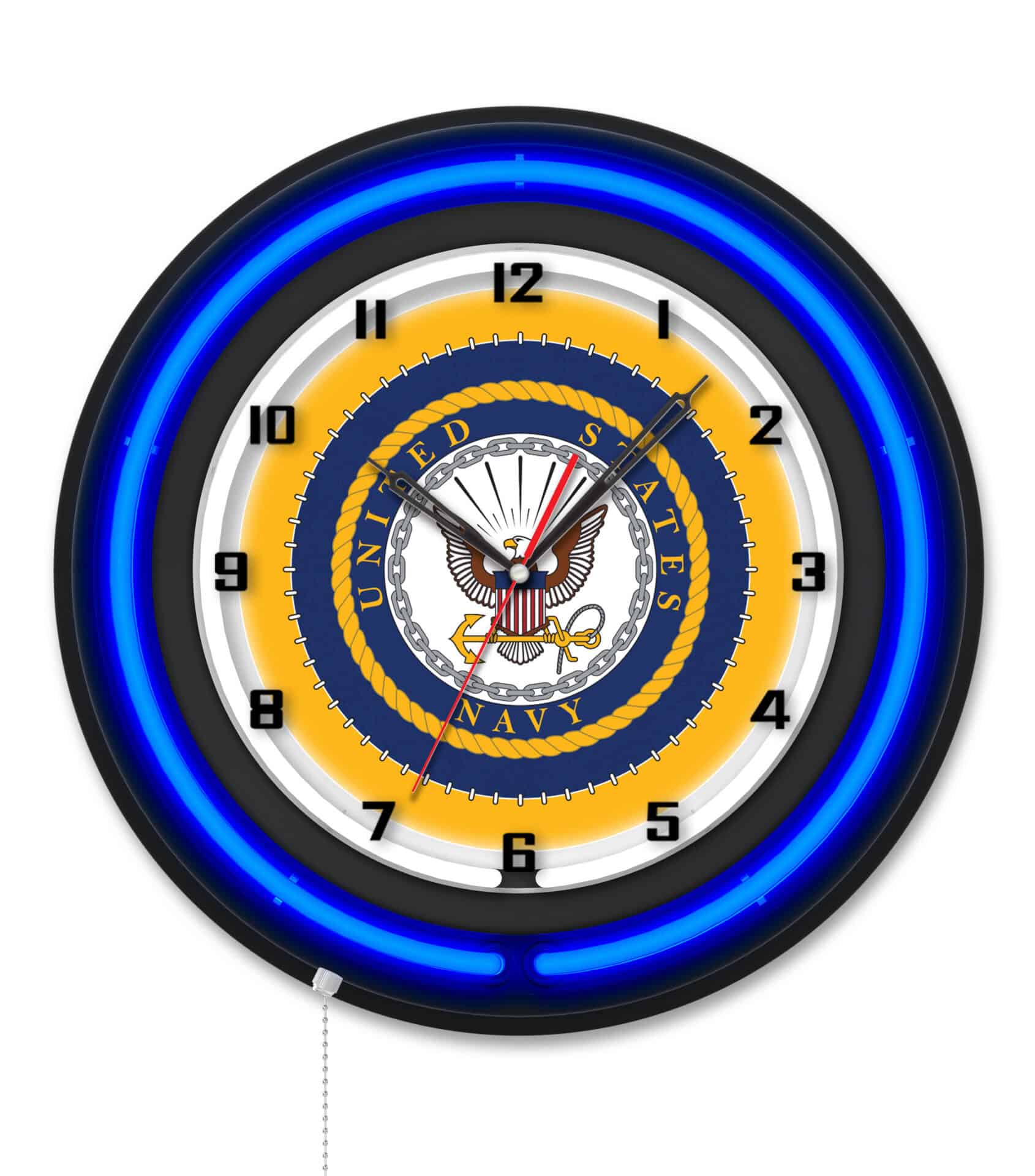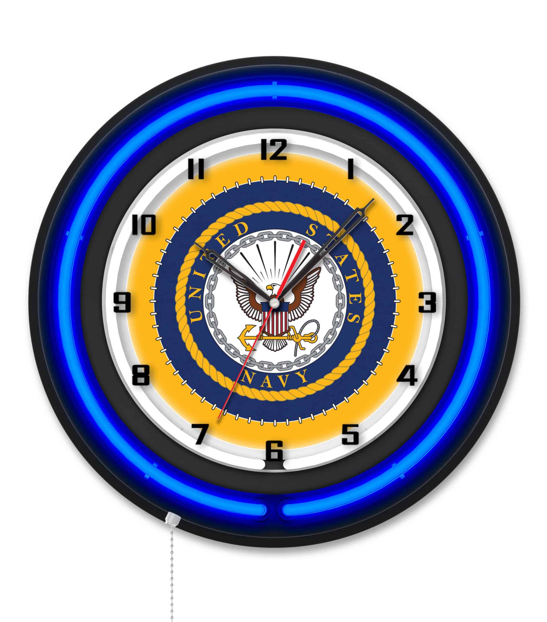 The United States Navy 19-Inch Double Neon Wall Clock in Black is the ultimate decor piece for any space, showcasing your support for our troops with style. Featuring a sleek black casing, this clock comes equipped with vibrant, full-color artwork and neon rings that illuminate the custom printed clock face. The brilliant white inner neon ring ensures that the clock is not only functional but also a stunning visual addition to your man cave.