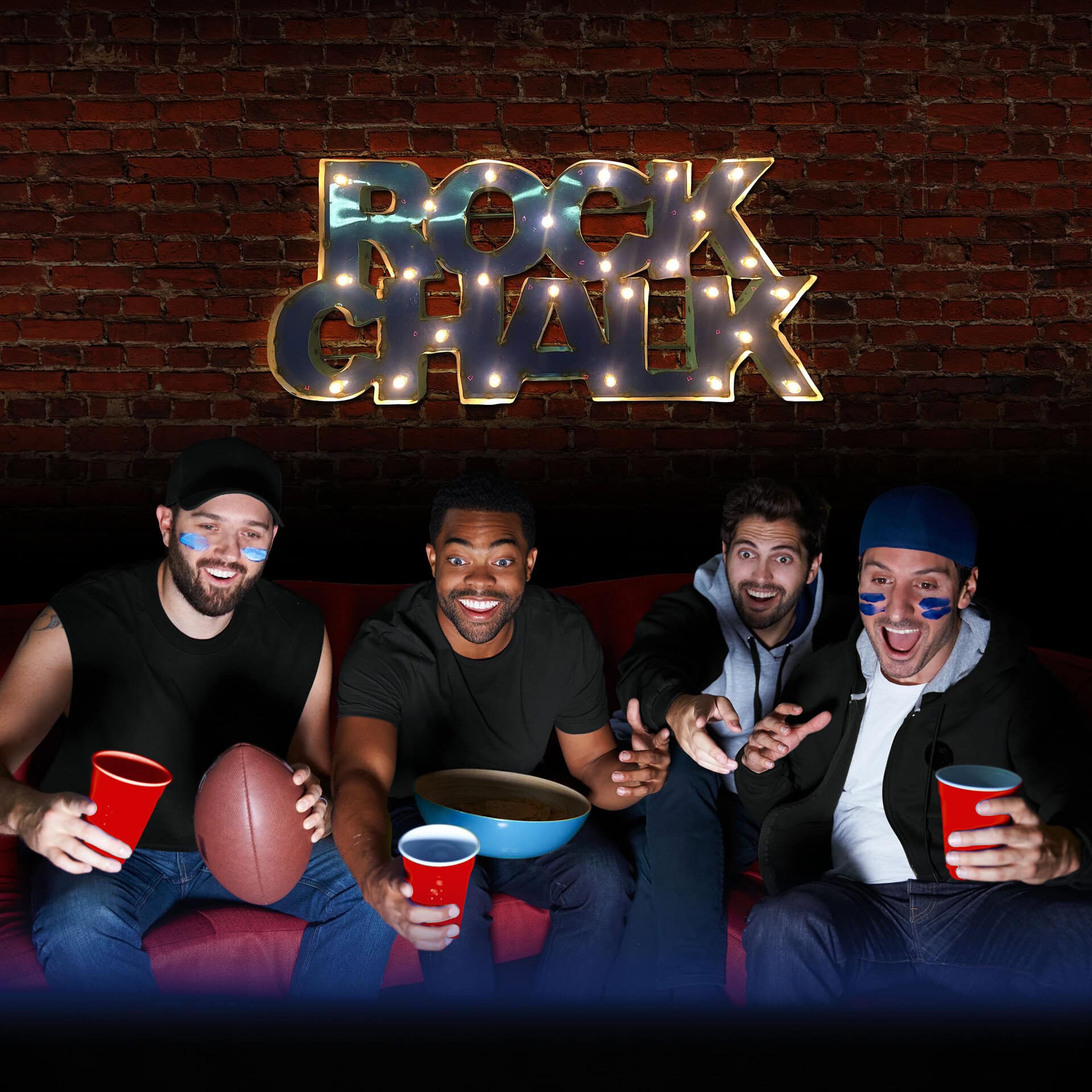 Light up your home or fan cave with this University of Kansas “Rock Chalk” Lighted Recycled Metal Sign! This sign is perfect for showing off your Jayhawks pride. Built by hand from recycled metals, it’s a unique and stylish piece. The included light strands with clear, incandescent C7 glass bulbs add a warm and inviting glow. Display it indoors or outdoors to showcase your team spirit. The authentic style décor features channel lettering and exposed weld spots, giving a cool, retro look to any space. It’s officially licensed, so you know you’re getting the real deal!