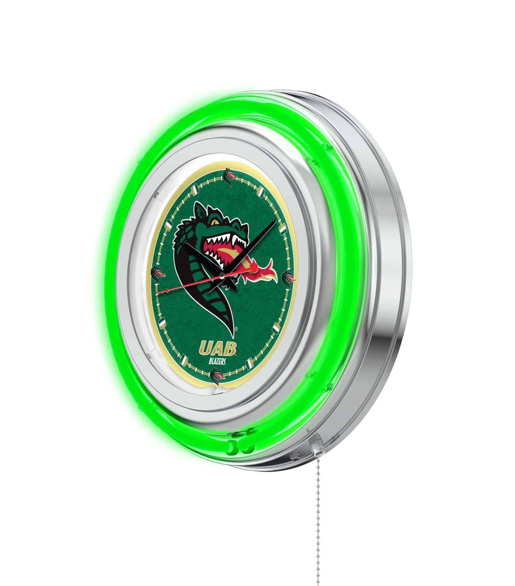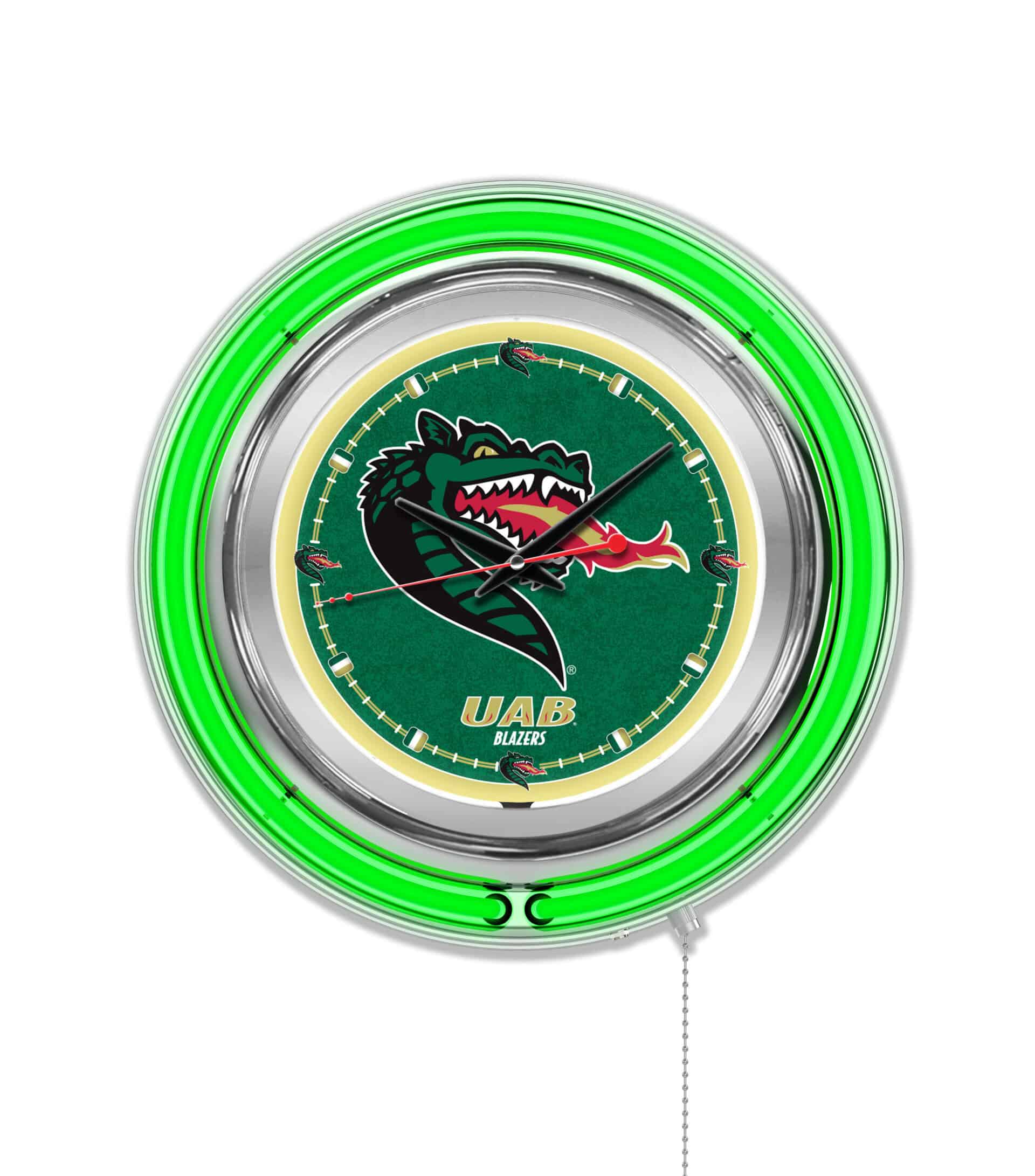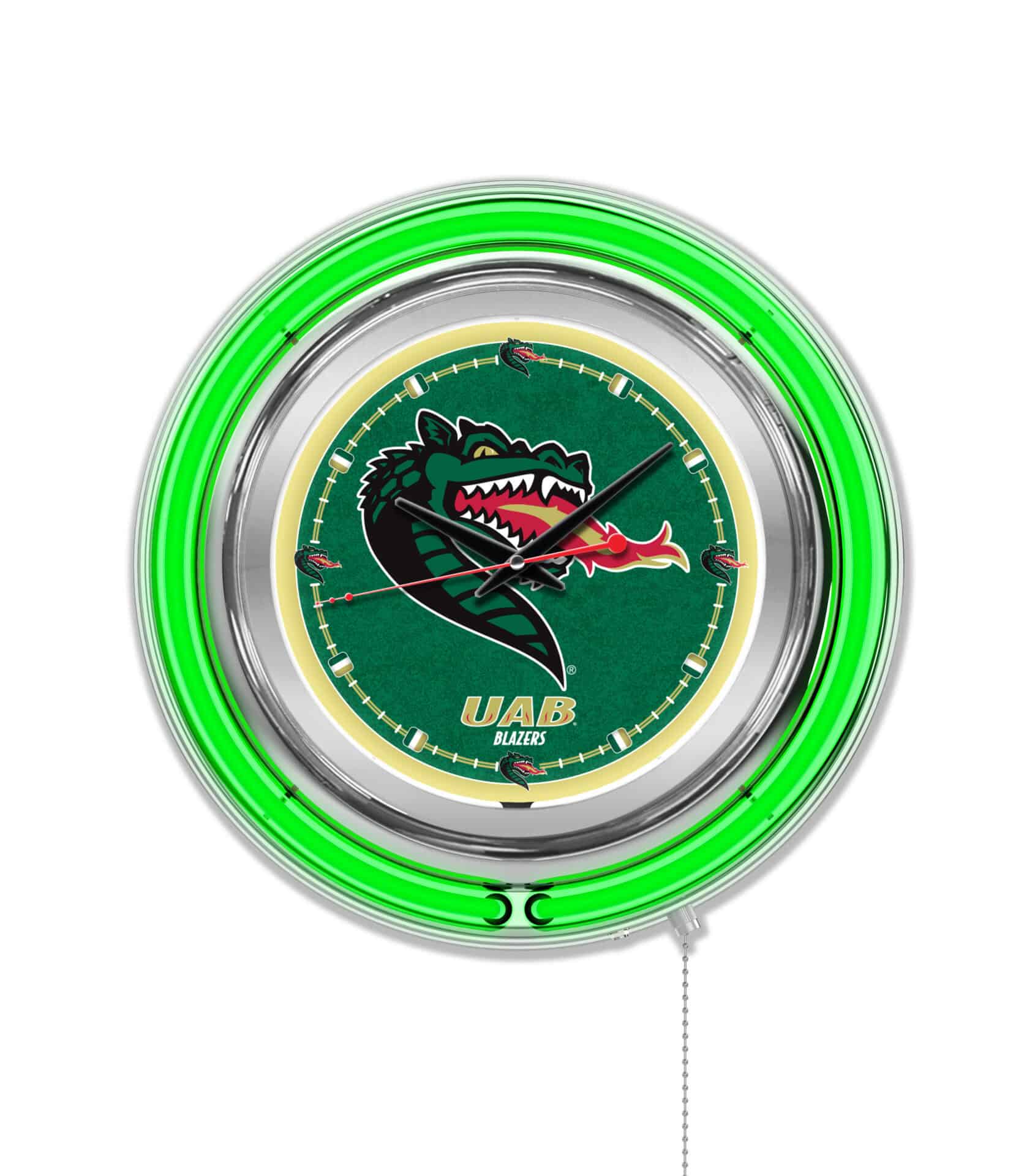 Show your school pride with the University of Alabama at Birmingham 15-Inch Neon Logo Clock in Chrome. This eye-catching clock features a sleek chrome casing and a vibrant neon outer ring in team colors, complemented by a custom-printed clock face illuminated by a brilliant white inner neon ring. The neon rings are easily controlled with a pull chain and powered by a UL-listed transformer, while the accurate quartz movement ensures precise timekeeping. Perfect for grads, sports fans, or as a standout addition to your man cave decor, this clock combines style and functionality.