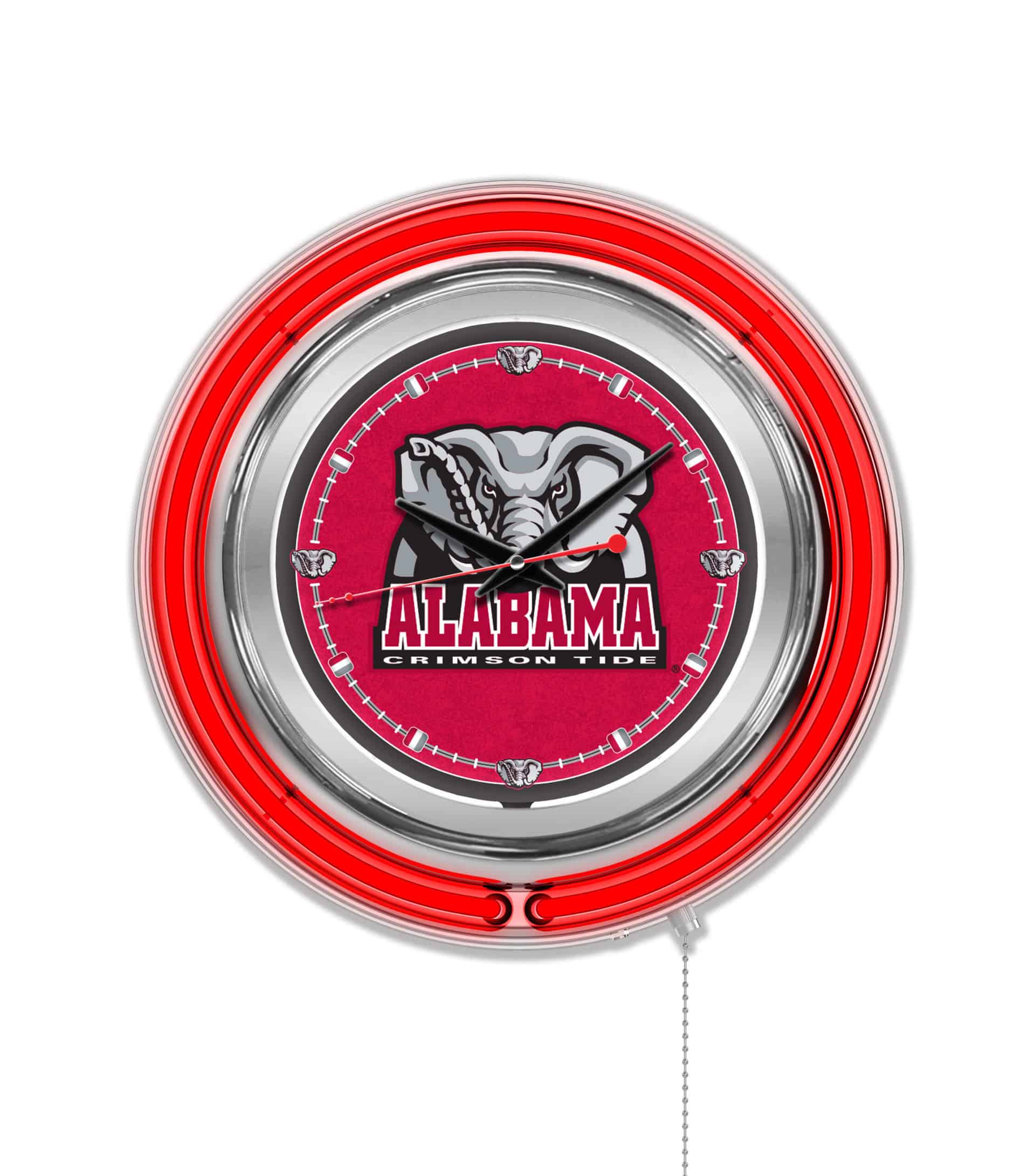 Show your school spirit with the University of Alabama (Elephant) 15-Inch Neon Logo Clock in Chrome. This eye-catching clock combines vibrant team colors with a sleek chrome casing, making it a standout addition to any man cave, game room, or office. The clock features a custom-printed face illuminated by a brilliant white inner neon ring, while the outer neon ring adds a pop of team-specific color. With easy-to-use pull chain controls and accurate quartz movement, this clock is both functional and stylish. Perfect for fans, graduates, or anyone who loves to display their pride in style.