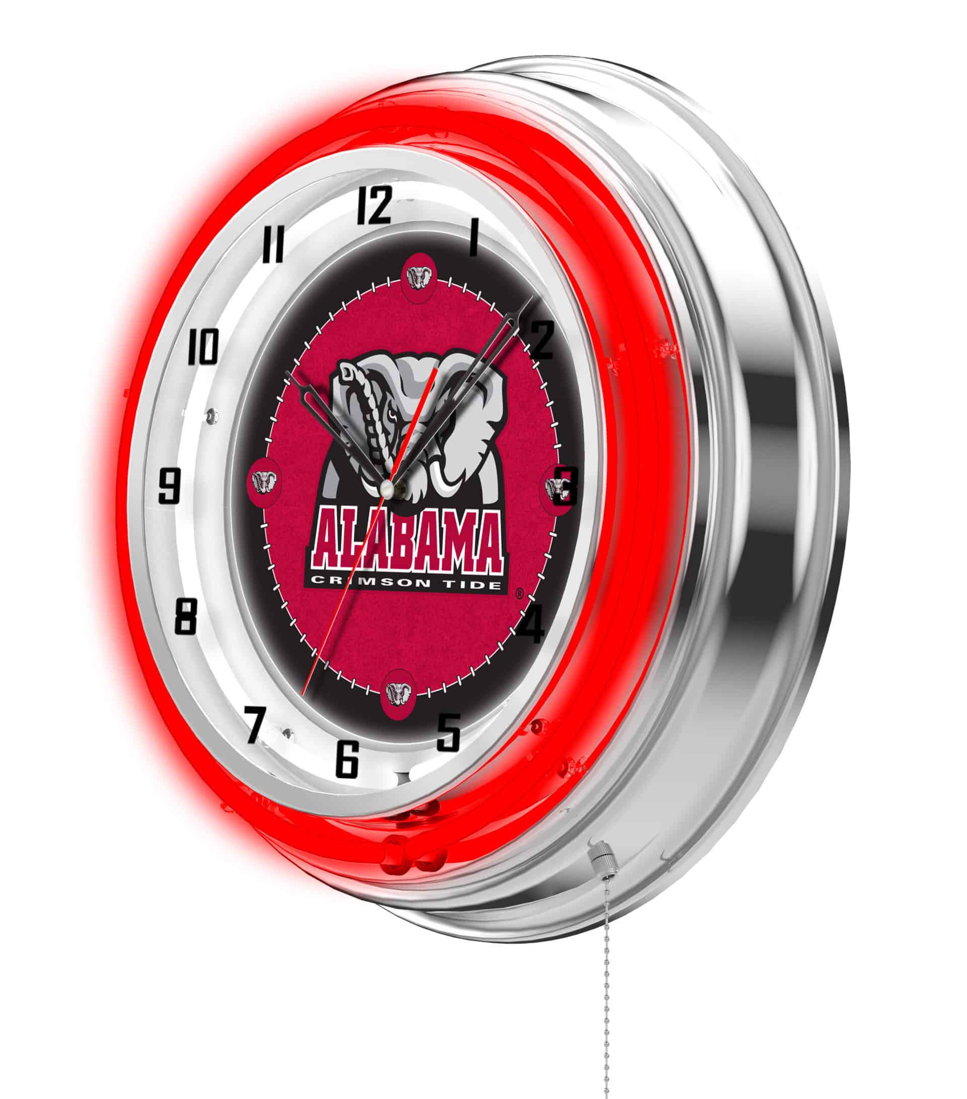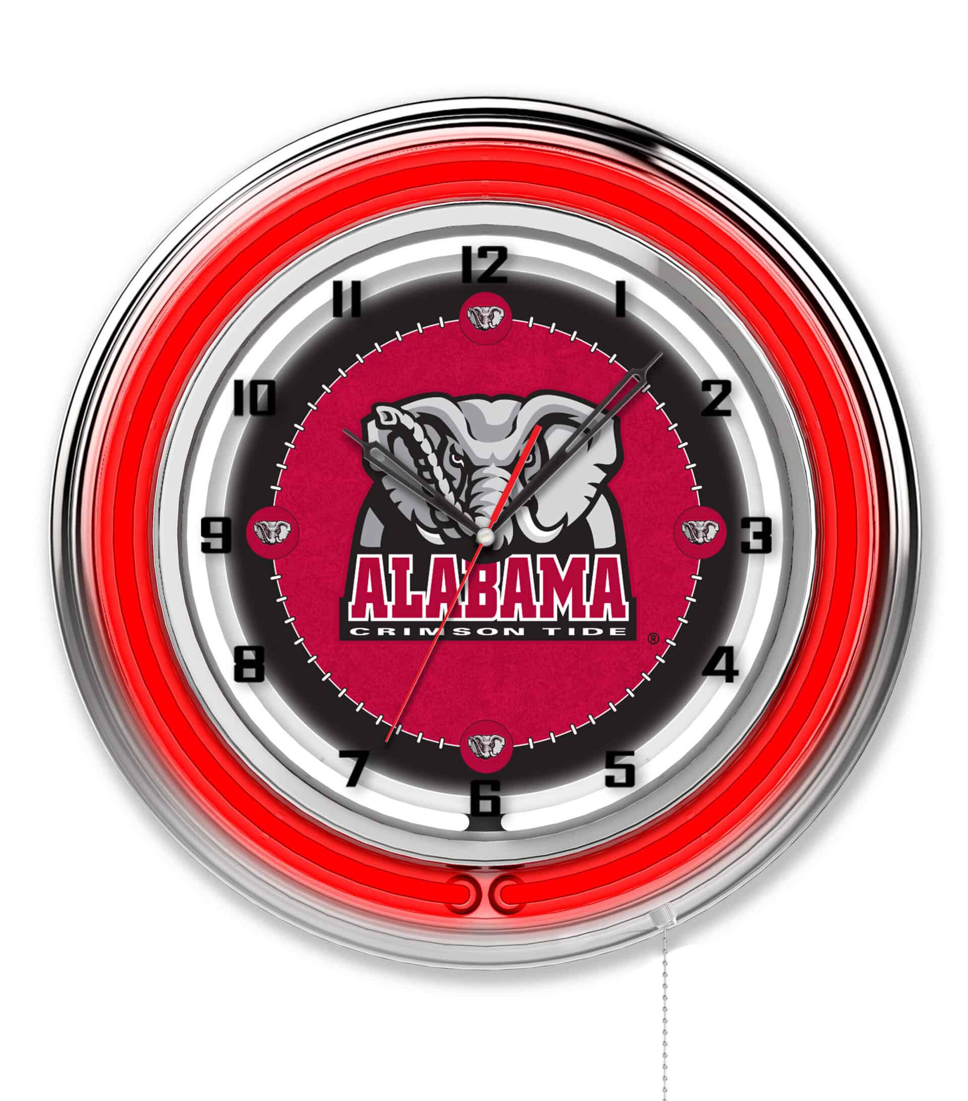 The University of Alabama (Elephant) 19-Inch Neon Logo Clock in Chrome is the ultimate addition to any man cave, showcasing your school pride with style. This clock features a stunning chrome casing and vibrant, full-color artwork that is officially licensed. The double neon tubes provide a captivating glow, with one accent color and a brilliant white inner ring that illuminates the custom printed clock face. The convenient pull chain allows for easy on and off operation, making it a functional yet eye-catching piece of decor.