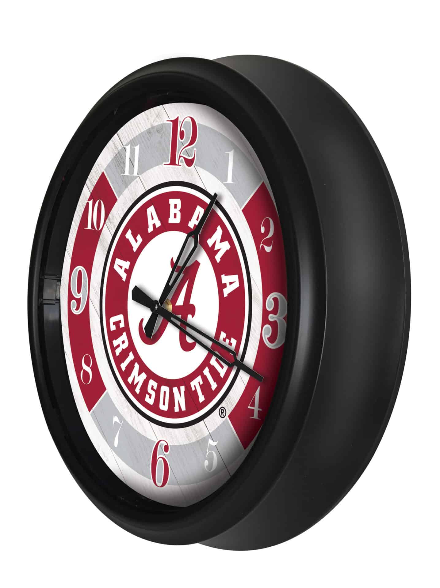 The University of Alabama (Script A) 14-Inch Indoor/Outdoor LED Wall Clock in Black is the perfect addition to any man cave, showcasing your school pride while providing functionality and style. With a durable construction designed for both indoor and outdoor use, this clock is built to withstand the elements. Its vibrant, full-color UV printed artwork ensures that the design remains fade-free and vibrant for years. Equipped with photo eye controlled LED lights, the clock face illuminates automatically in low light, making it easy to read at any time of day or night. Enjoy accurate timekeeping with the reliable quartz movement, all while enhancing your space with a touch of team spirit.