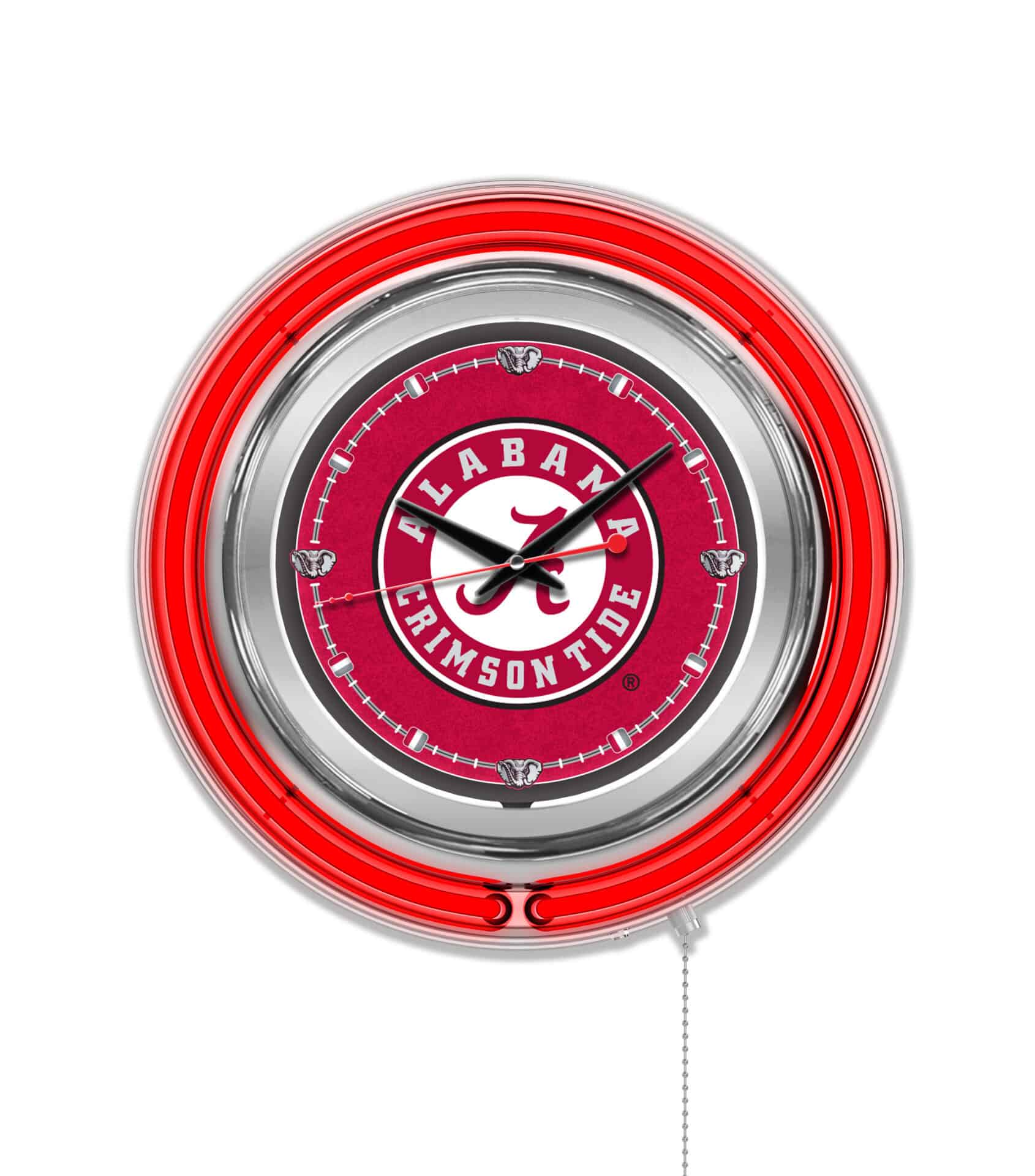 Show off your school spirit with the University of Alabama (Script A) 15-Inch Neon Logo Clock in Chrome. This eye-catching clock combines vibrant team colors with a sleek chrome casing, making it a standout piece for any man cave or fan space. The clock features a custom-printed face illuminated by a brilliant white inner neon ring, while an outer neon ring in team-specific colors adds a bold accent. Powered by a UL-listed transformer and equipped with accurate quartz movement, this clock is both functional and stylish. Perfect for graduates, sports enthusiasts, or anyone looking to add a touch of team pride to their decor.